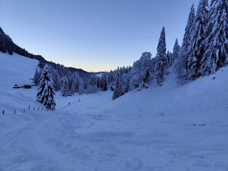Im Schatten hat es viel Pulver auf guten Unterlage, die unten etwas knapp wird aber noch ausreicht. Ab der Torberglücke zum Teil gedeckelt, Schlüsselstelle etwas unangenehm hart, ansonsten auch fahrbar. Alles in Allem besser als gedacht und schön winterliche Verhältnisse. Wurde spätenstens heute ziemlich verfahren aber hat noch Platz für die eine oder andere Spur.