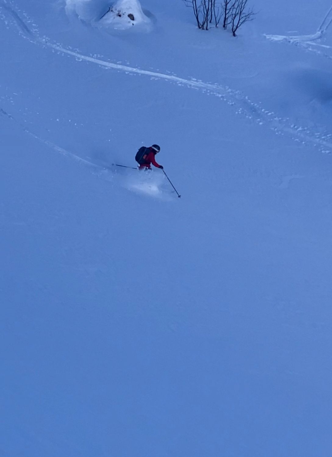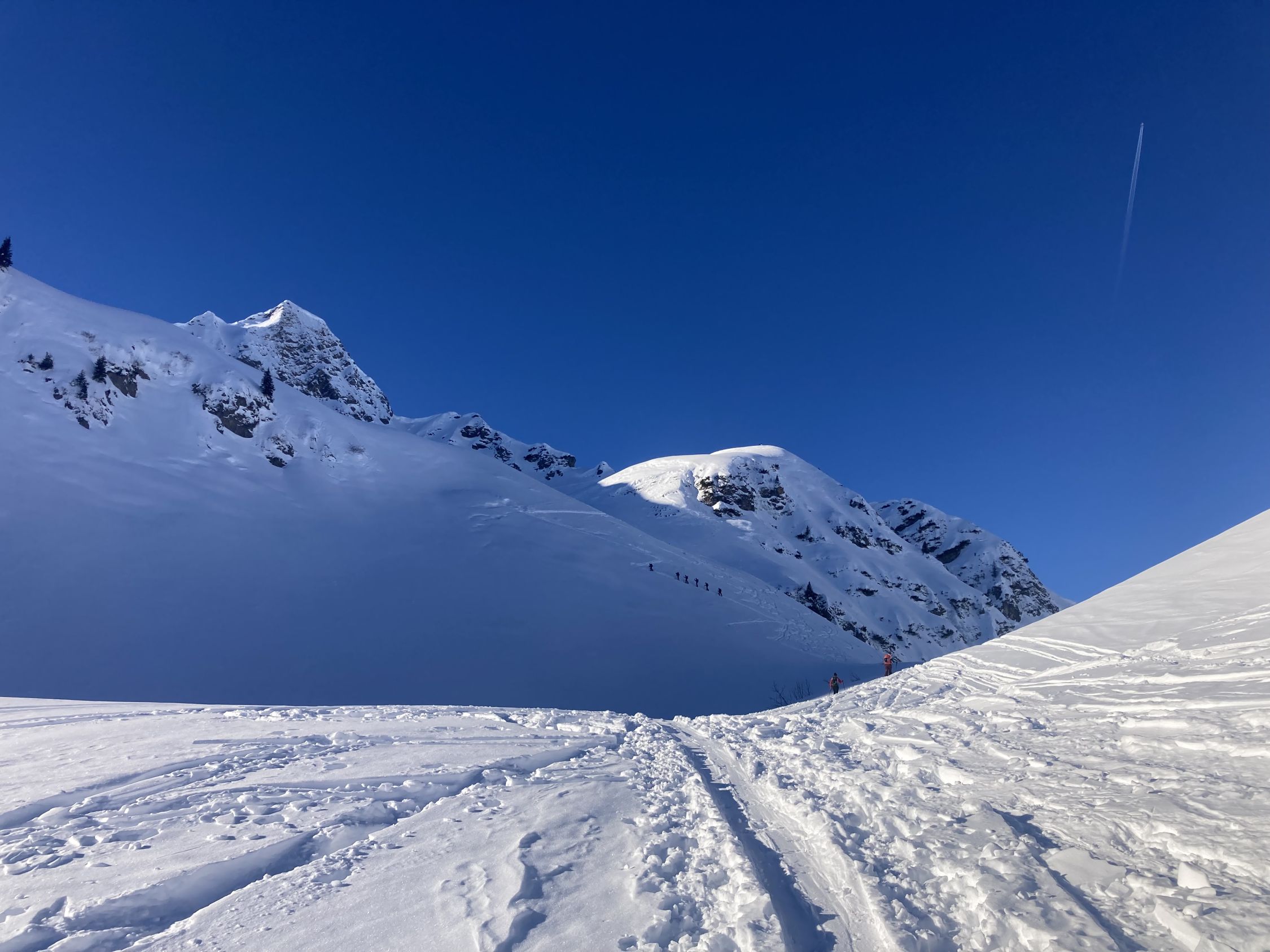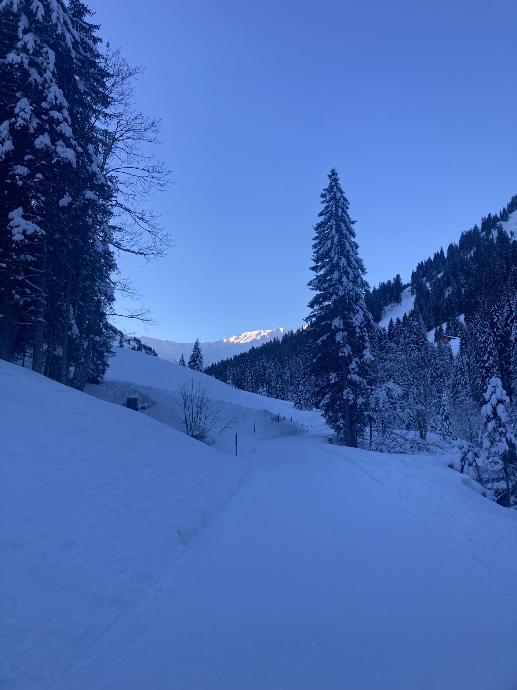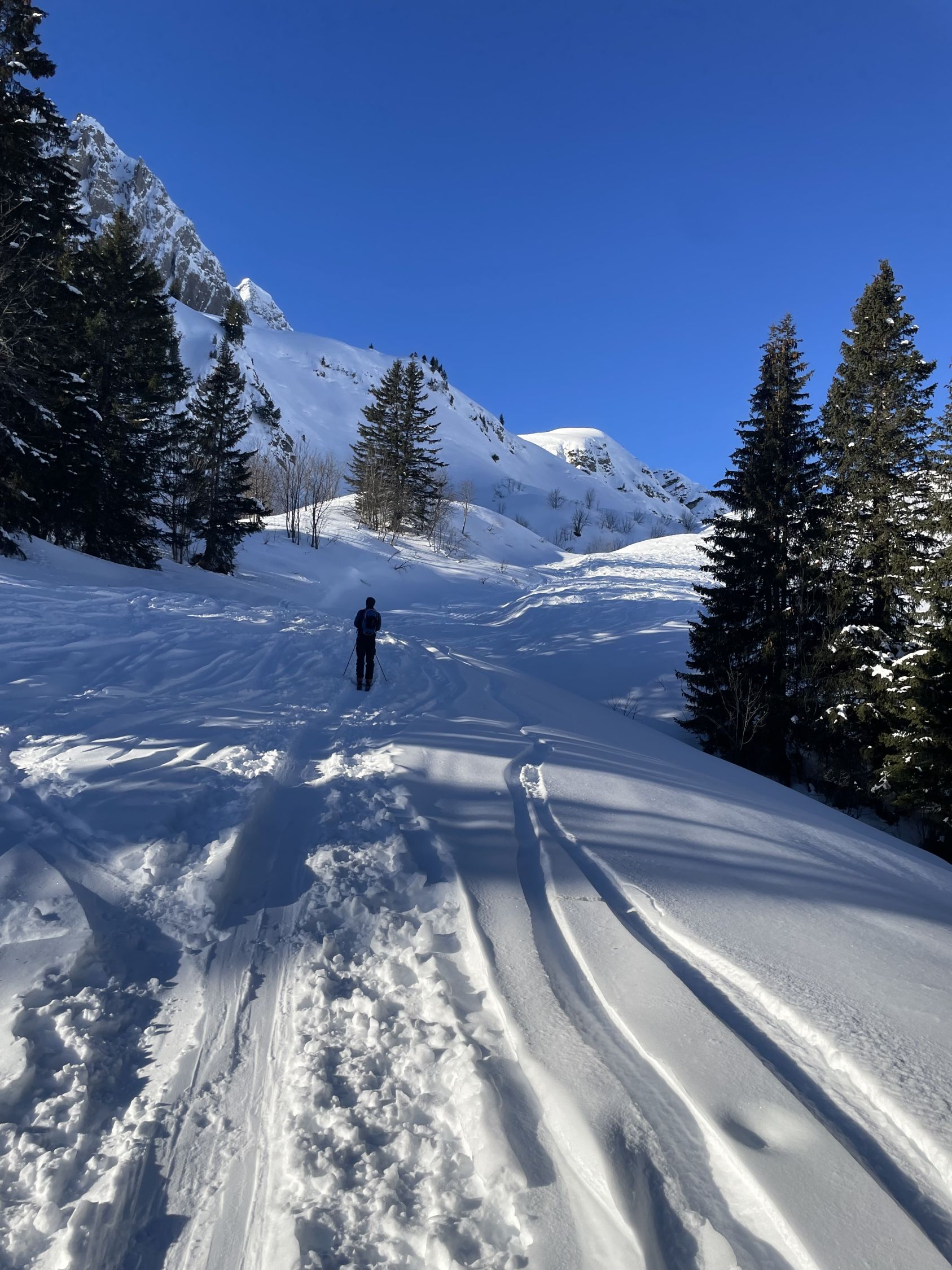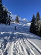 Start heute morgen bei eisigen Temperaturen. Entsprechend blüht überall der Oberflächenreif. Weg durch Bärgünttal gut zu gehen und endlich mal nicht gestreut… Aufschwung durch den Wald hoch dann alles zerfahren und Aufstiegsspur teilweise bereits etwas rutschig aber noch gut zu gehen. Oben dann im weitläufigen Gelände wechselnde Schneequalität. Teilweise Winpress oder Windharschdeckel. Oft aber gut zu fahrender Plattenpulver und in den windgeschützten Hängen noch guter gesetzter und sehr schön zu fahrender Pulver. Haupabfahrt ist ziemlich zerballert. Aber wer etwas nach rechts und links schaut, findet noch Platz für eigene Spuren.