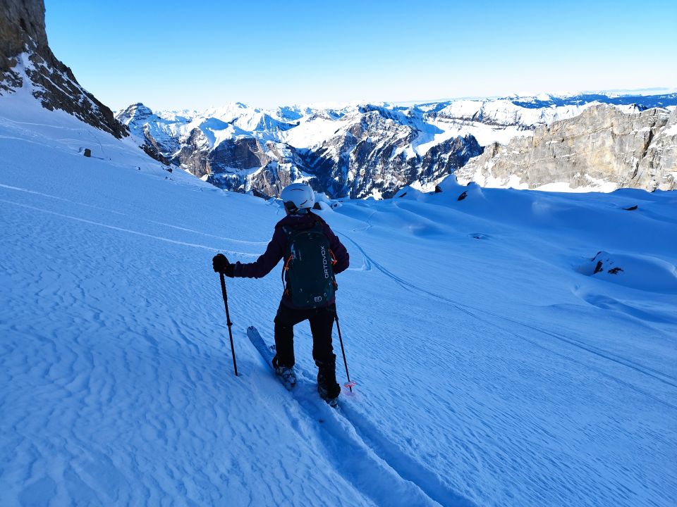 Schöne Pulver im Melchsee-Frutt aber hartes Schnee am Südhang auf der Aufstieg. Das Schnee am Gipfelhang war eher windgepresst und teilweise hart, aber wir konnten mit sen Skiern auf den Gipfel laufen.
