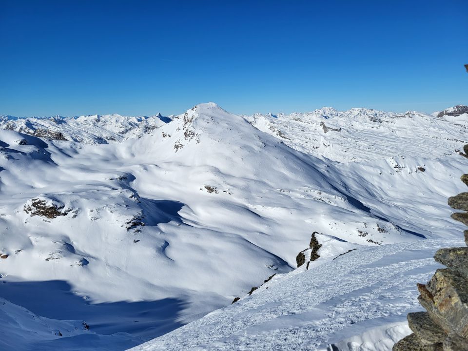 Start bei -9° in Hinterrhein. Sonne ab ca. 1850, hier dann angenehm warm. Oberhalb der Alpe eisiger Wind. Gute Fernsicht. Der Osthang am Fanellhorn ist etwas abgeblasen.
