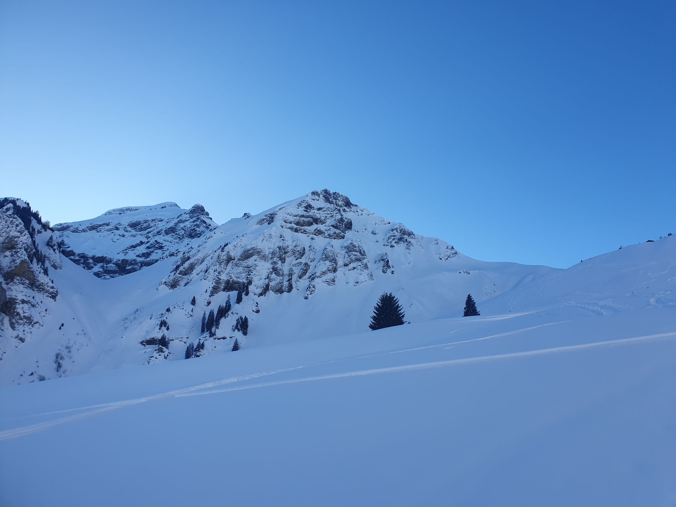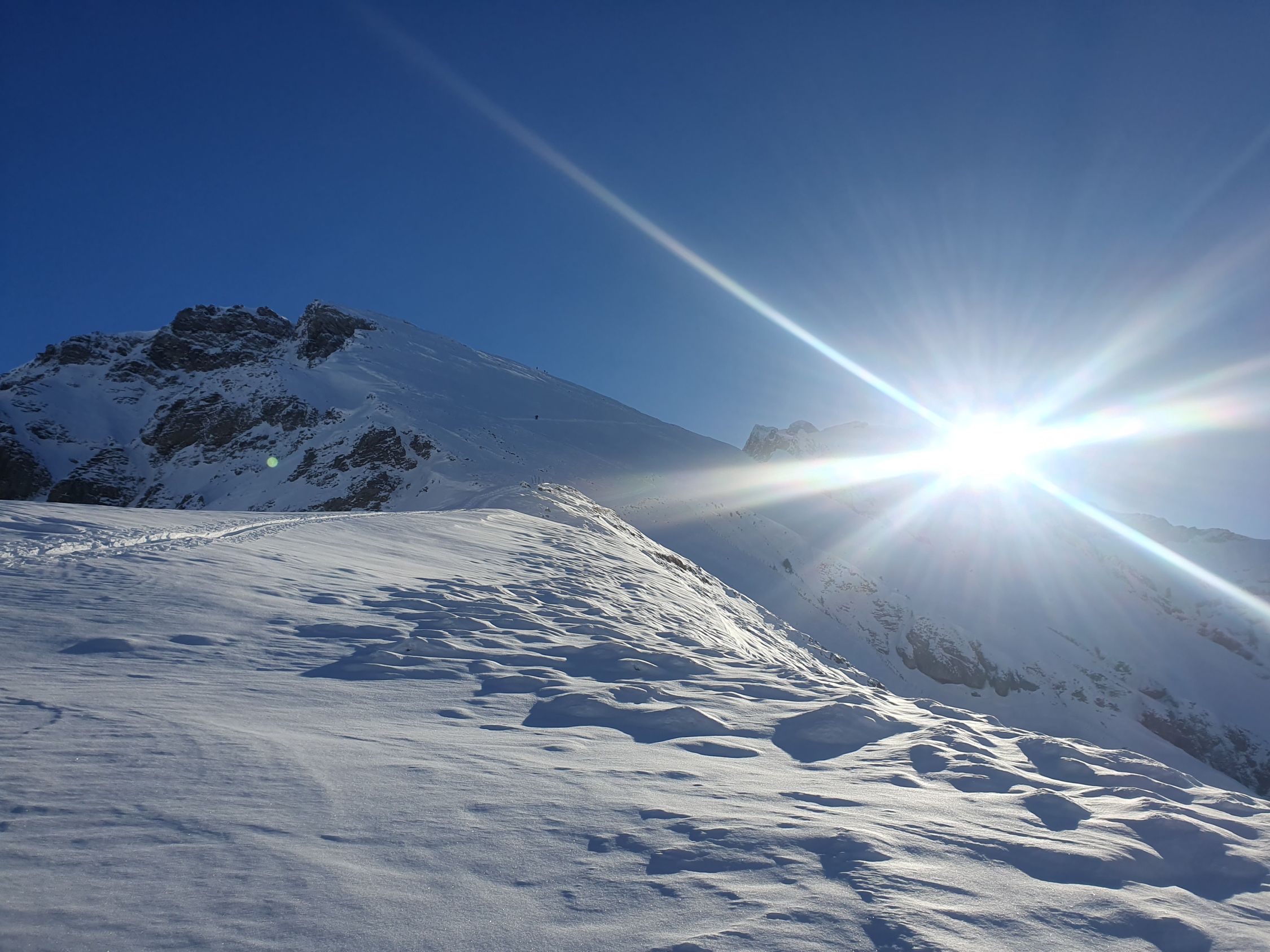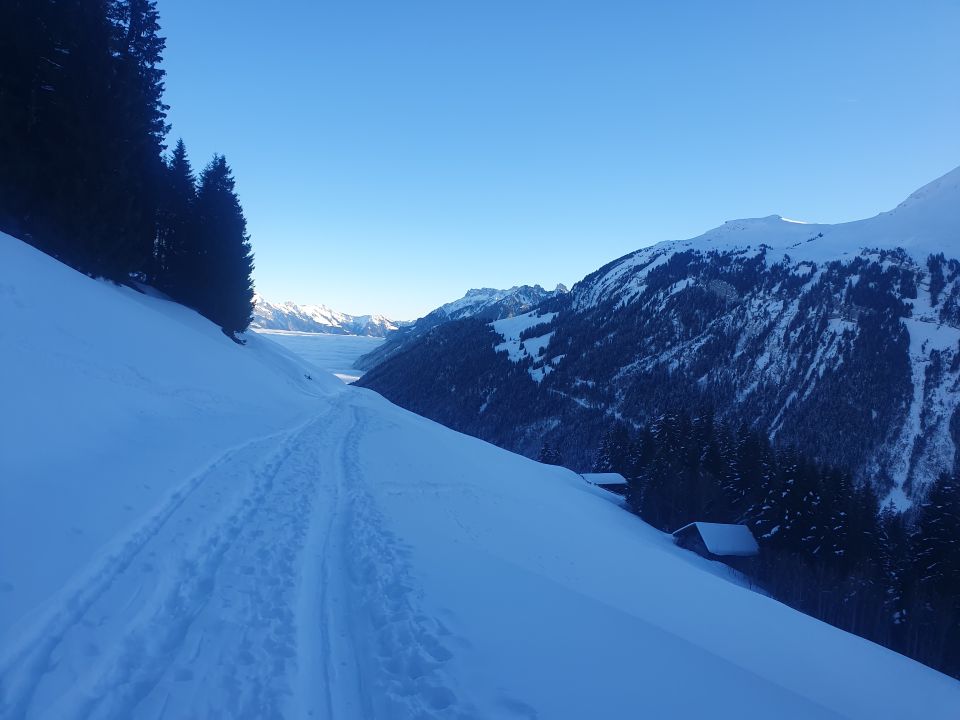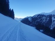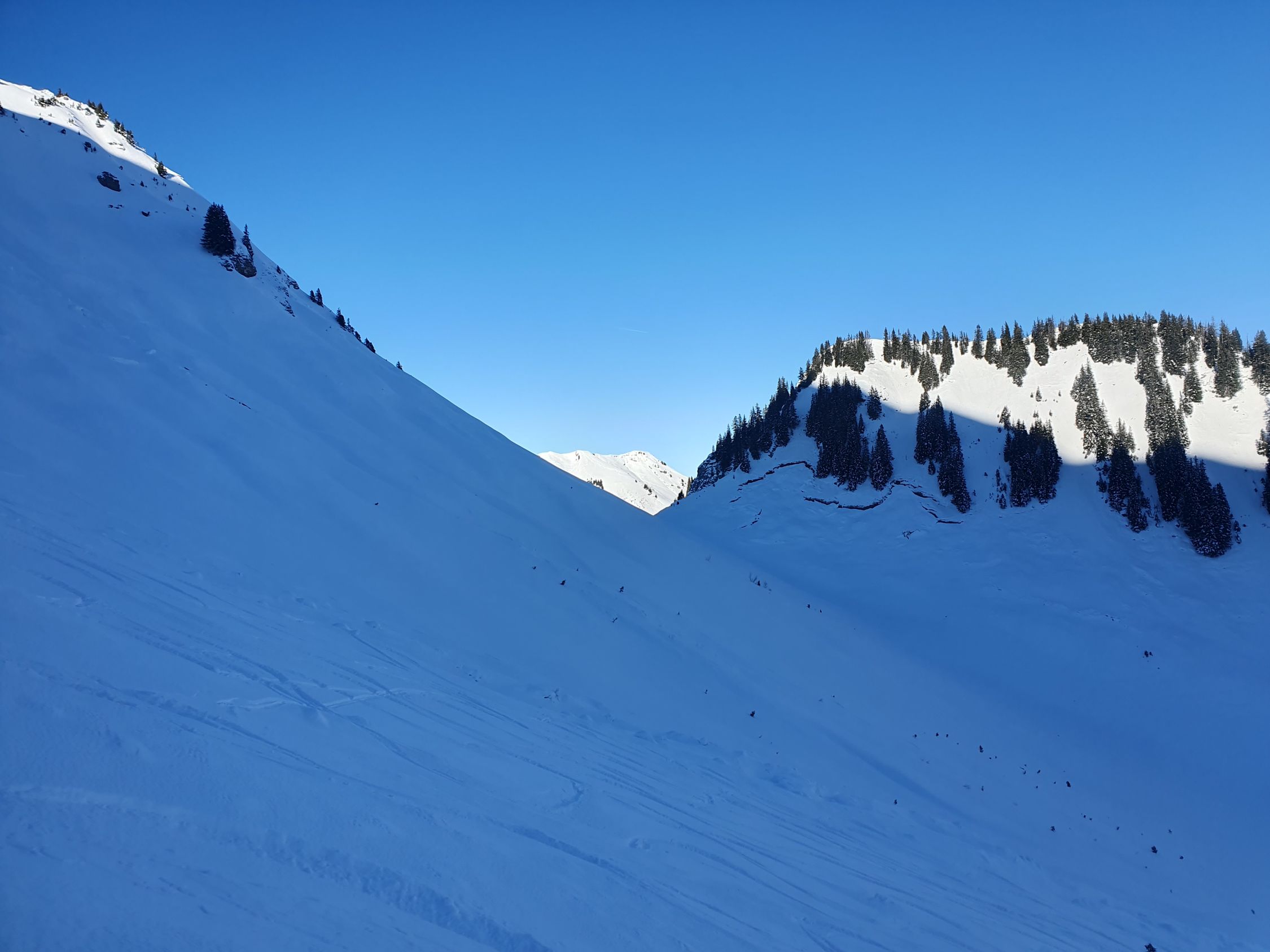 Kalt Pulverschnee gut Aifstiegsspur etwas rutschig Harscheisen sind empfohlen