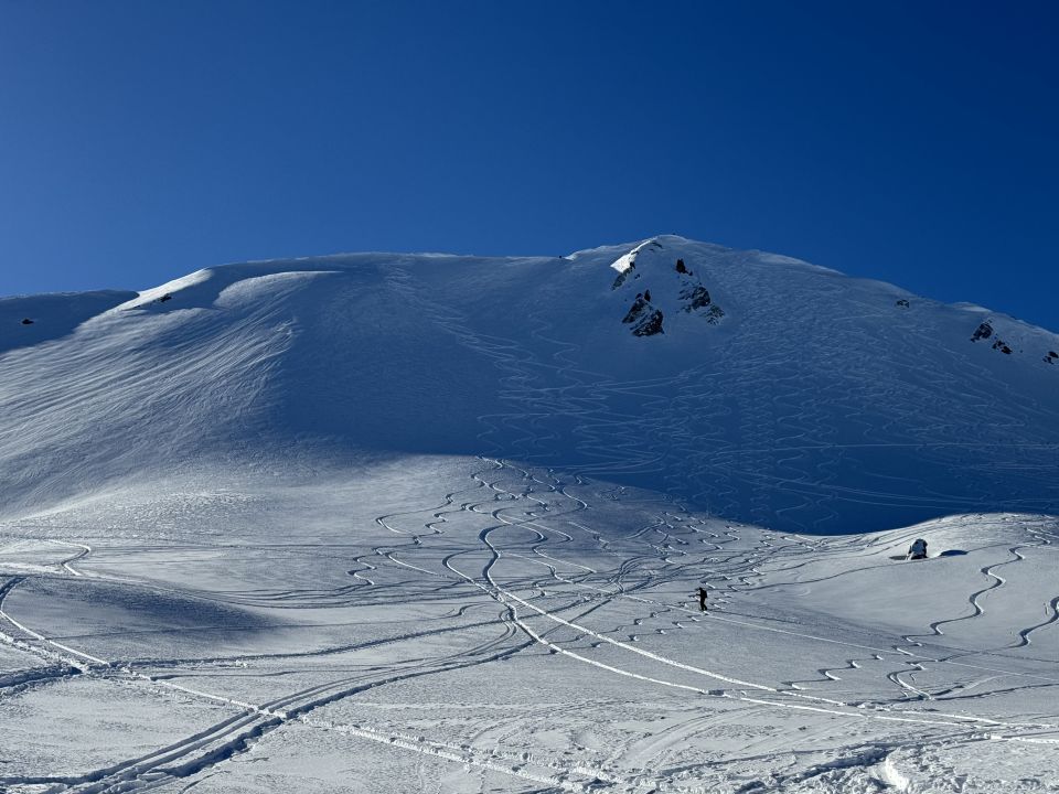 Wunderschöner Pulverschnee auf dem Gipfelhang des Wissmeilen und noch reichlich Raum für die eigene Line. Im weiteren Verlauf der Abfahrt häufig Deckel, teilweise auch dickere.