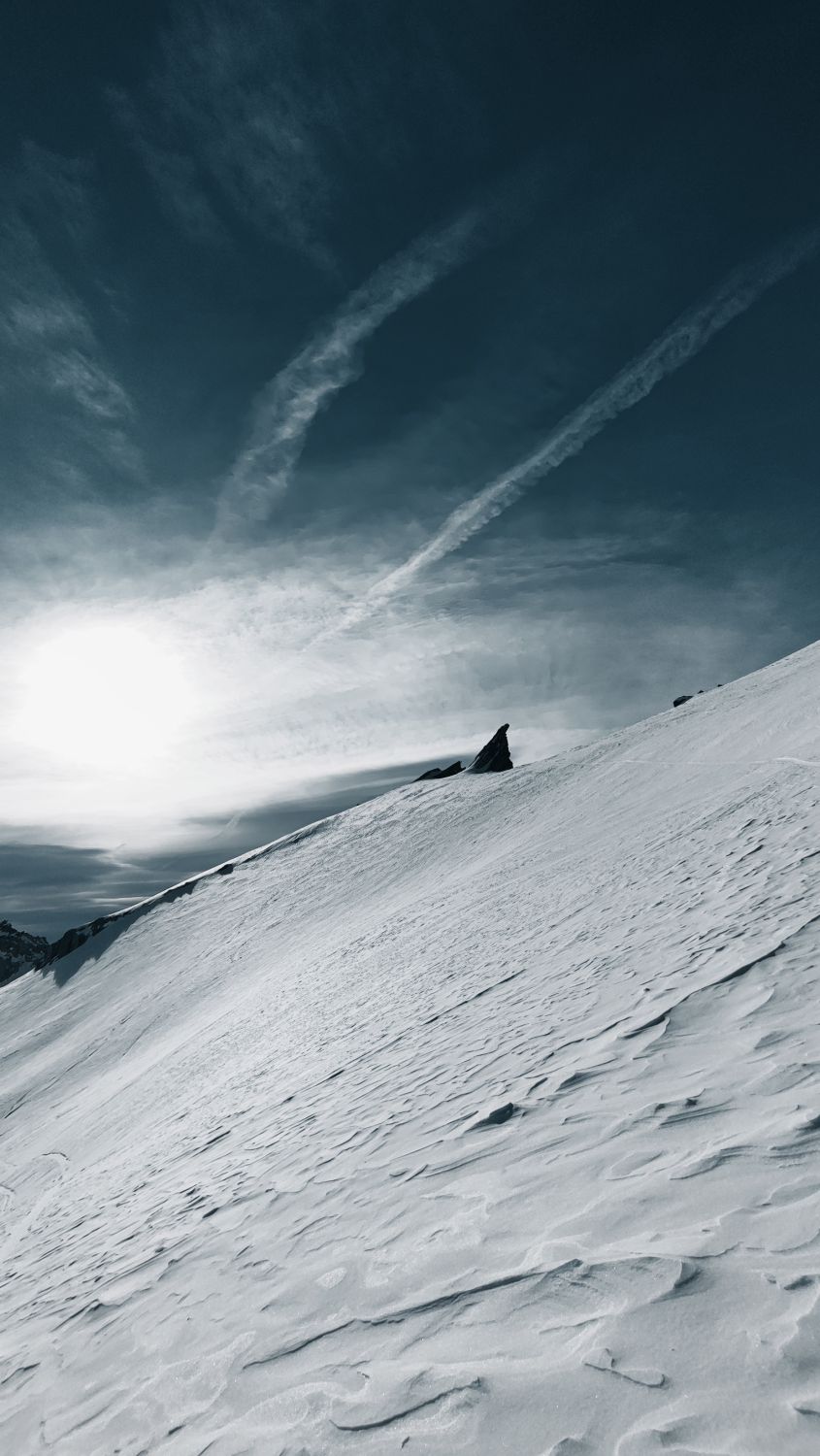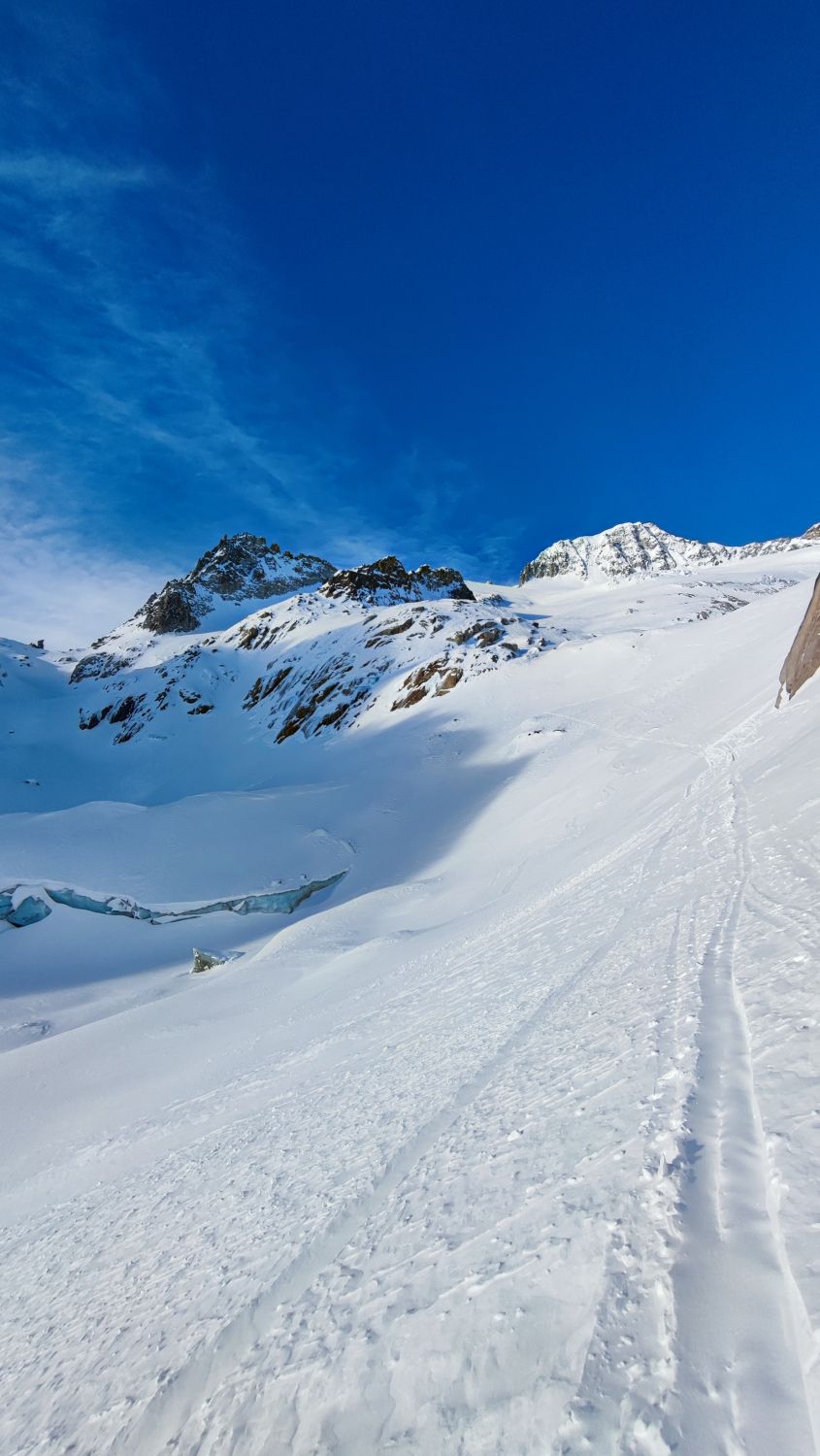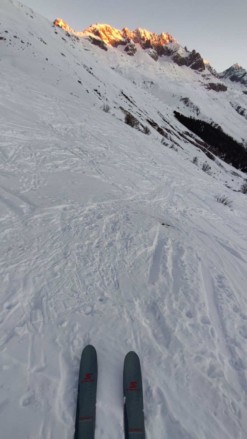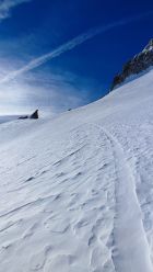 Aufstiegsspur bis Abzweigung Chli Bielenhorn vorhanden, anschl. hies es 800hm Anspuren. Ging aber erstaunlich gut, ca.20cm Pulver auf nicht allzuharter Unterlage. Abfahrt leider nur die obersten hm Presspulver, danach Deckel, Windbearbeitet, nur schlecht fahrbar.