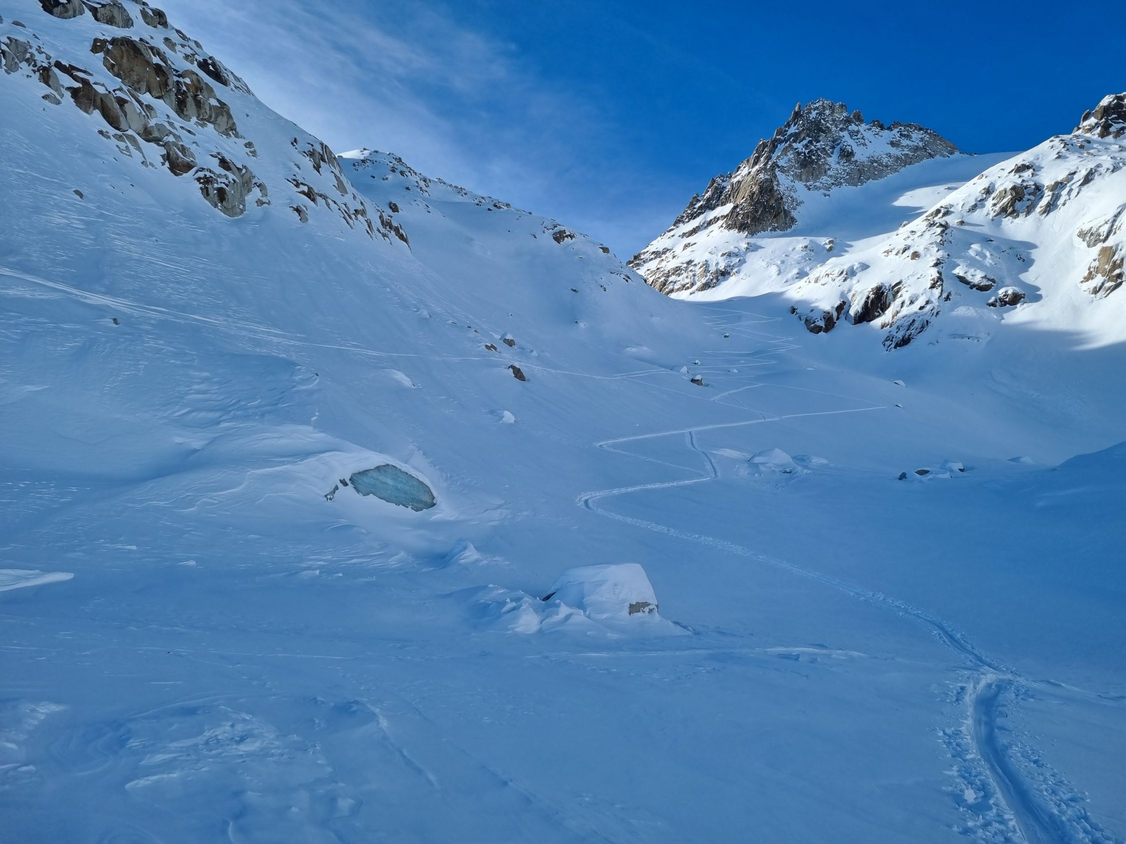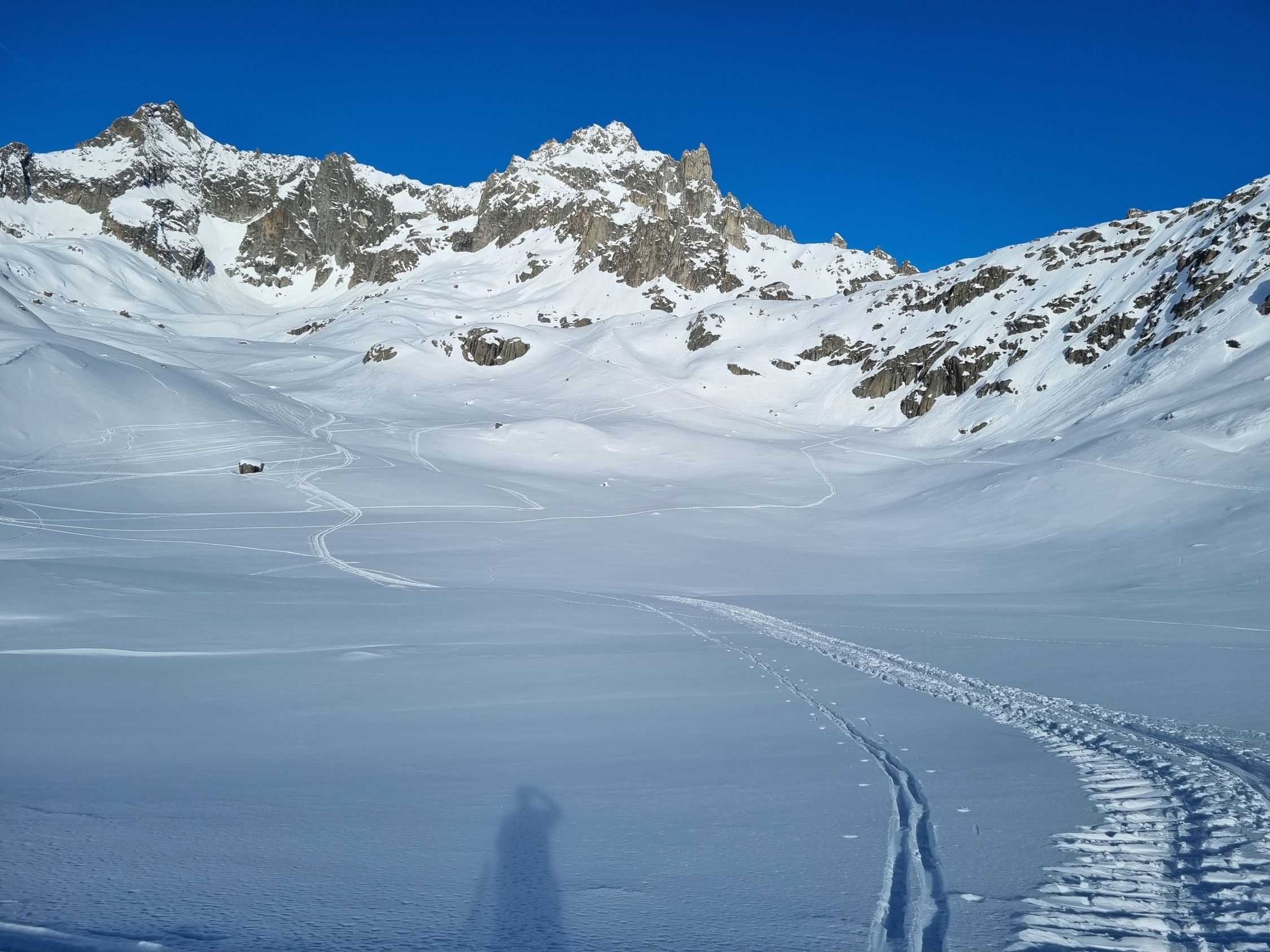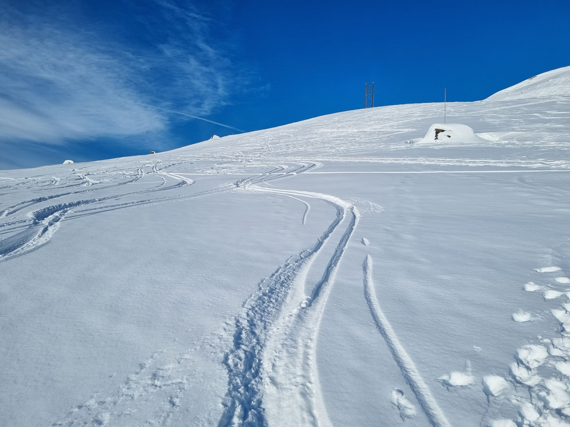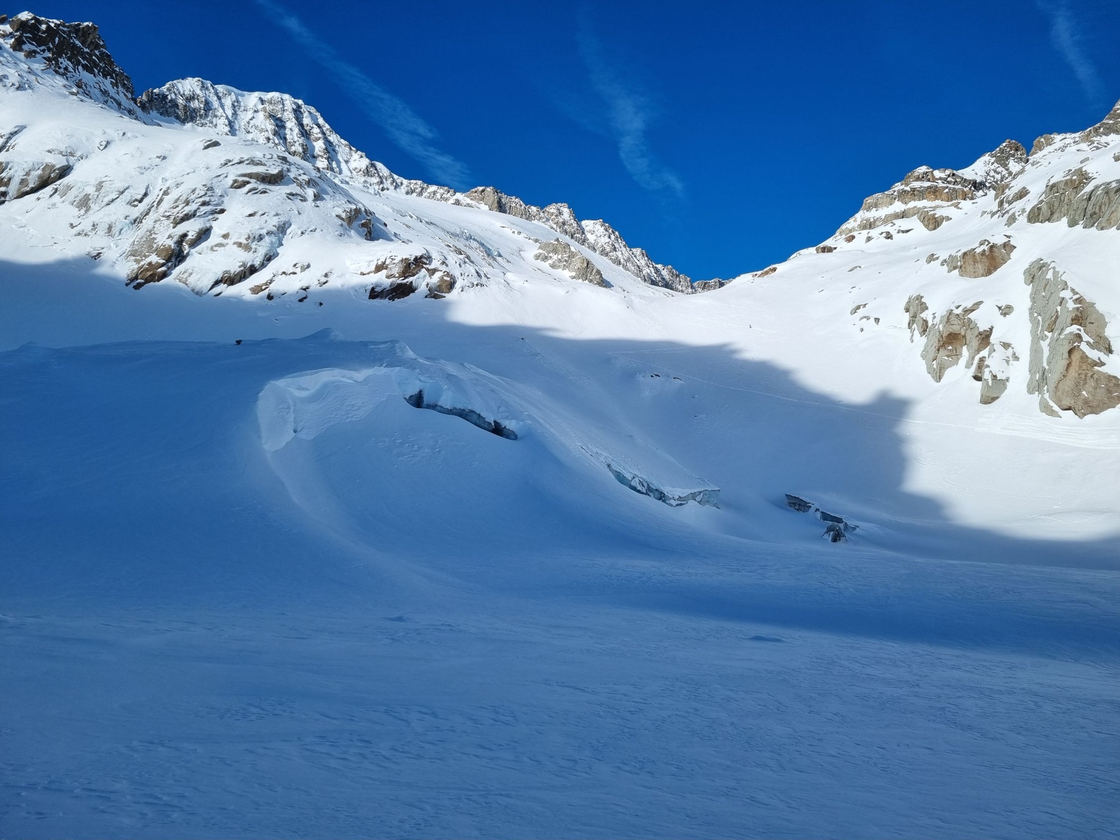 Alles gut eingeschneit und umfassend gespurt. Die Abfahrt war anstrengend Oben stark windgepresst unten schwer. Ein einsamer Skitourer war auch Richtung Galenstock unterwegs. Ganz nach oben hat er es aber wohl nicht geschafft (um 12:00 Uhr auf halber Höhe des Tiefengletscher).