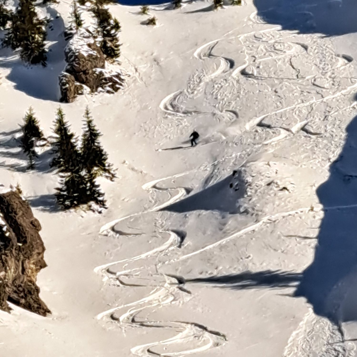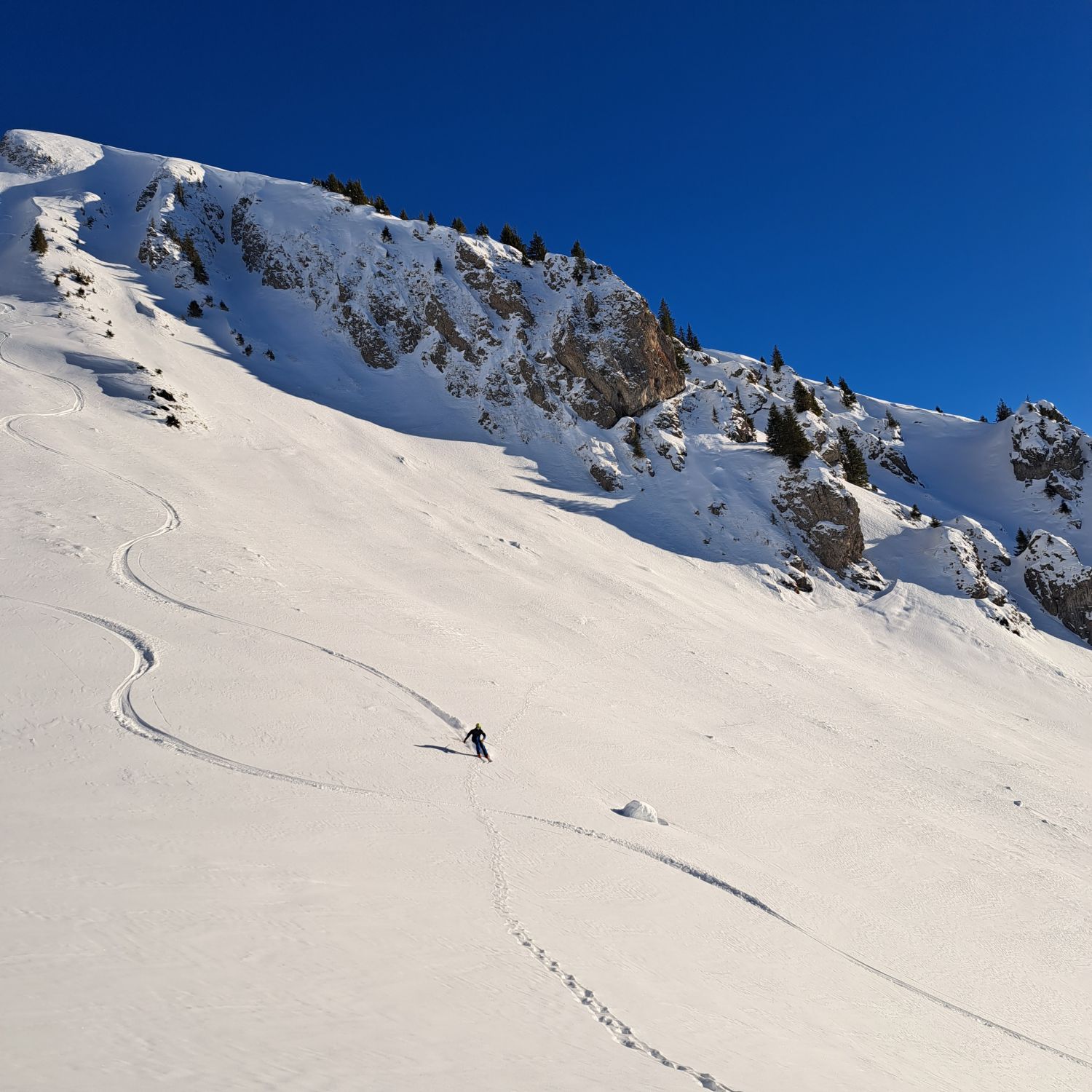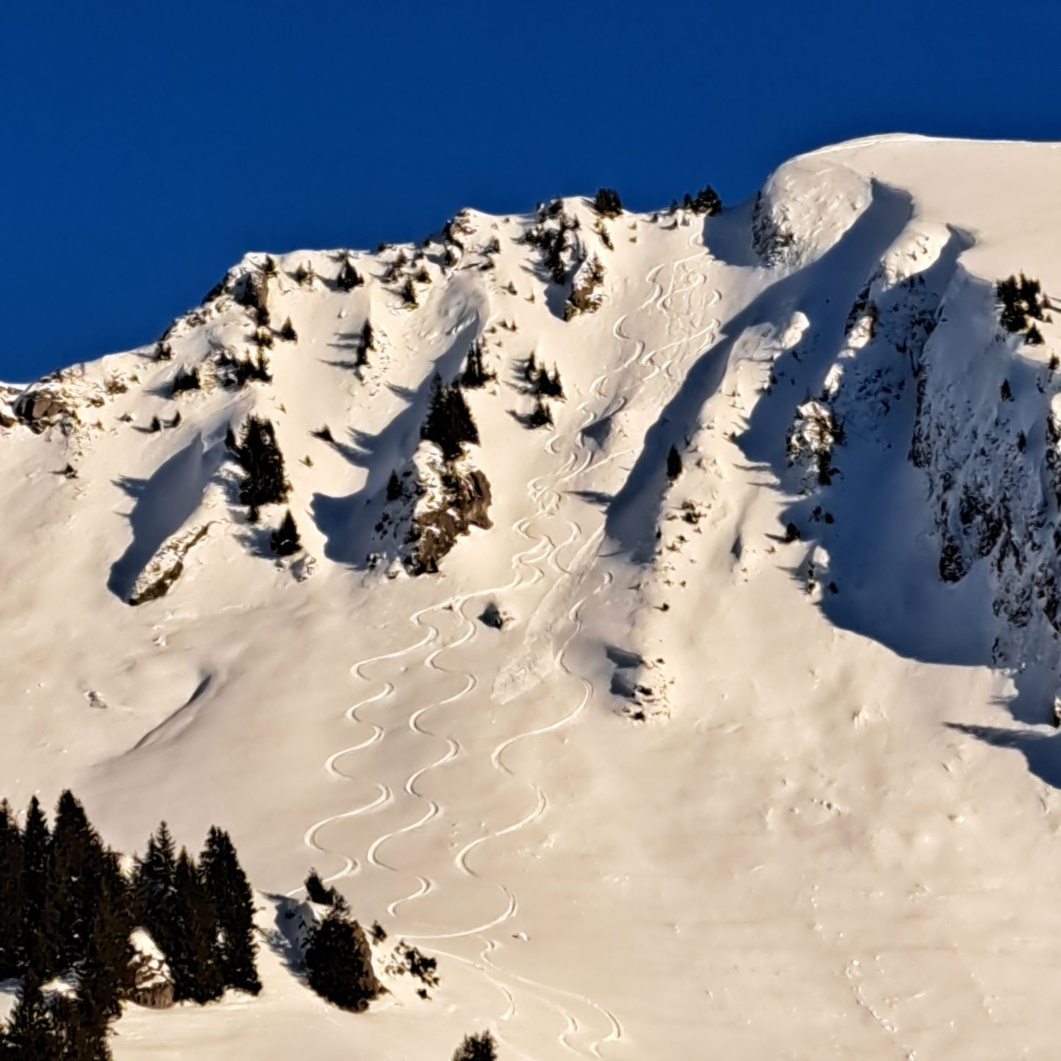 Stufe Culieinfahrt fahrbar,Culi super Pulver auf hart-top.etwas Sluff Einfahrt..Resthänge bis fast unten top,letzde 100 hm. kein Untergrund,Graskontakt.Strasse retour Parkplatz gut.