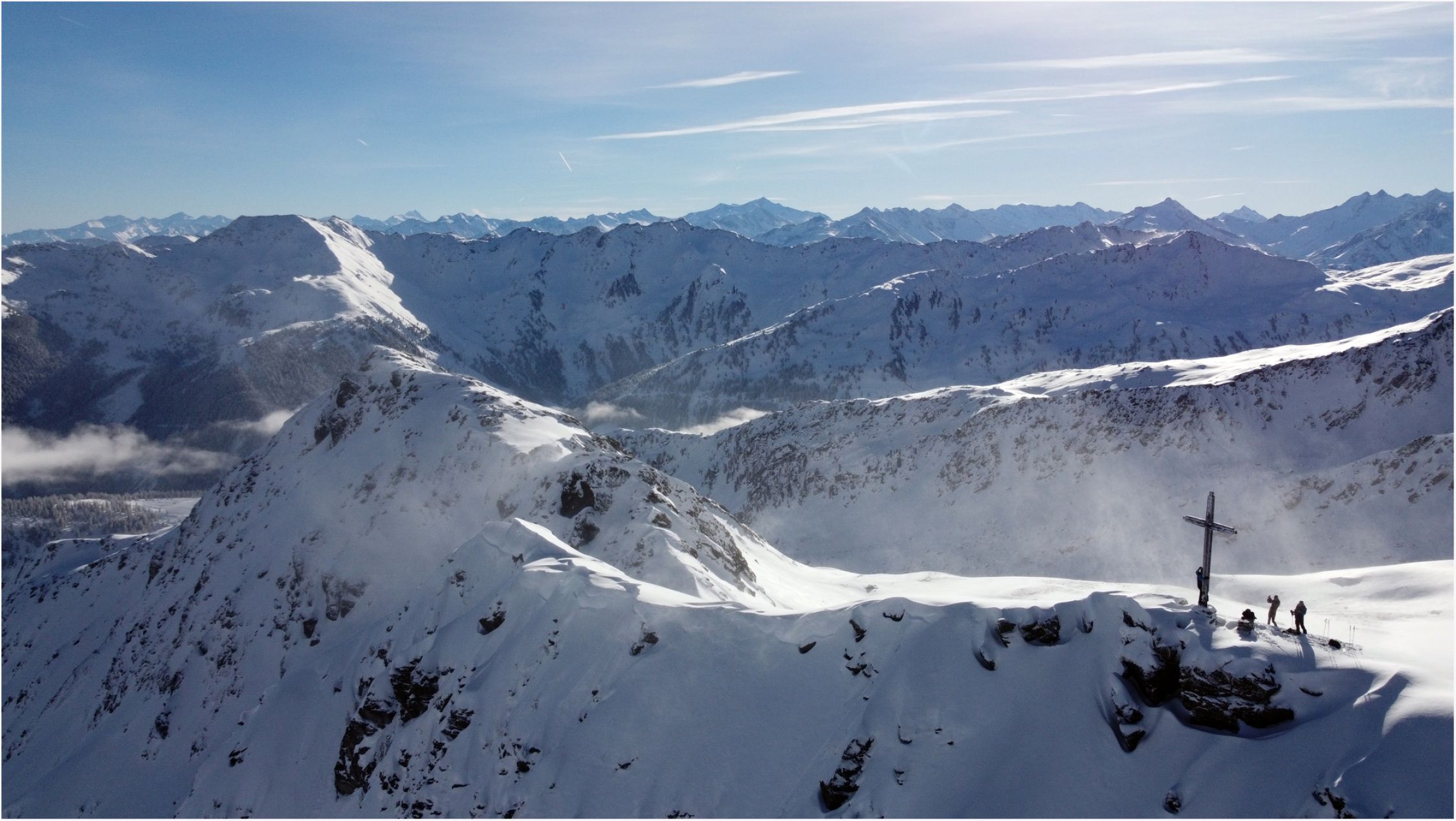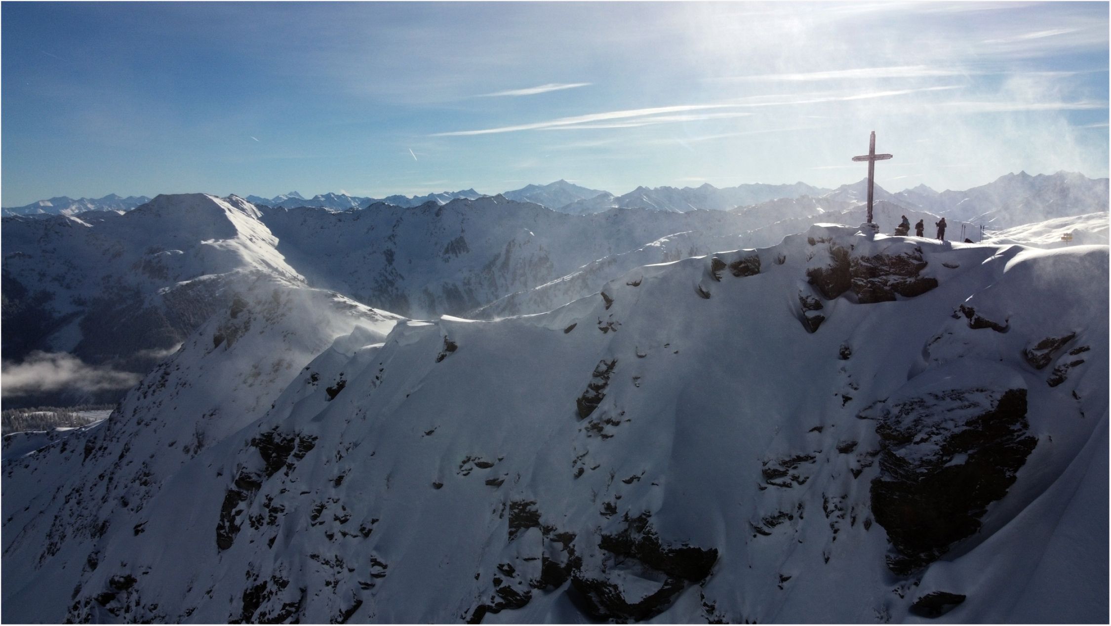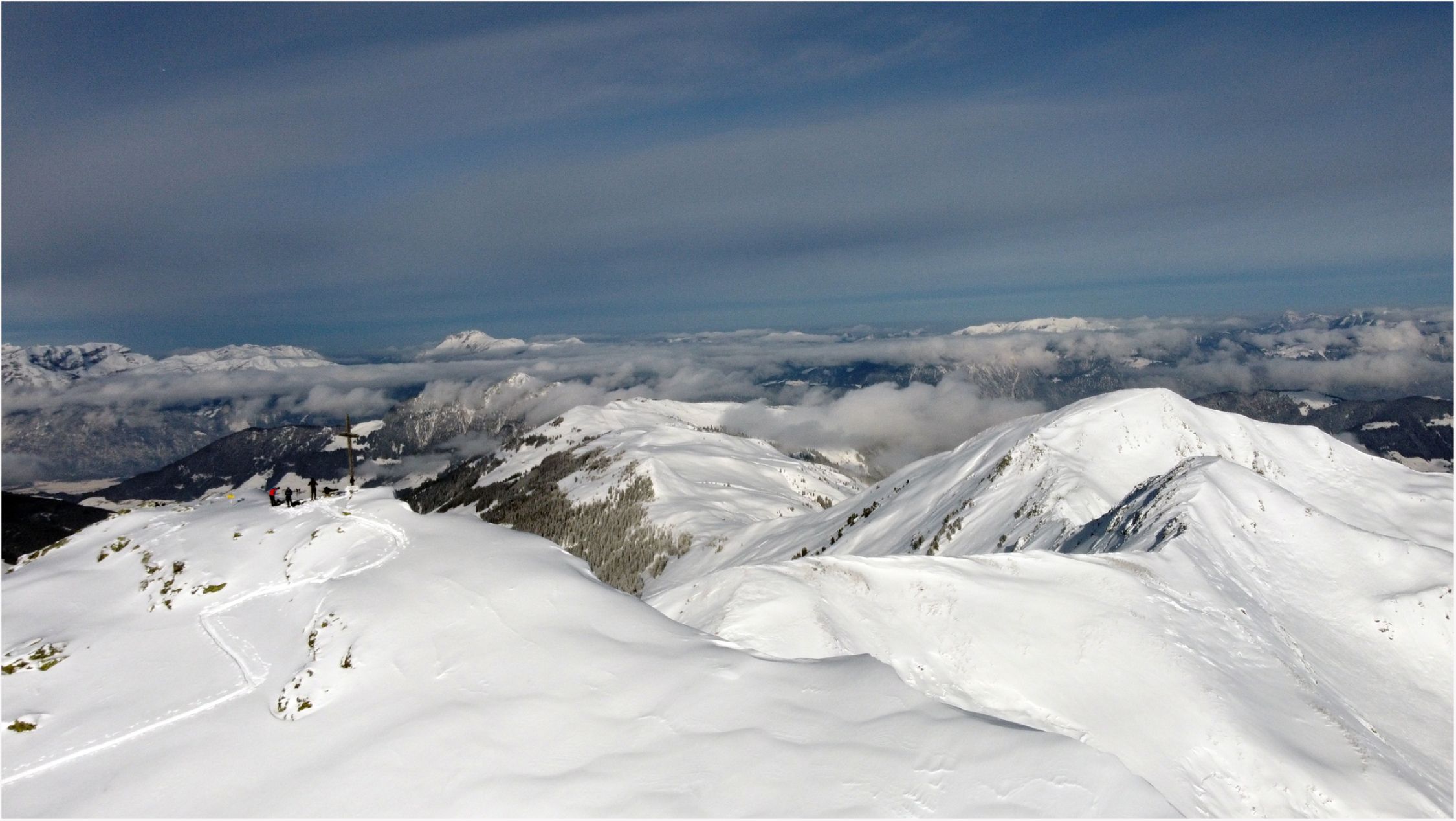 Blick in die Runde: In den westlcihen Kitzbühler Alpen liegt eigentlich genug Schnee. Etwas Zuwachs würde zwar nicht schaden aber es liegt auf alle Fälle deutlich mehr wie z. B. in den Chiemgauer Alpen.