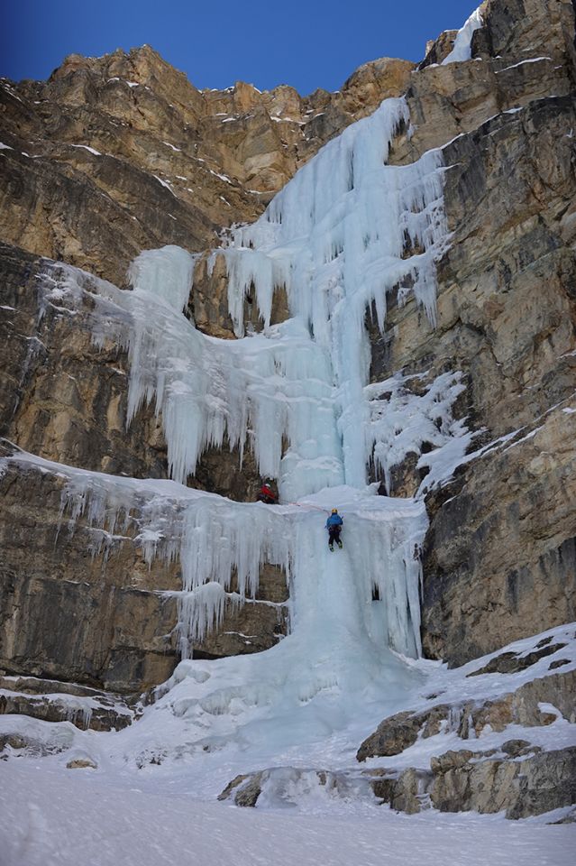 Sottoguda: Offiziell gesperrt wegen Sanierung des Weges nach Hochwasserschäden. Aber von oben (Malga Ciapela) wie unten (Sottoguda) gut erreichbar, ca. 4 Teams am Sonntag unterwegs. Cascata del Sole (100 m, 4/+, original 3+, Foto 8) gut, wenn auch teils dünn und vormittags besonnt; Ausstieg (3. SL) nach Rinne 20 m Mix/Turf ohne Sicherung (M2-3). Spirale (Foto 11) sieht eher dünn und instabil aus. Cattedrale (Foto 10) im oberen Teil sehr röhrig, links nur etwas mehr als Glasuren. Spada nella Roccia nicht vorhanden. Gegenüber der Cattedrale die Cascata delle Attraversate (90 m, 5-, original 4, Foto 9)) mit etwas röhriger Säule in 2. SL, gut eingepickelt. Excalibur startet mit großen Schuppen, oben besser, wurde geklettert. Zudem etliche kurze Übungsfälle und einige Mixedrouten; die Einstiege sind oft heikel wegen des Baches.