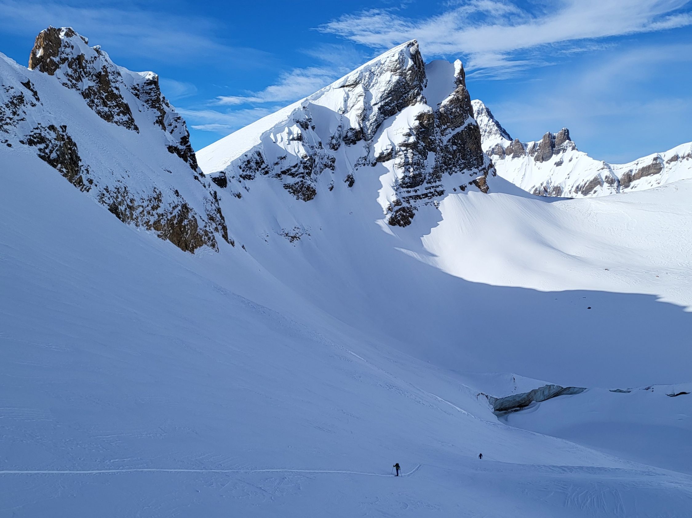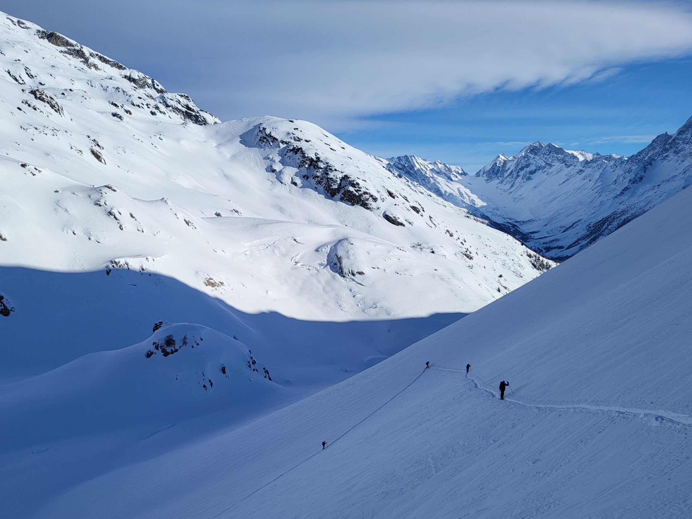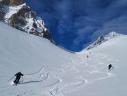 Vom Sattel zwischen Kleinhockenhorn und Hockenhorn zur Lötschenpasshütte abgeblasen und hart, teilweise sogar eisig. In der Abfahrt in den Kessel Unders Färda schöner Pulverschnee. Im Aufstieg über den steilen Hang bei Zem Tritt immer noch Pulverschnee, danach im Tal bei Obers Färda wieder harter Schnee. In der Abfahrt vom Galmpass zum Restipass schwerer Pulverschnee, danach wechselnder Schnee zwischen Hart, Pulver, Bruchharsch. Strasse nach Ferden gut eingeschneit.