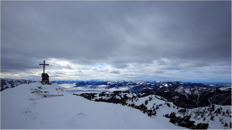 Auf dem Gipfel kräftiger Wind aus West, sehr mild, Tauwetter bis auf über Gipfelhöhe.