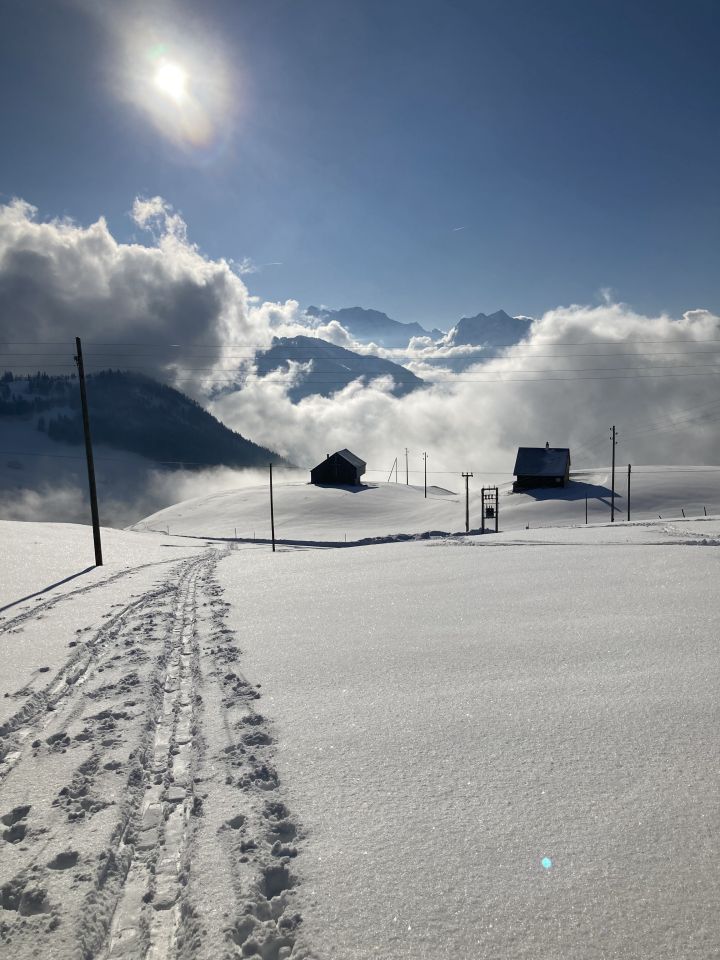 Heute beim PP Tscherwald (ca. 1280) gestartet. Winterausrüstung ab Hauptstrasse sinnvoll. Pulvrige Spur bis zum Gipfel. Harsteisen braucht’s im Moment nicht.