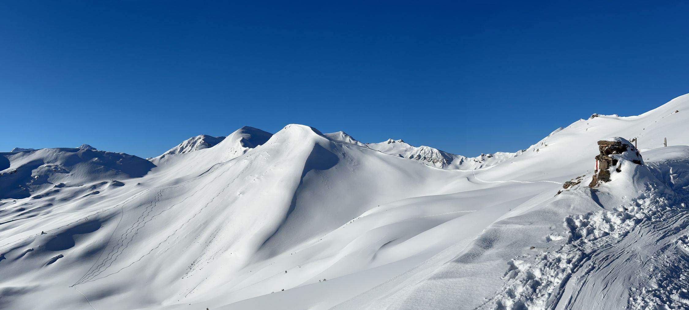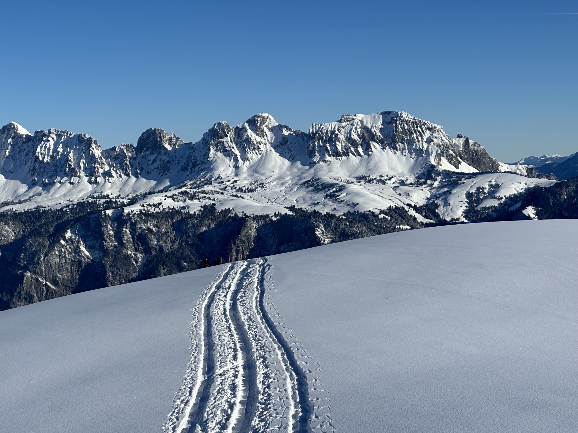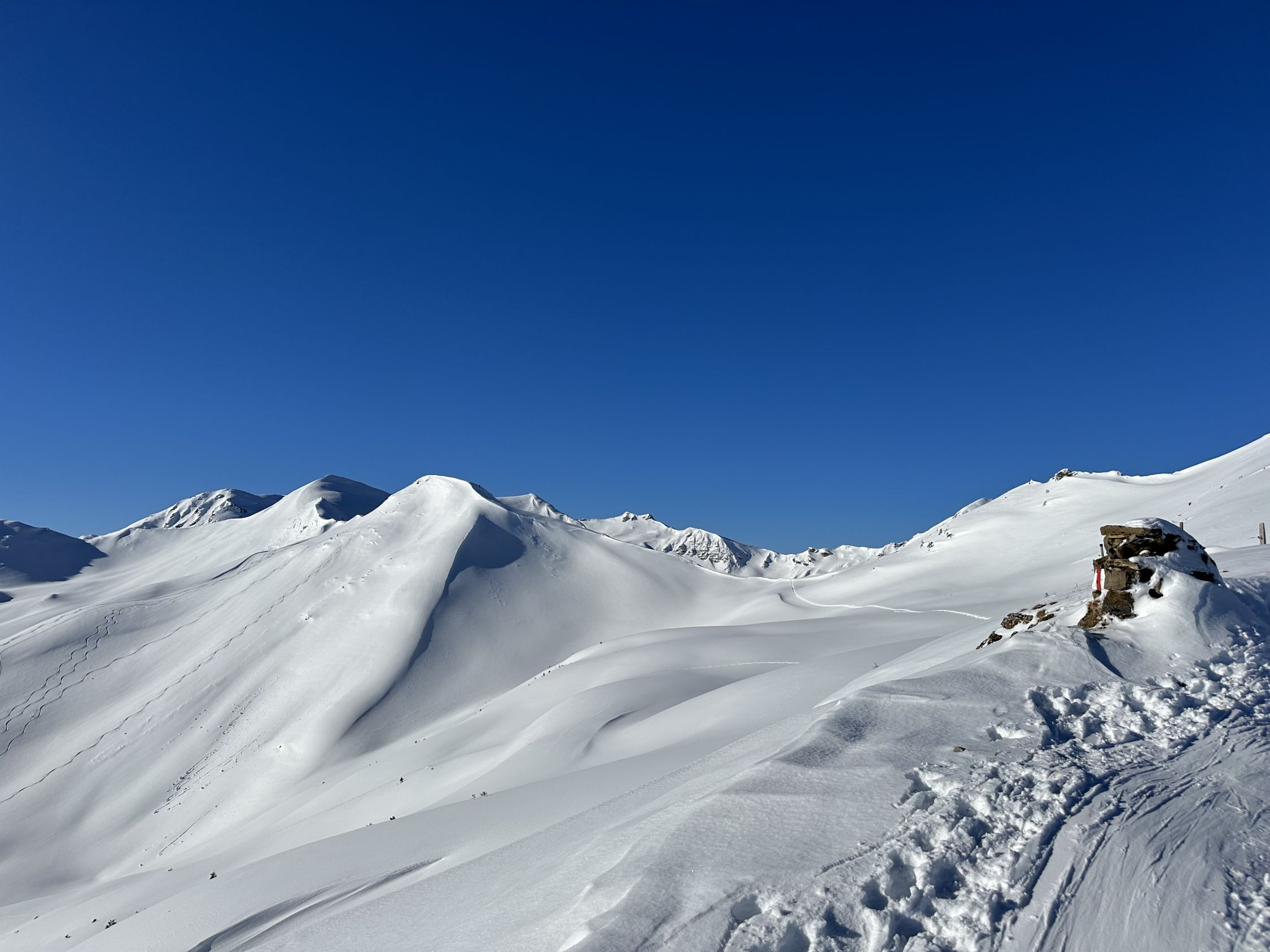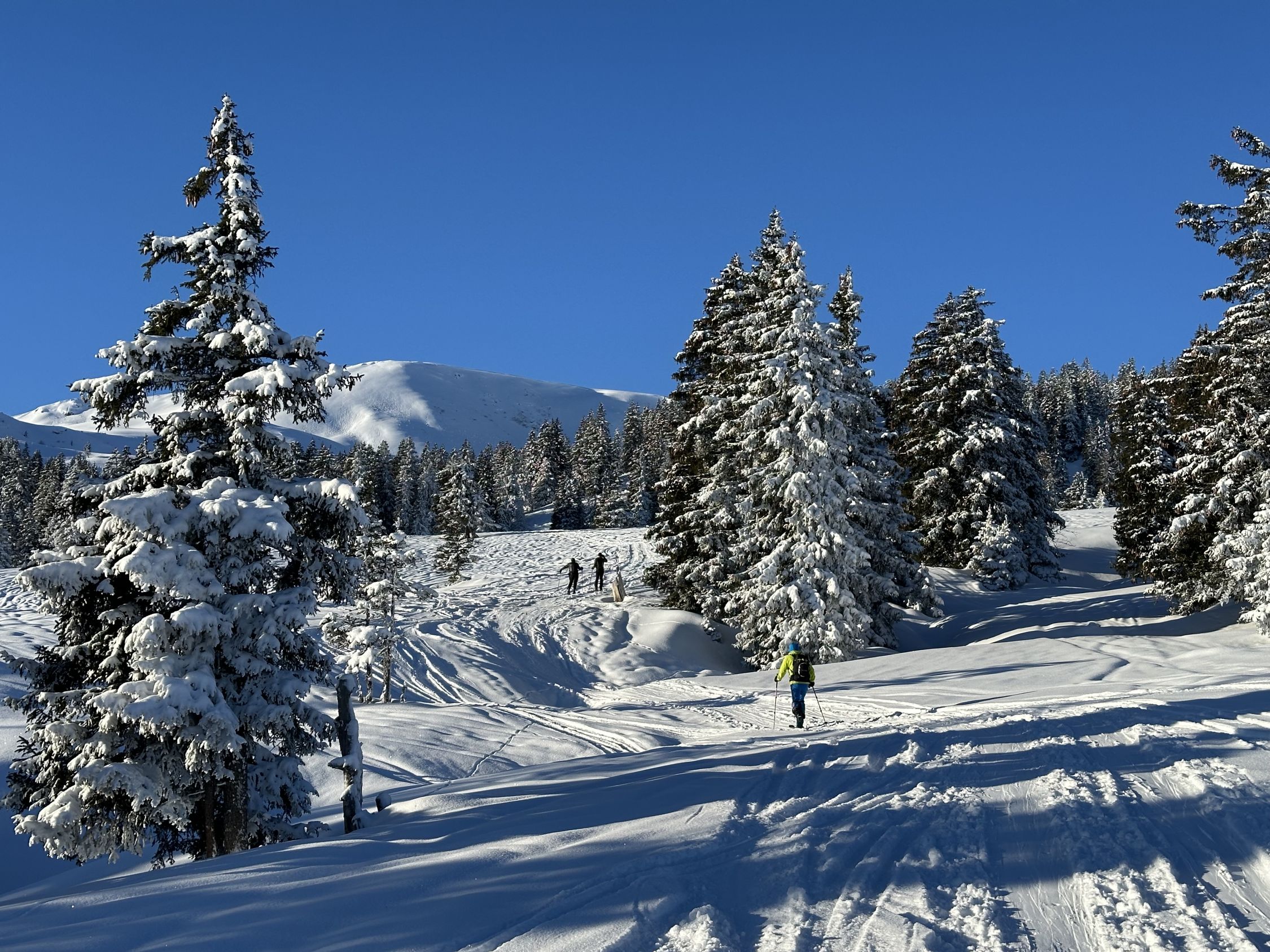 15/20/30 cm Pulver über die ganze Strecke, ein Träumchen, wolkenloser Himmel, beste Sicht, windstill am Gipfel … hab ich was vergessen? Ja, ok, viel los … und in der Abfahrt durch den Wald natürlich etwas zerfahren, buckelpistenmäßig, je unten, je mehr.