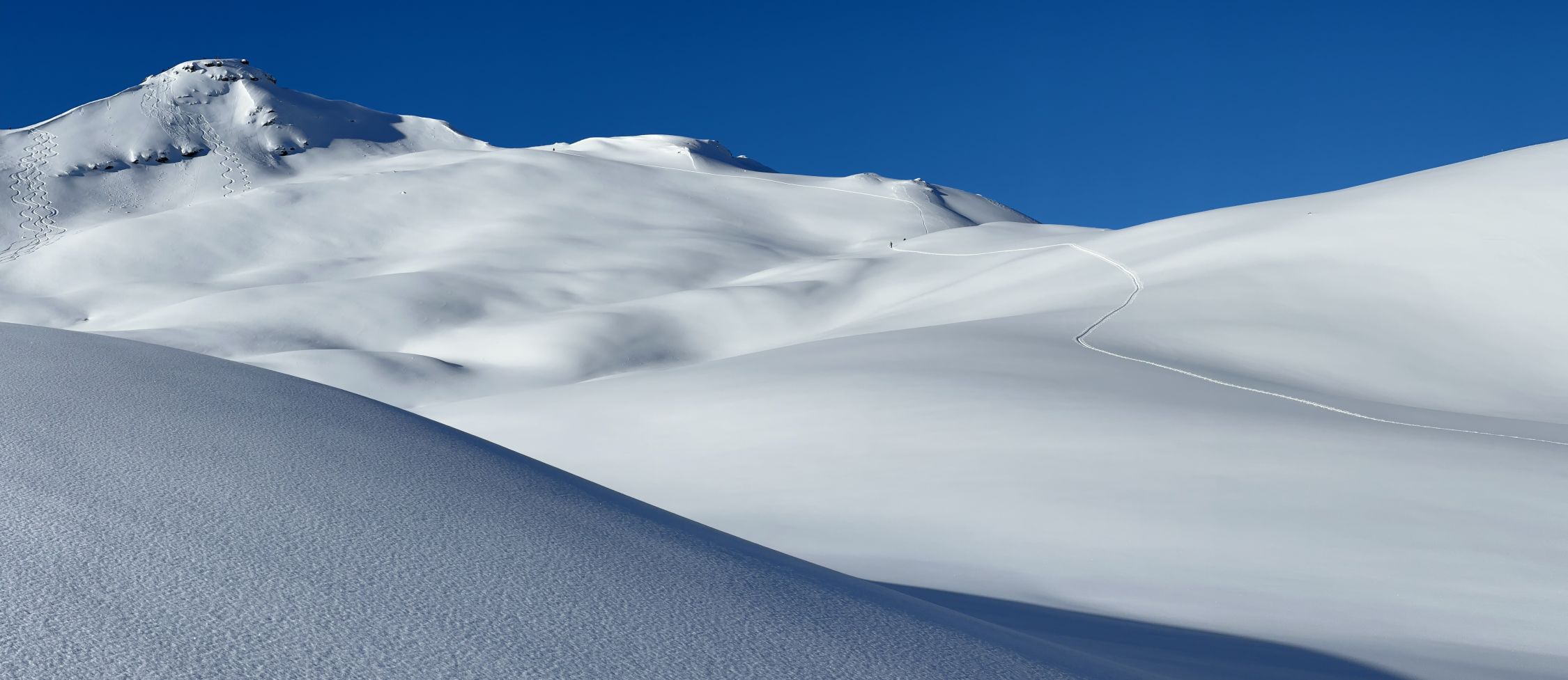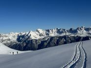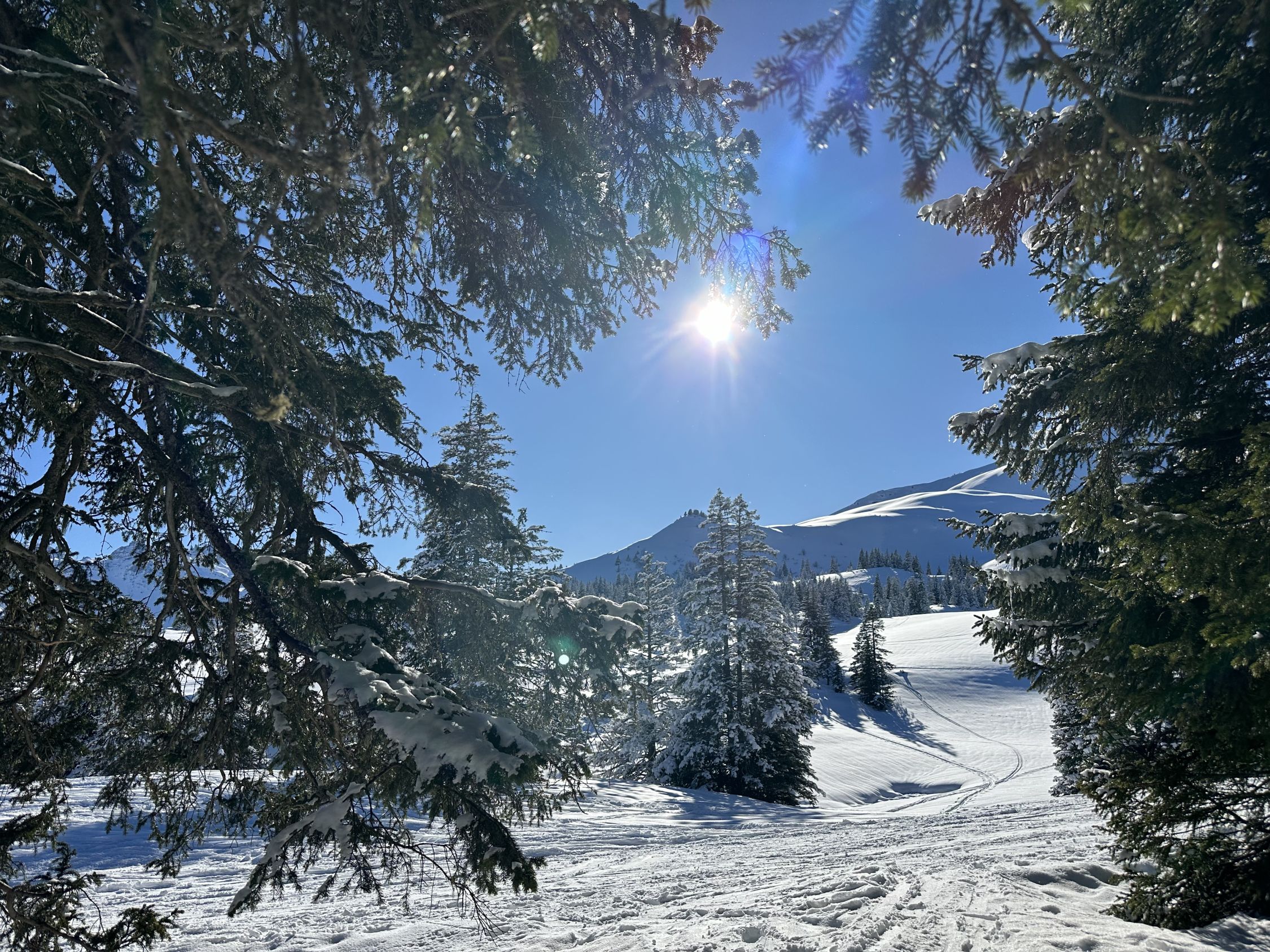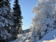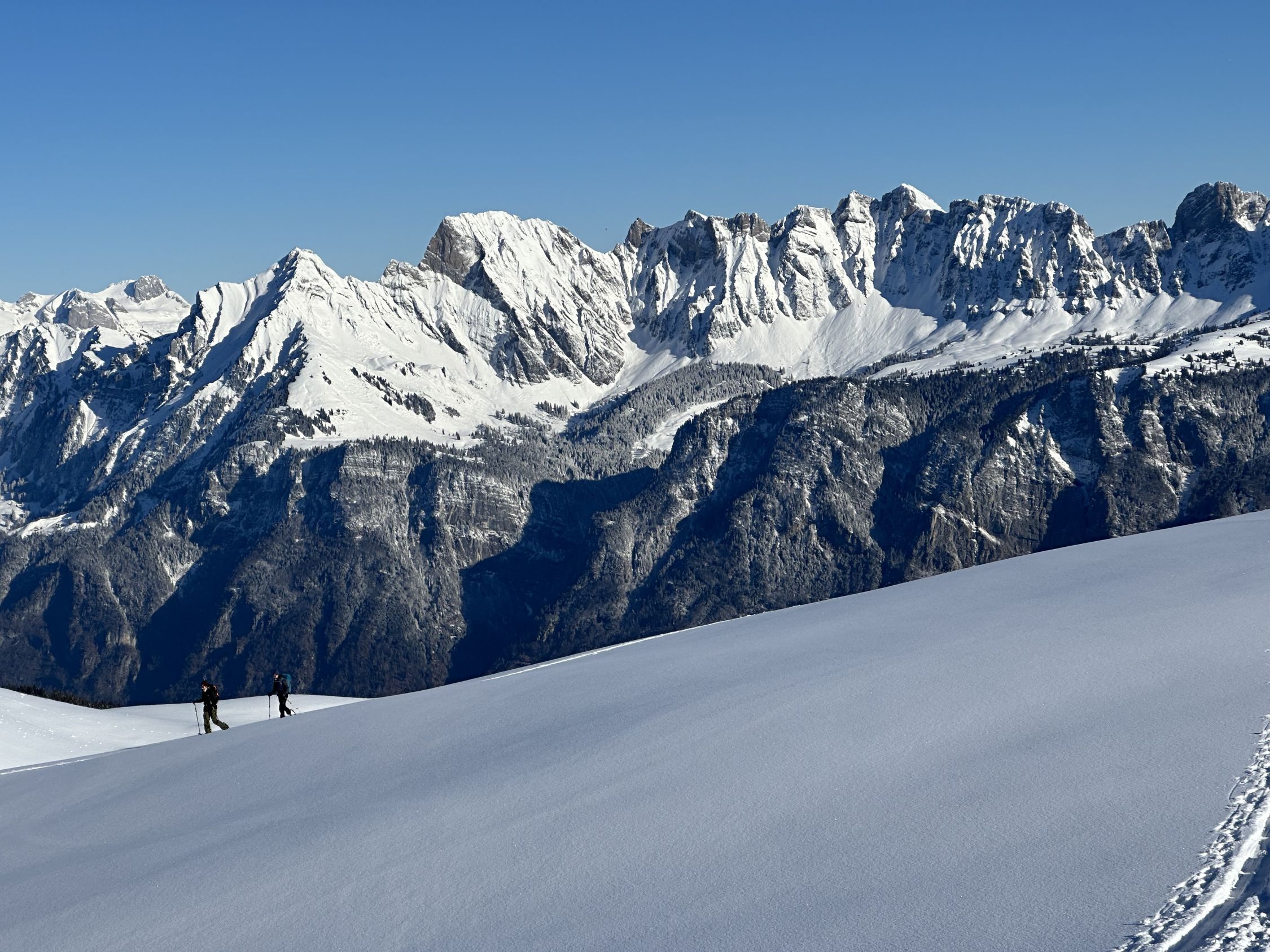15/20/30 cm Pulver über die ganze Strecke, ein Träumchen, wolkenloser Himmel, beste Sicht, windstill am Gipfel … hab ich was vergessen? Ja, ok, viel los … und in der Abfahrt durch den Wald natürlich etwas zerfahren, buckelpistenmäßig, je unten, je mehr.