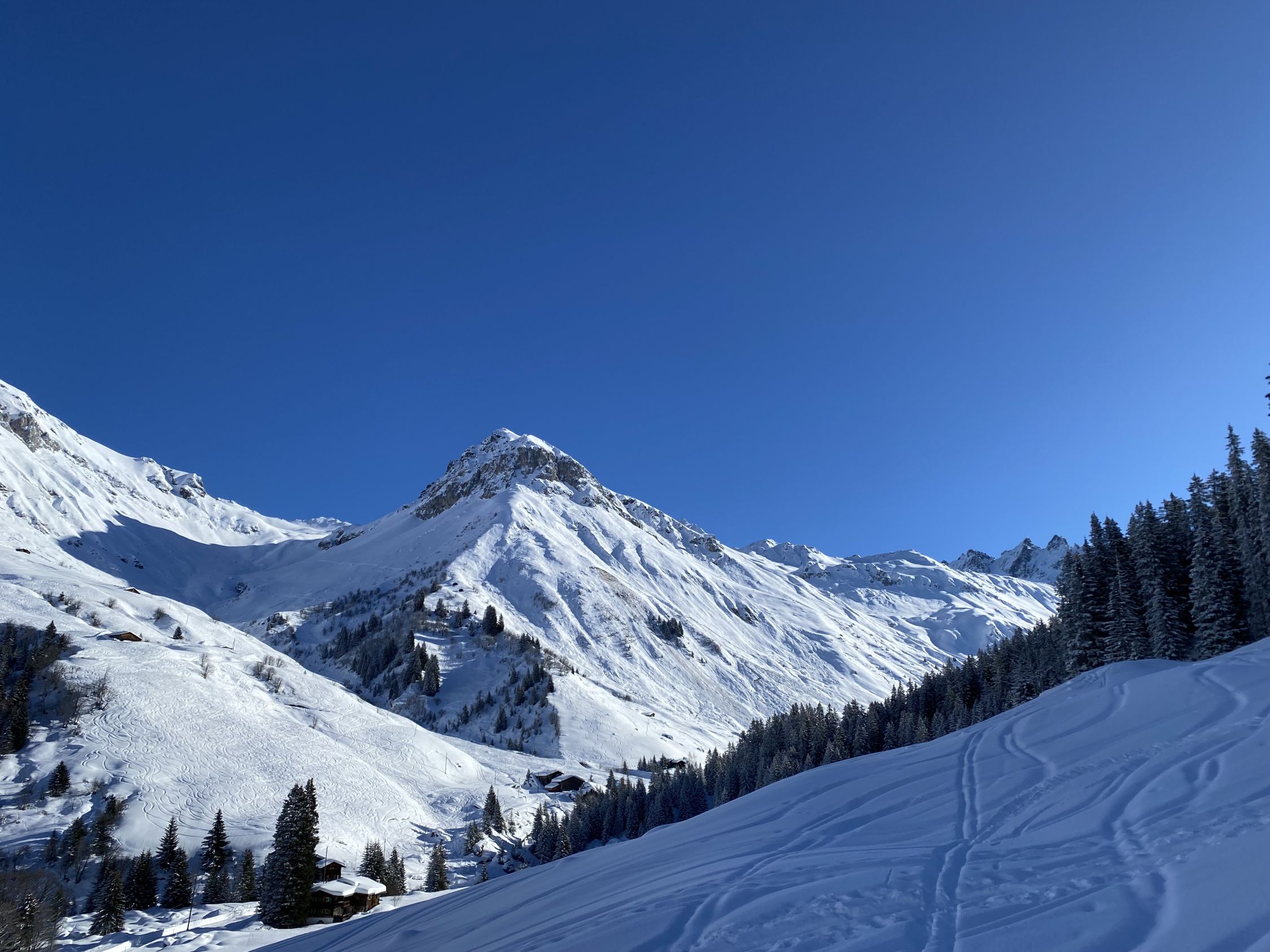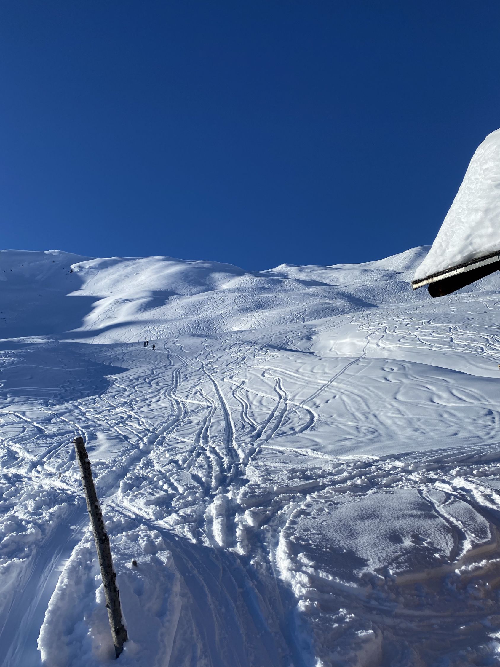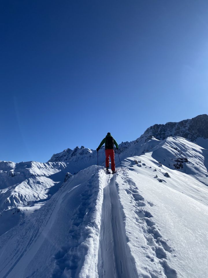 Eisigkalt und mit ca. 10 cm Neuschnee geht es ins Gafiatal. Im unteren Bereich bis ca. 1.900 m haben höhrere Temperturen den Untergrund hart gefrieren lassen und die Spuren der Tage vor dem Neuschnee sind nicht eingeschneit. Im oberen Bereich sehr gute Verhältnisse mit ca. 20-30 cm Neuschnee. Abfahrt nach Nord-Ost feiner Pulver und nicht vom Wind bearbeitet.