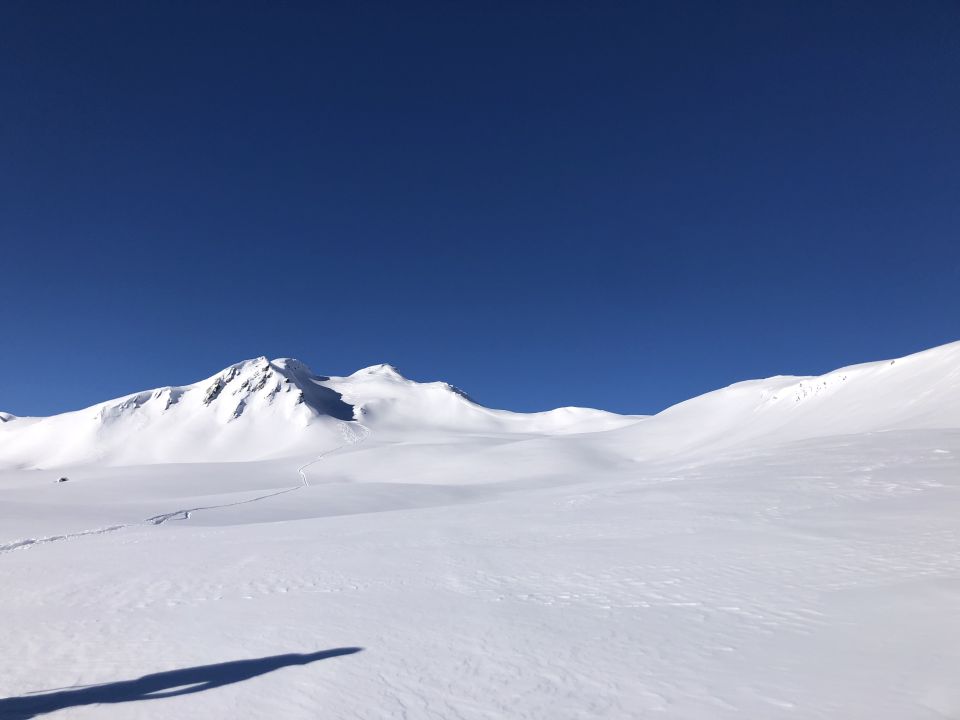 Angesichts der Karawane, die heute unterwegs war, dürften die Hänge inzwischen weitgehend zerfahren sein. Der luftige Pulver im oberen Teil sollte mit der Kälte aber bis morgen konserviert werden und weiterhin schön zu fahren sein.