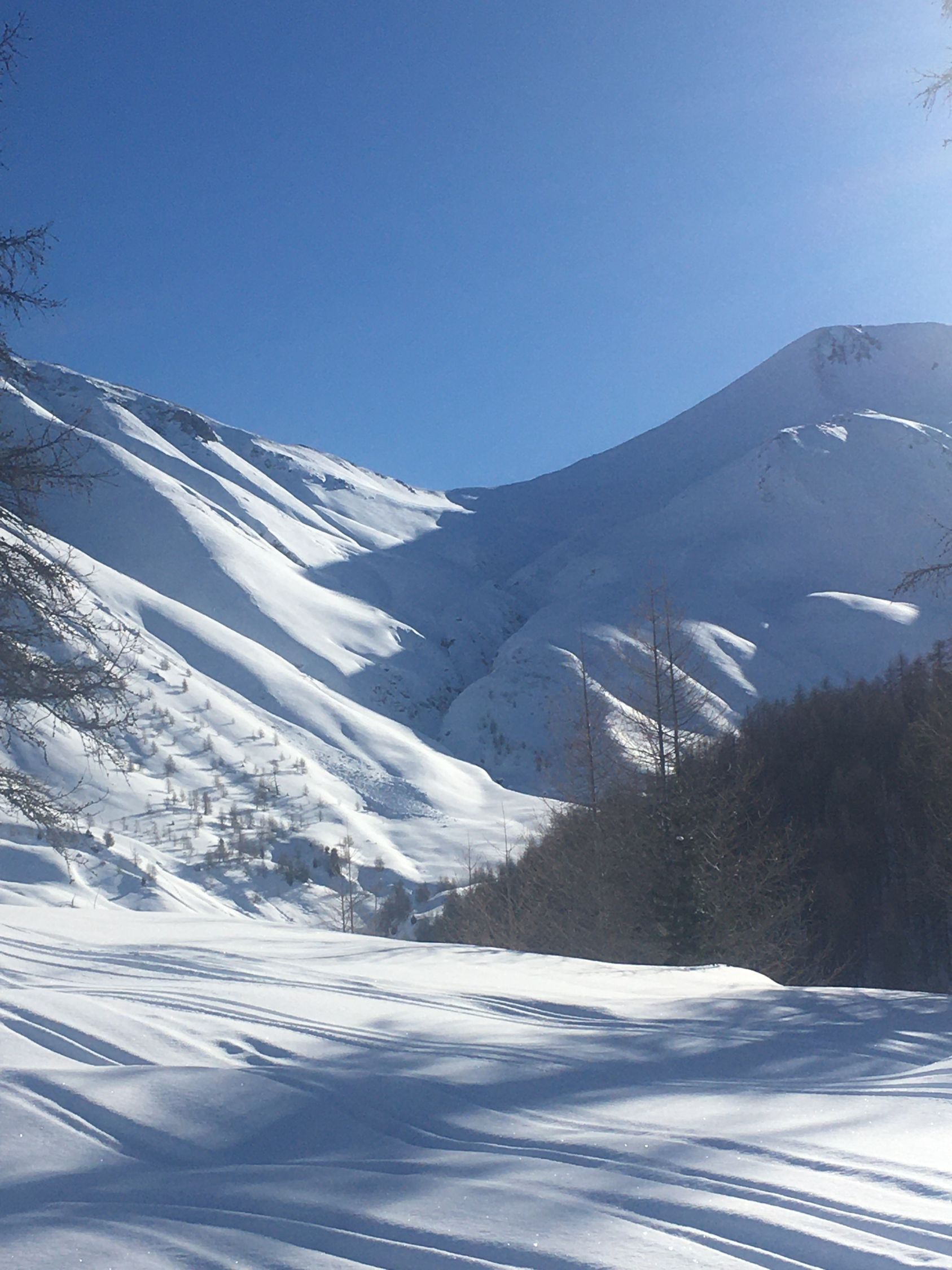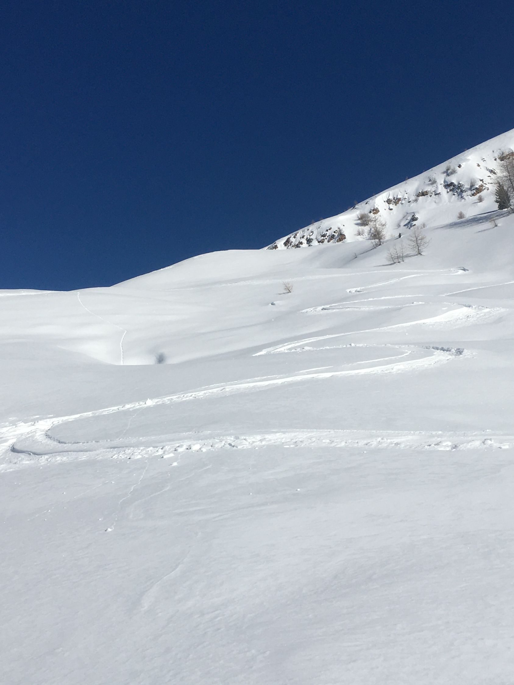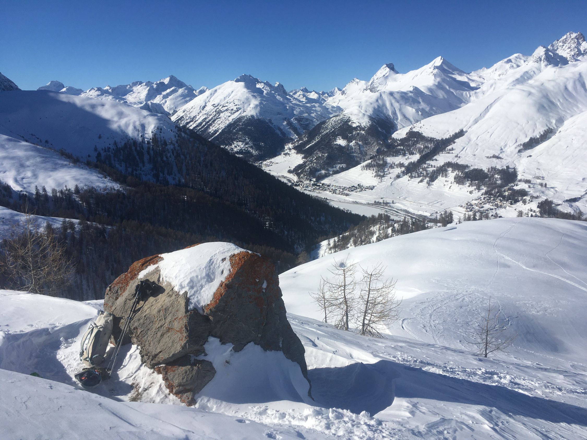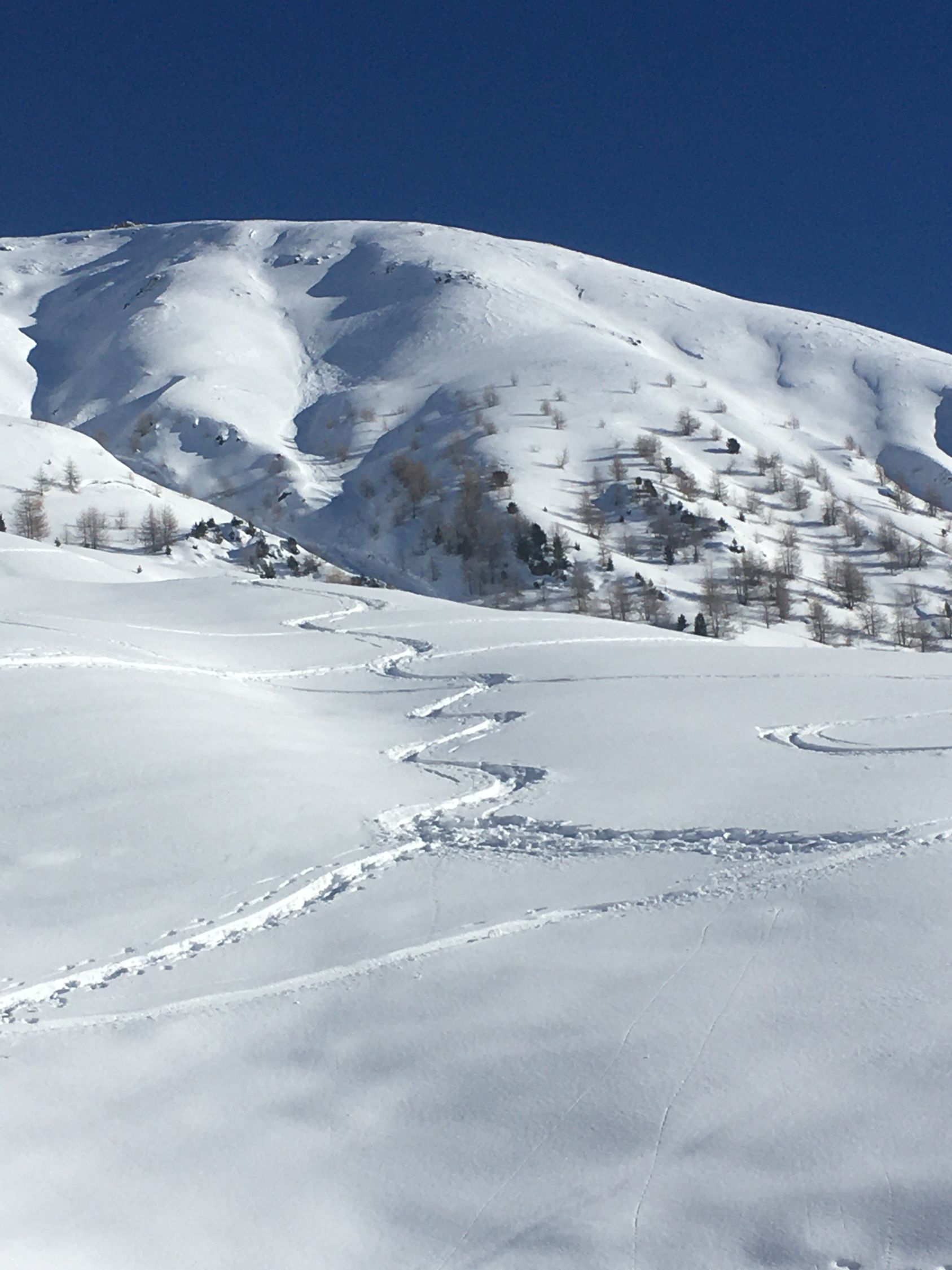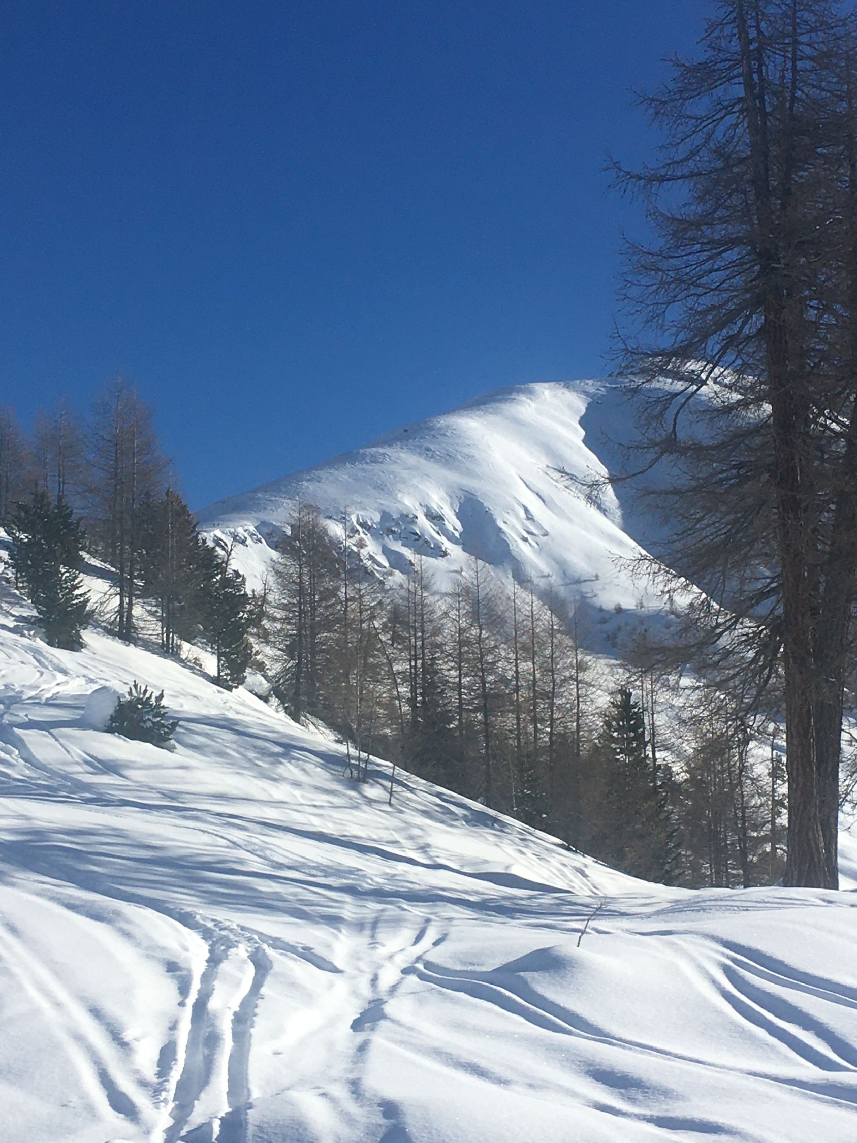 Frostige Rundtour -25 Grad, zum Felsblock P. 2337 und Abfahrt zur Alp Arpiglia. Start Zuoz Resgia 9 Uhr, minus 25 Grad, windstill. Wir sind gemütlich das Alpsträsschen hoch bis Punkt 2939. Margrit mit Schneeschuhe weiter auf Alpsträsschen zur Alp Arpiglia. Ich bin auf einer leider steilen Spur die Waldschneise hoch und weiter das fast flache Stück bis unter den Punkt 2337. Jetzt steil hoch mit vier Spitzkehren zum kleinen Felsblock. Hier kurze Pause und weiter südwestwärts in fast unverspurtem Gelände , 30 bis 35 Grad steil Abfahrt zur Alp Arpiglia. Toller Schnee, perfekte Abfahrt! Weiter auf Alpsträsschen nach Zuoz. Die Waldschneisen sind alle verfahren.
