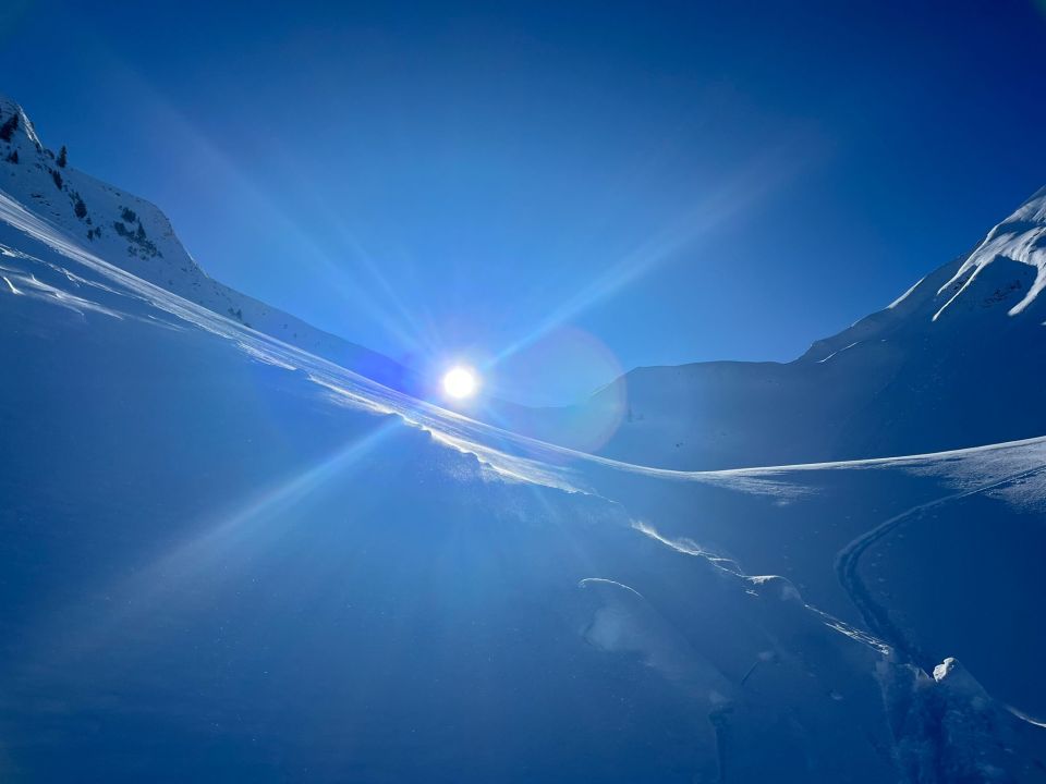 Start bei kalten -12Grad. Es hatte erstaunlicherweise "nur" 10-15cm Neuschnee ganz unten. Oben ca. 15-20cm auf einer eher harten Unterlagen. Der Aufstieg war im oberen Bereich in den steileren Passagen mit H-Eisen gut zu machen. Einzig beim Übergaben auf den Grat mussten wir die Wächte mit einigem Triebschnee wegschaufeln. In der Abfahrt herrlicher Pulverschnee. Im unteren Bereich mit Kontakt auf auf die harte Unterlage. Insgesamt aber sehr schöne Verhältnisse.