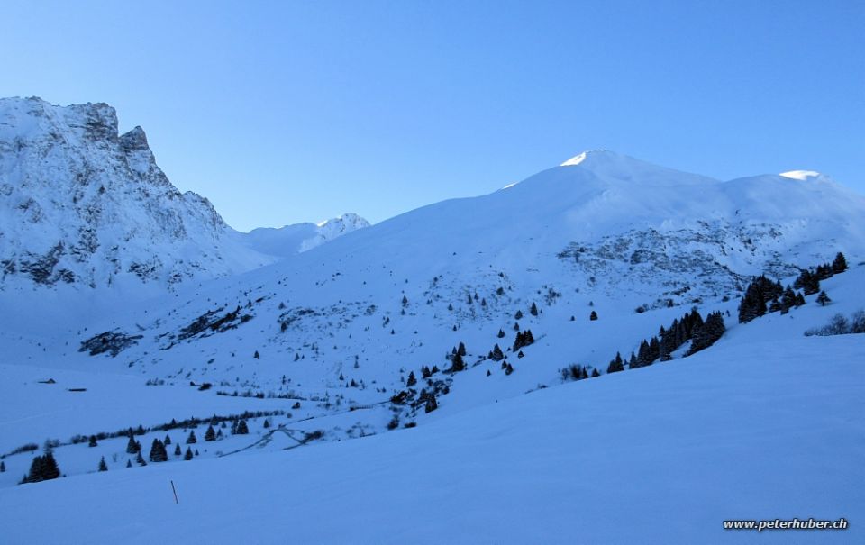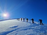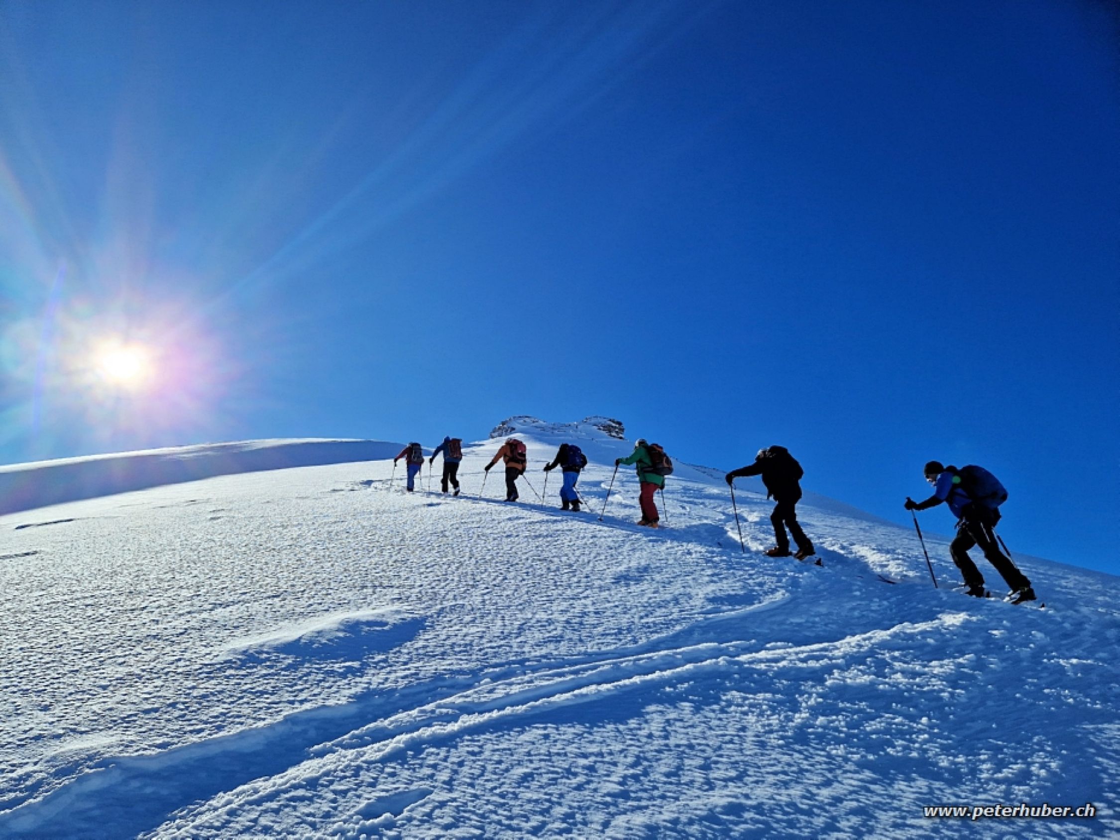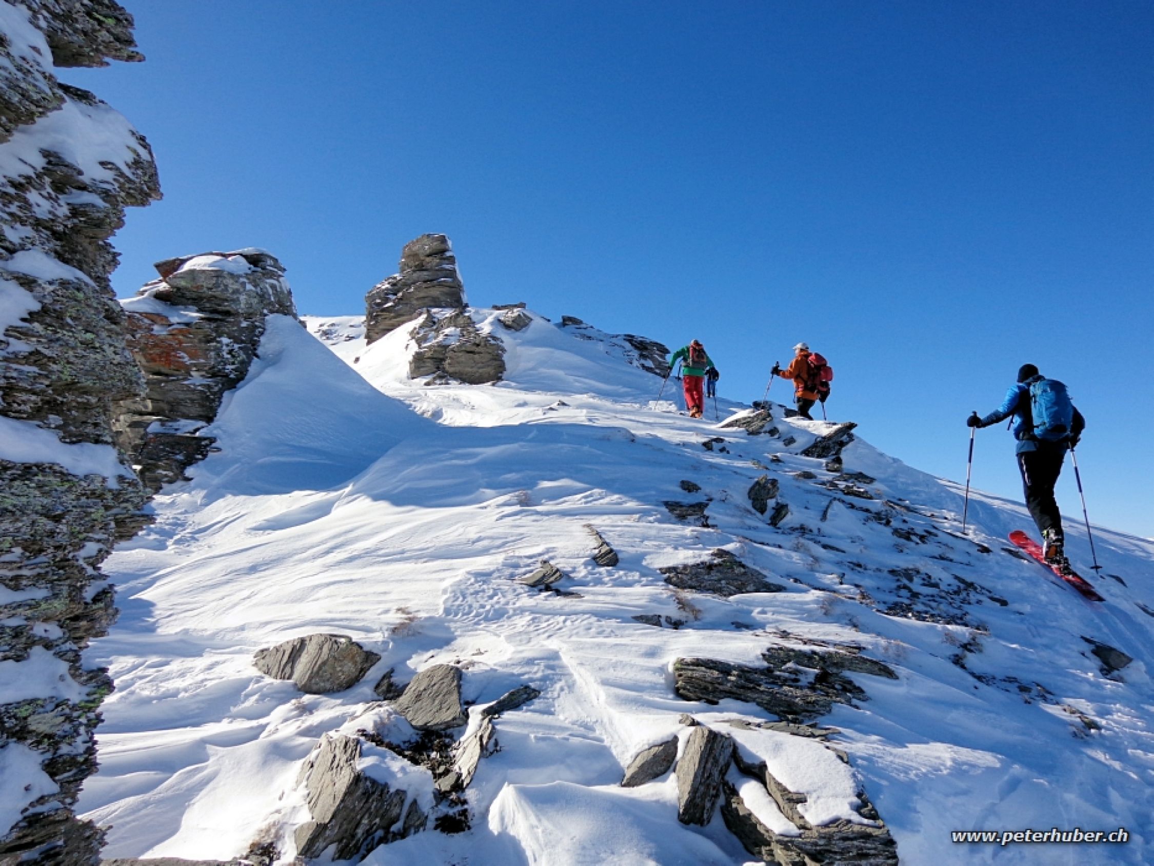 Aufstieg ab Radons auf wechselnd steiler Spur. Zeitweise unnötig steil. Es hat genügend Schnee, jedoch oft windverfrachtet. Von den letzten paar Tagen hats nur wenige Zentimeter Neuschnee. Am Gipfel kommen etliche Steine zum Vorschein.
