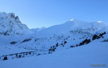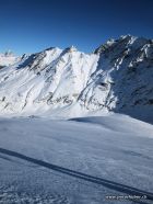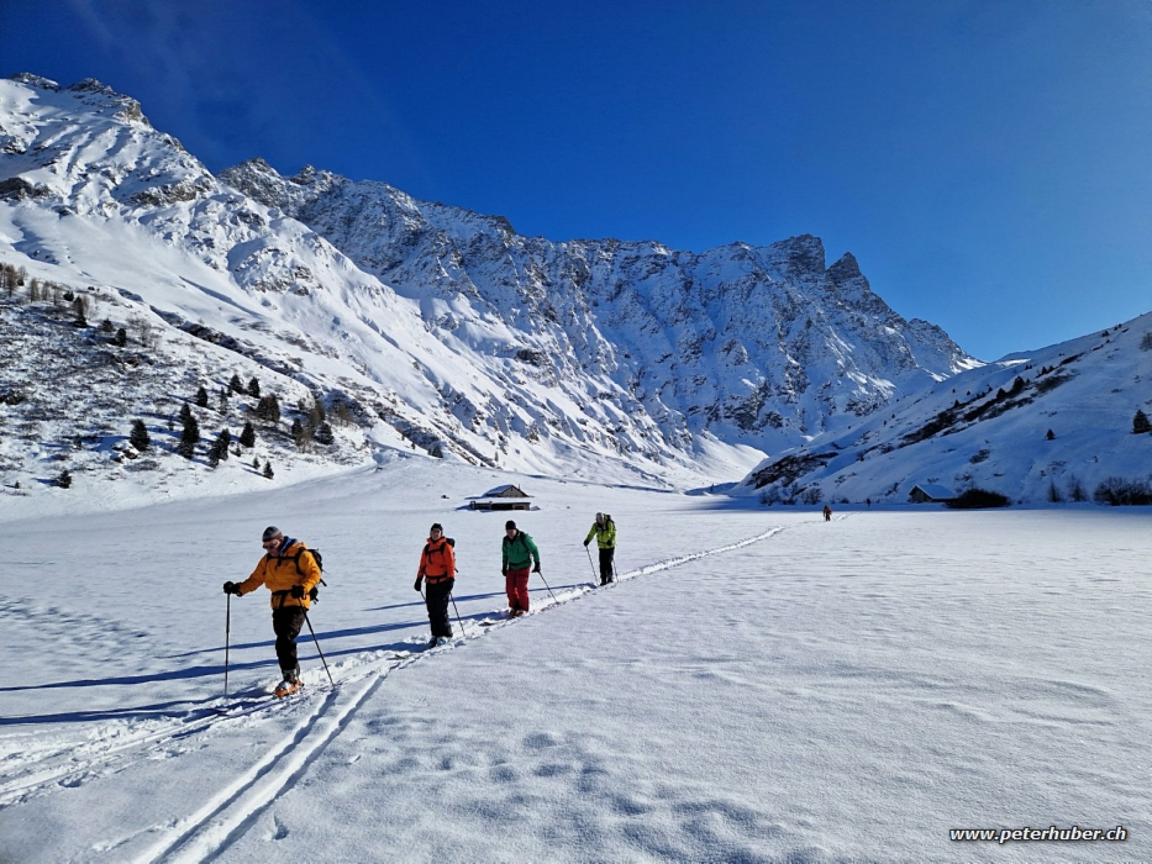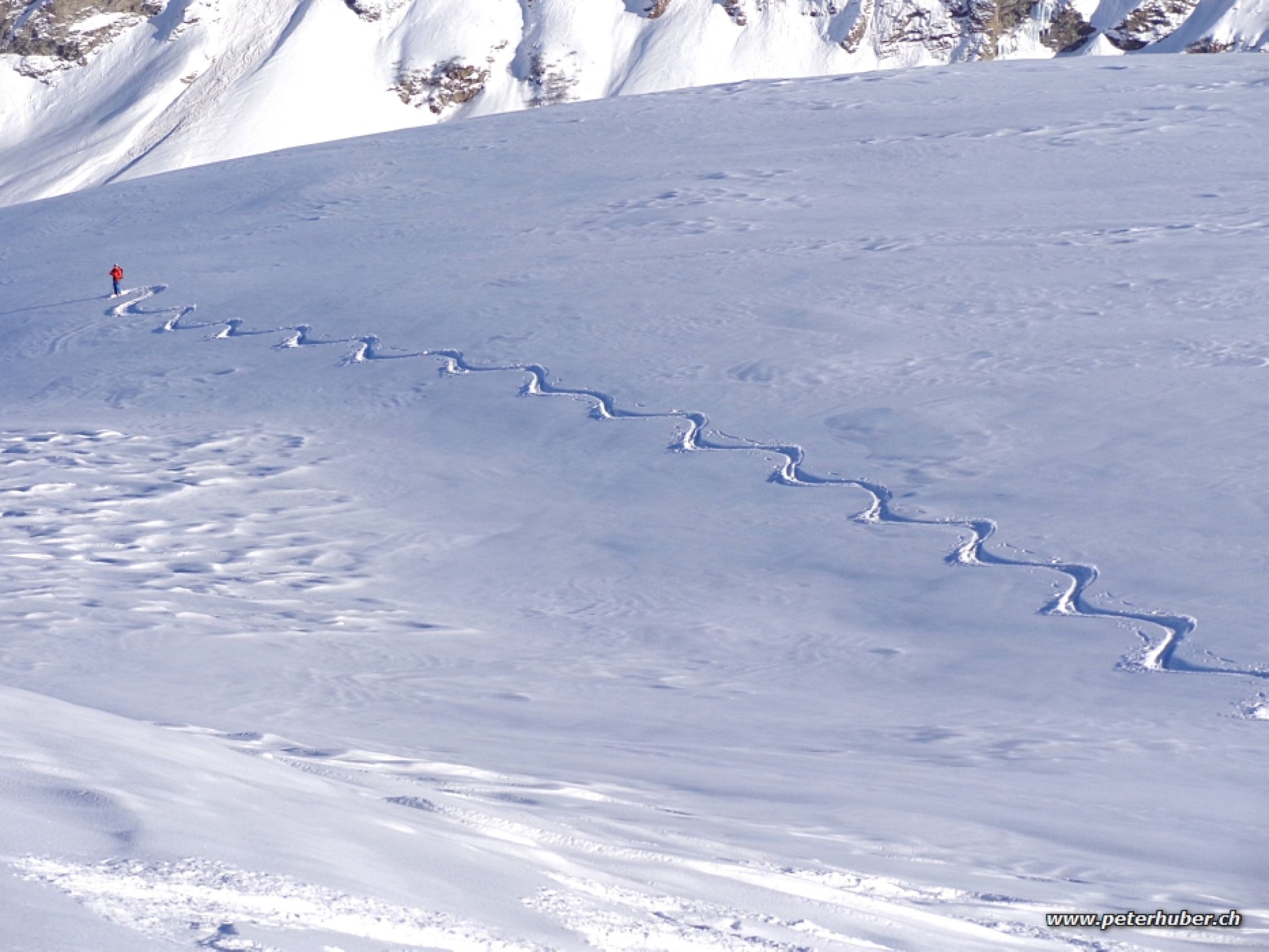 Abfahrt: In den Mulden oft sehr schöner Pulverschnee. Dazwischen auf den Kuppen hügelig gewellt vom Wind und ruppig. In Radons kurz angefellt und zum Skilift aufgestiegen.