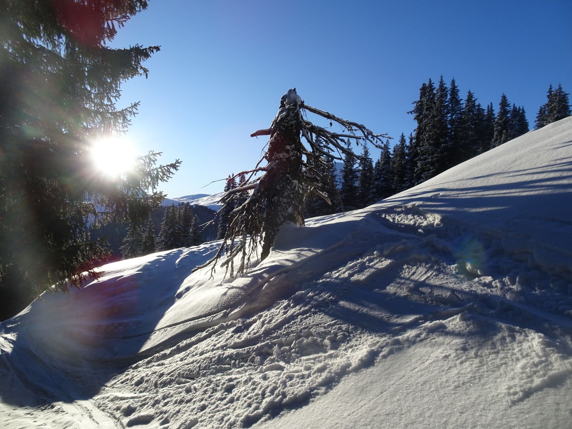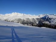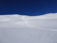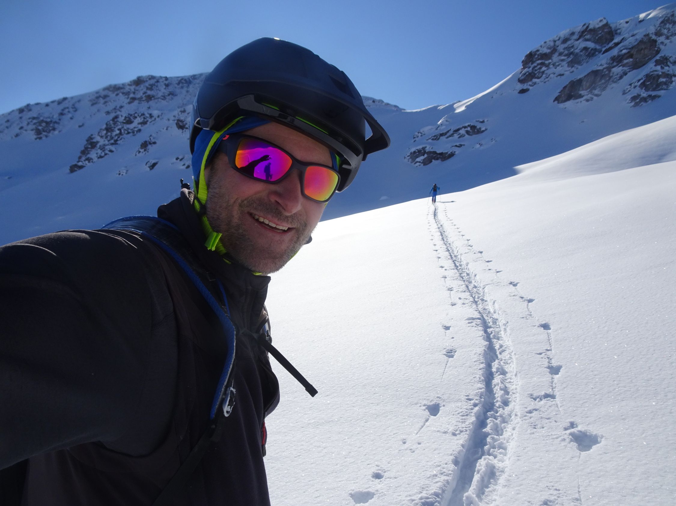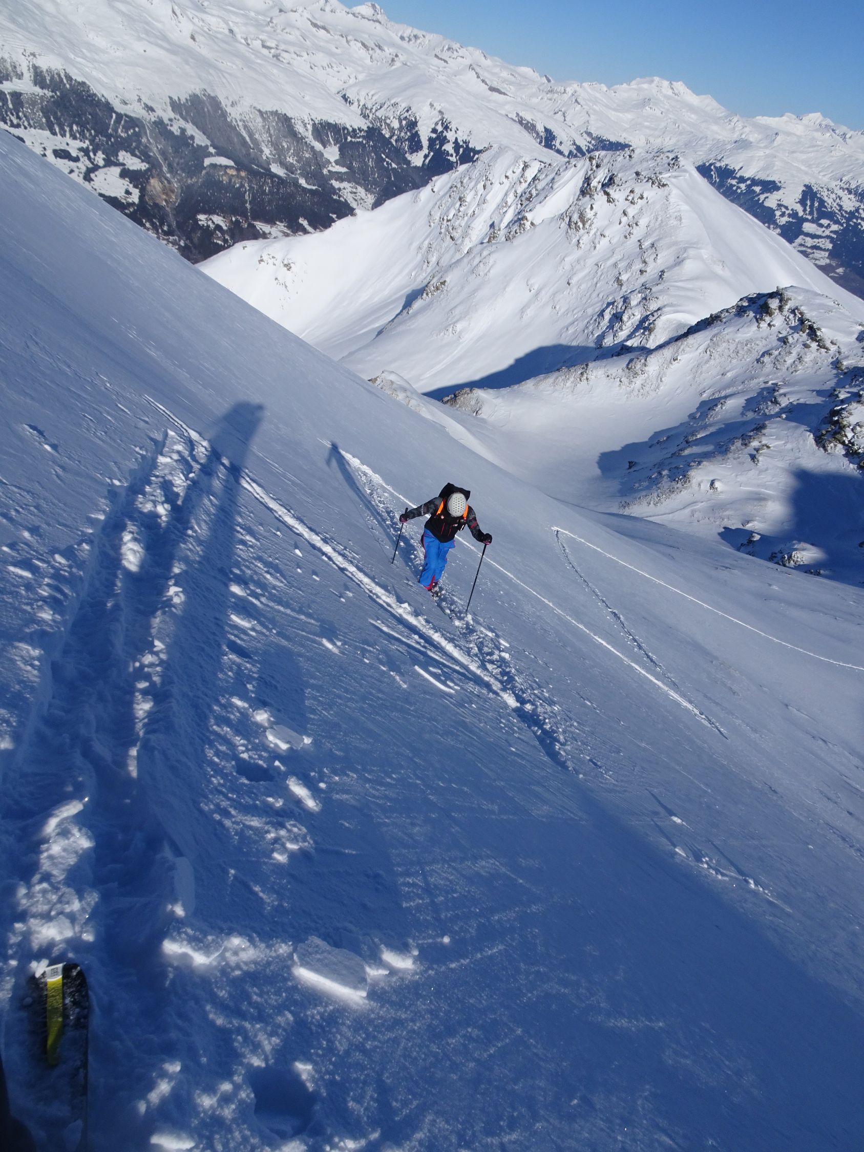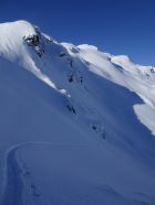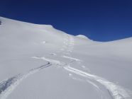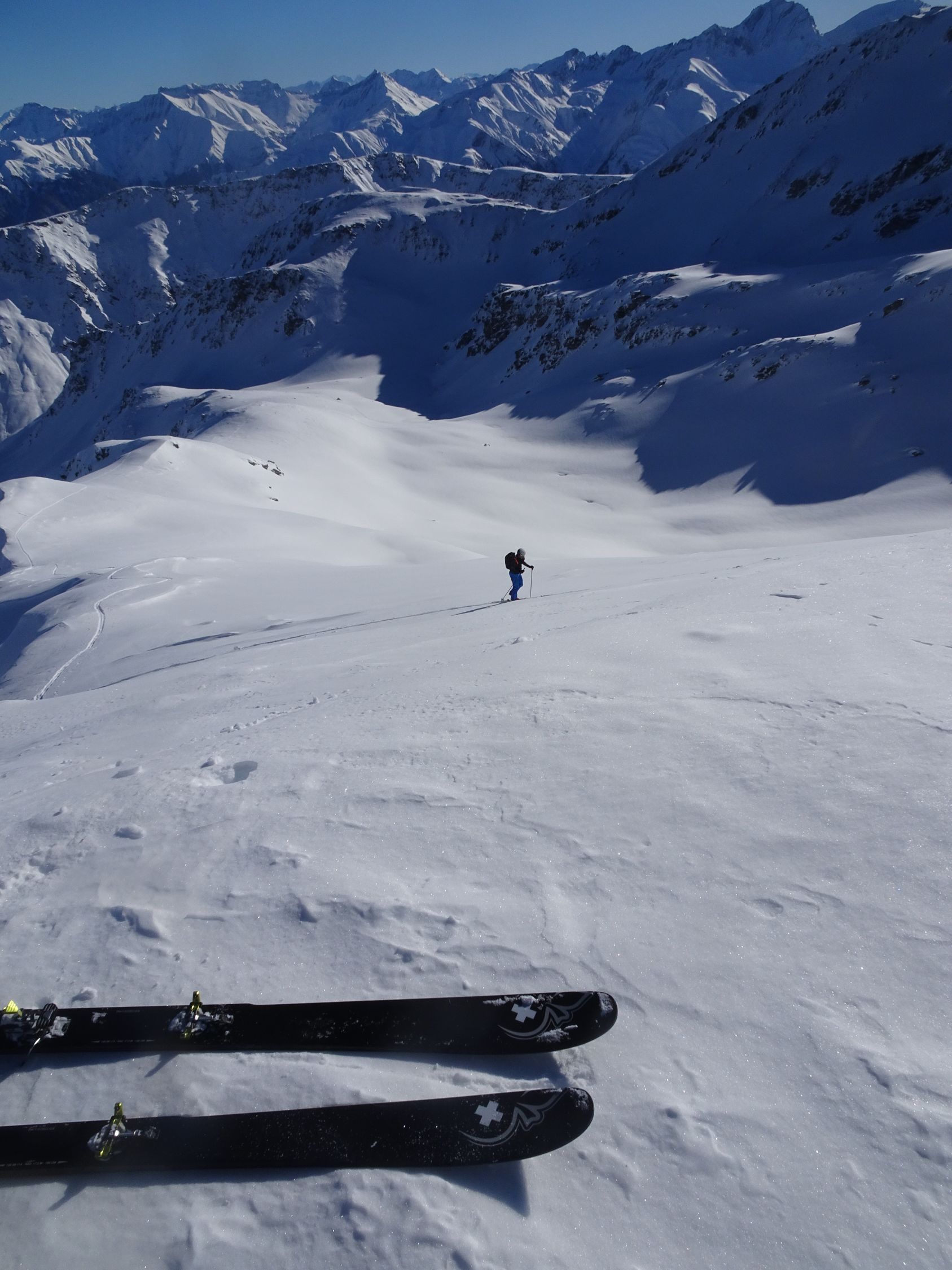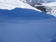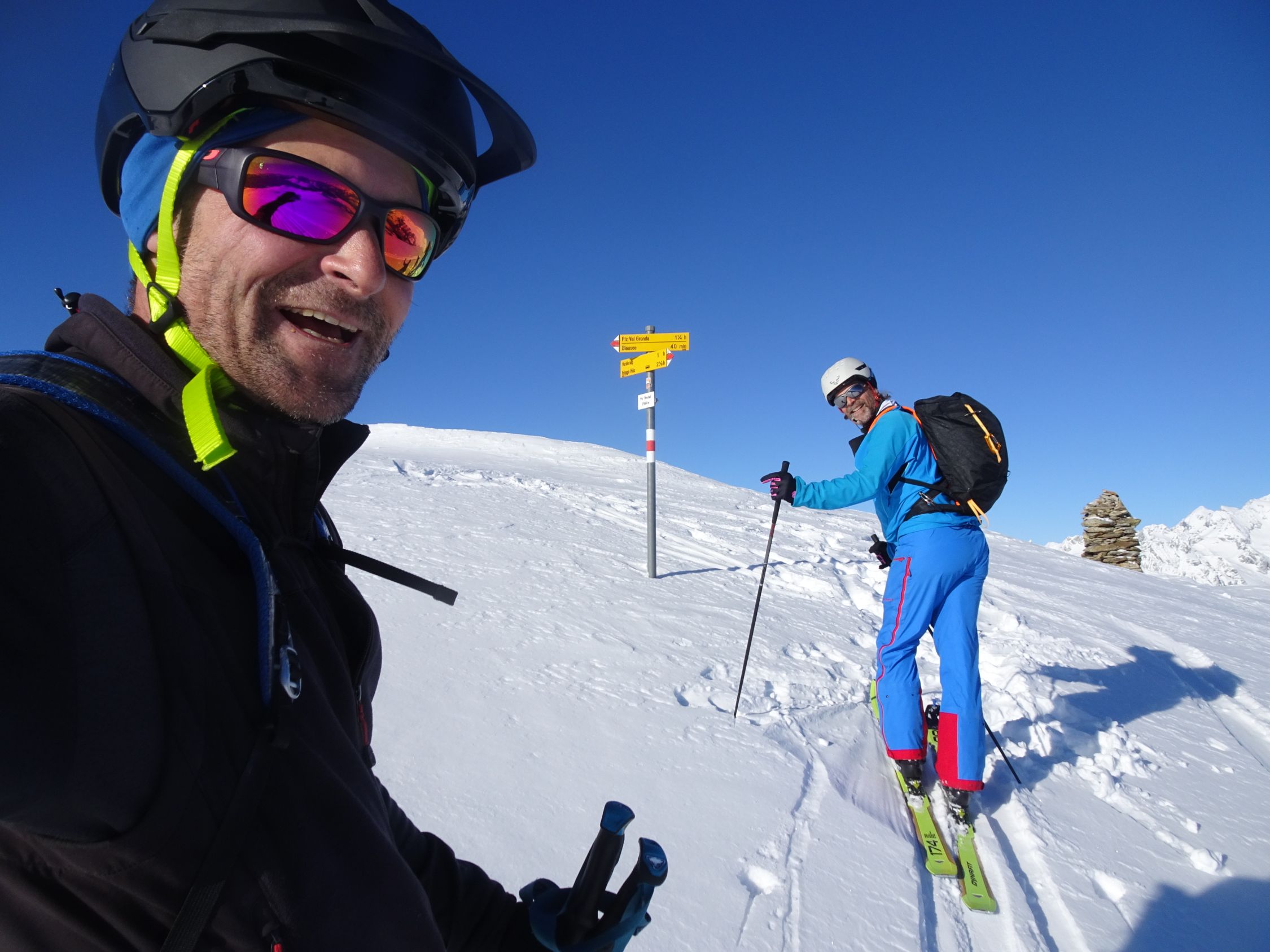 Schöne Abfahrt in leicht gepressterm Pulverschnee und nun sonniger Aufstieg zum Piz Lad. Erneut schöne Abfahrt in Pulverschnee und steiler Anstieg zum Piz Val Gronda.