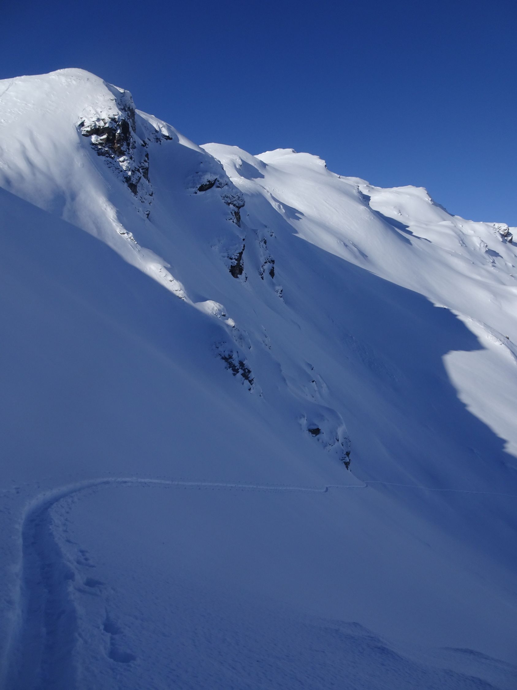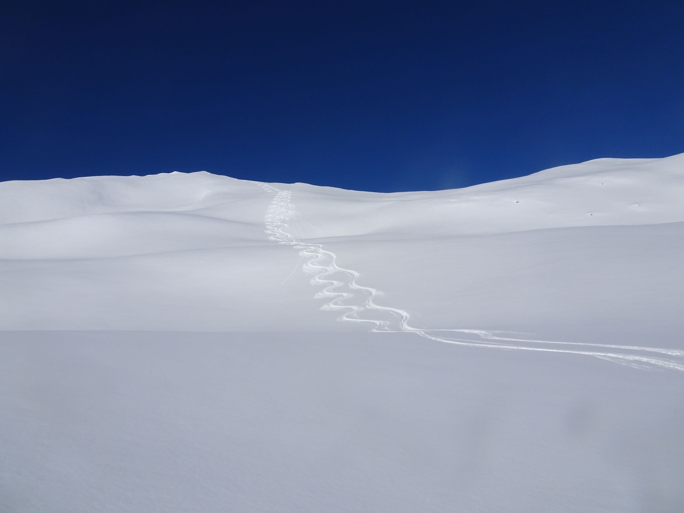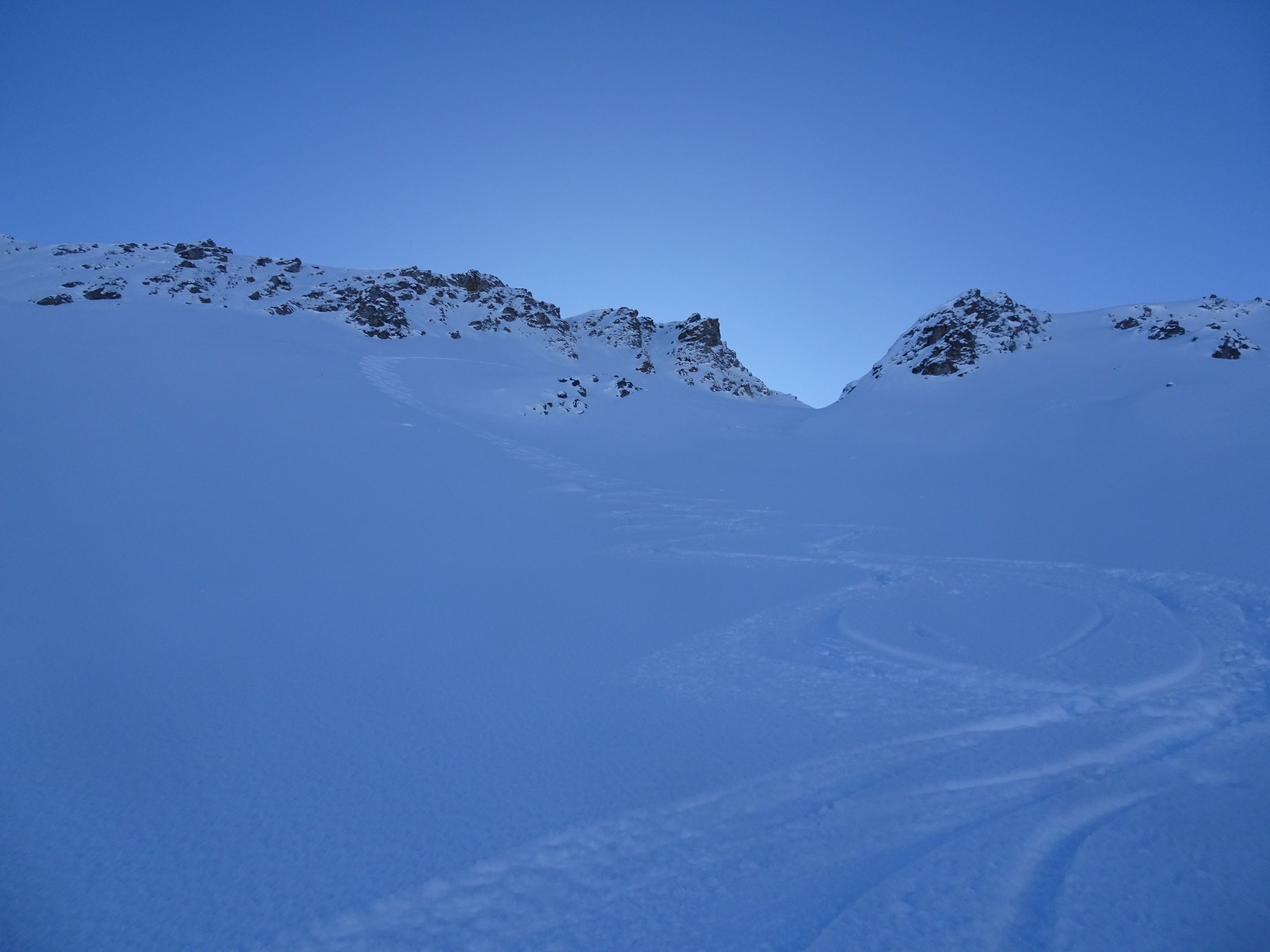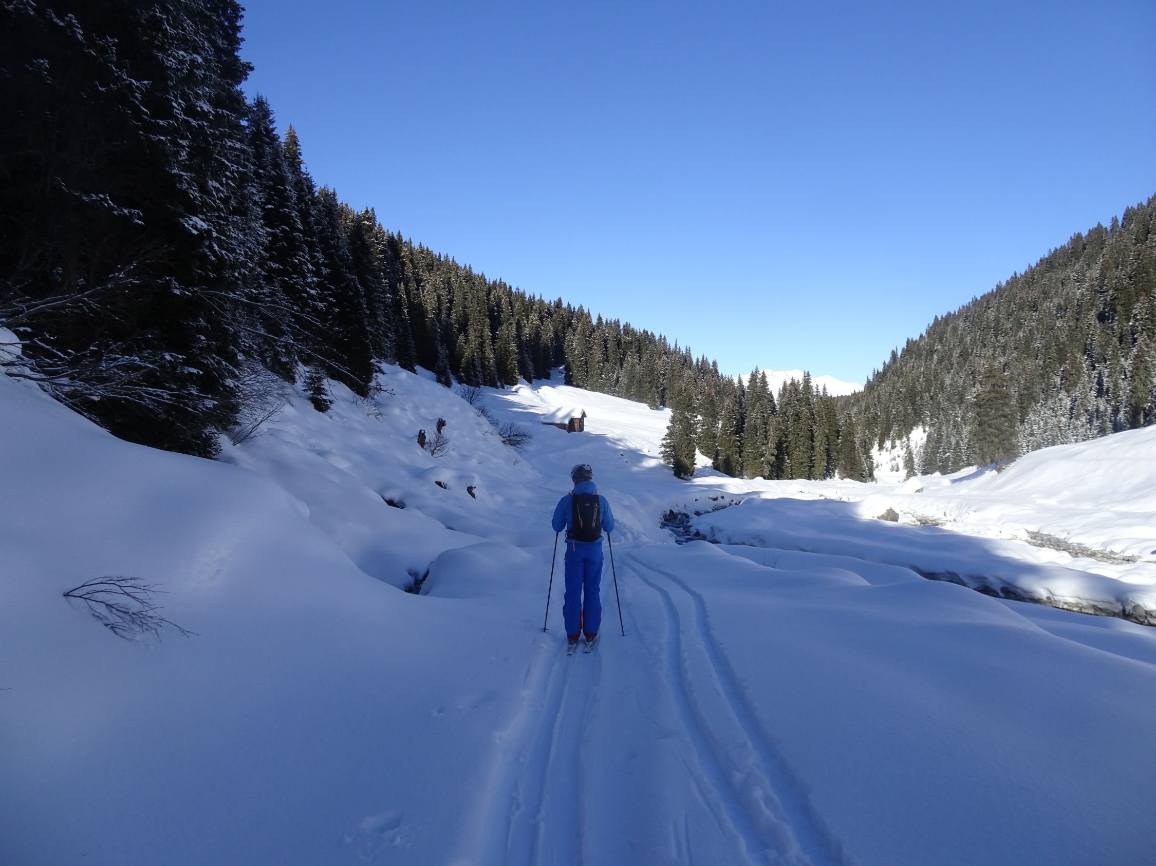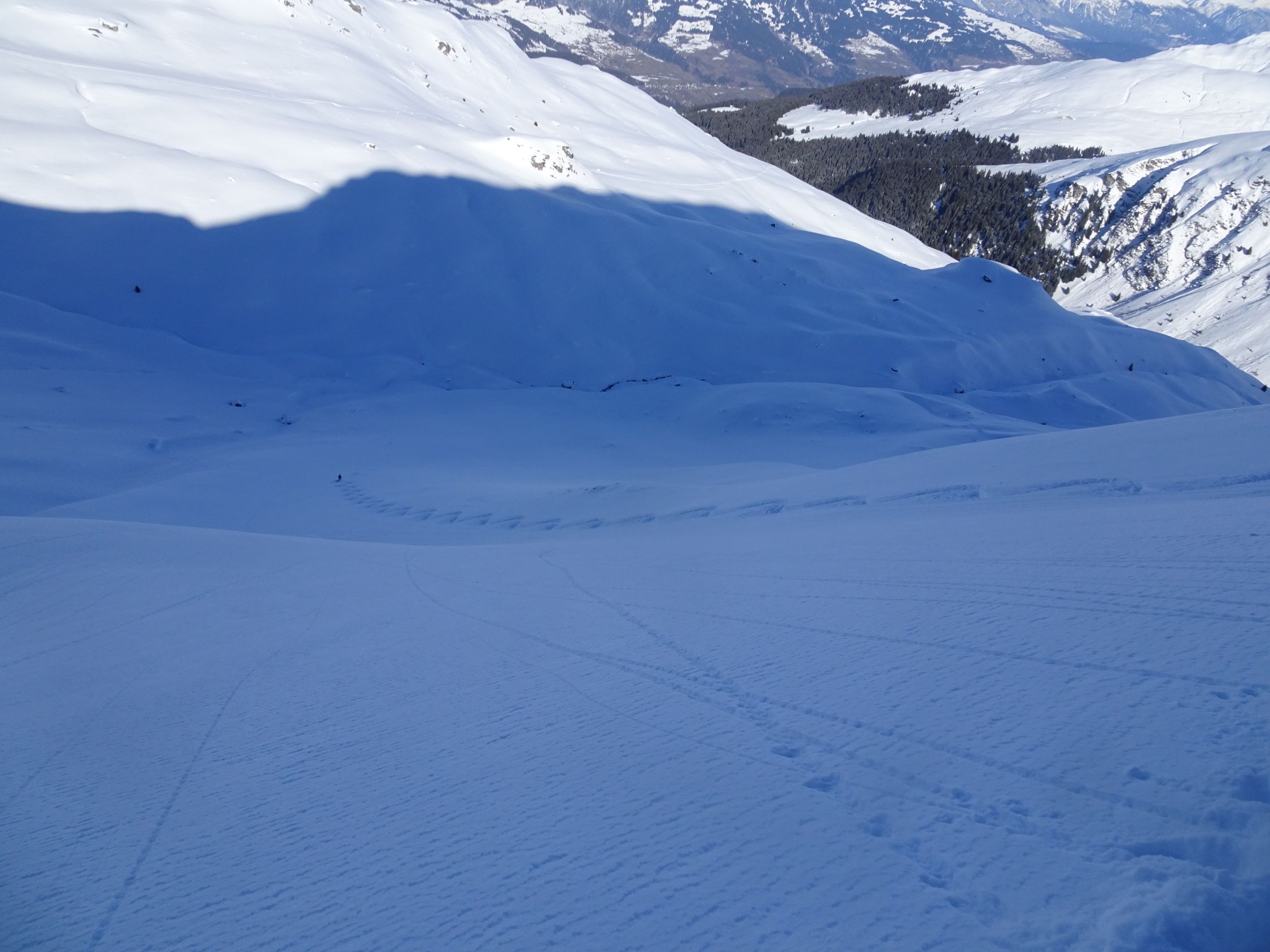 Südöstlich kurze Holperfahrt, dann Pulver vom Feinsten bis zum Talboden und weiter im Aufstieg bis unter die Voderalp zurück.
