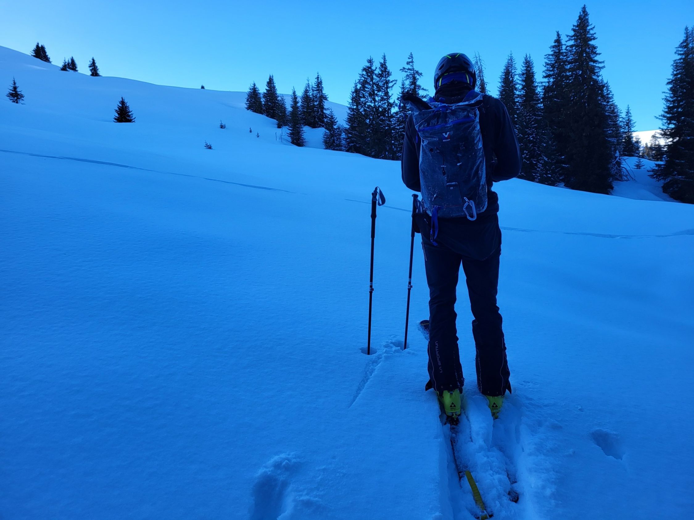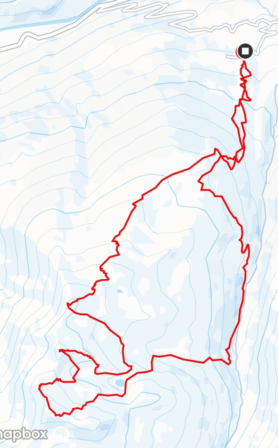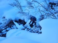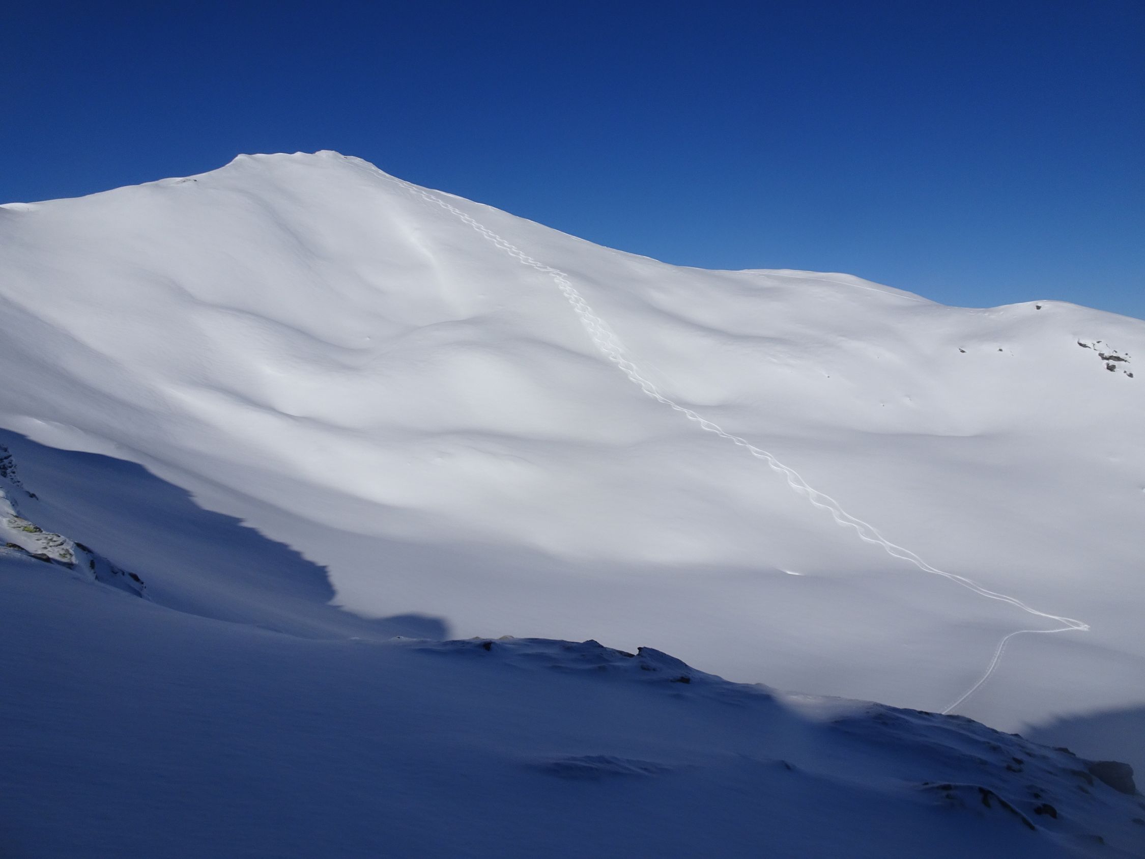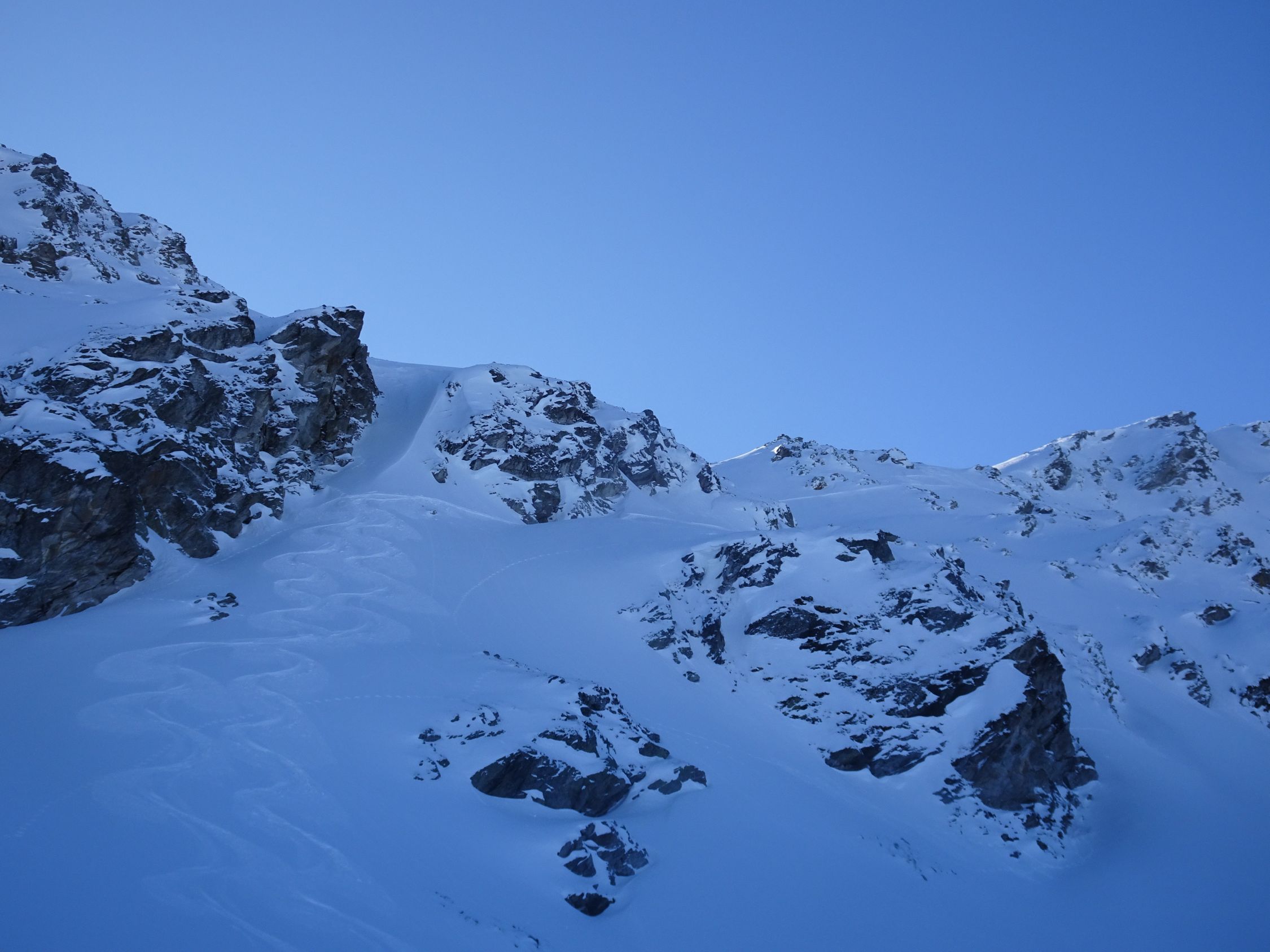 Südöstlich kurze Holperfahrt, dann Pulver vom Feinsten bis zum Talboden und weiter im Aufstieg bis unter die Voderalp zurück.