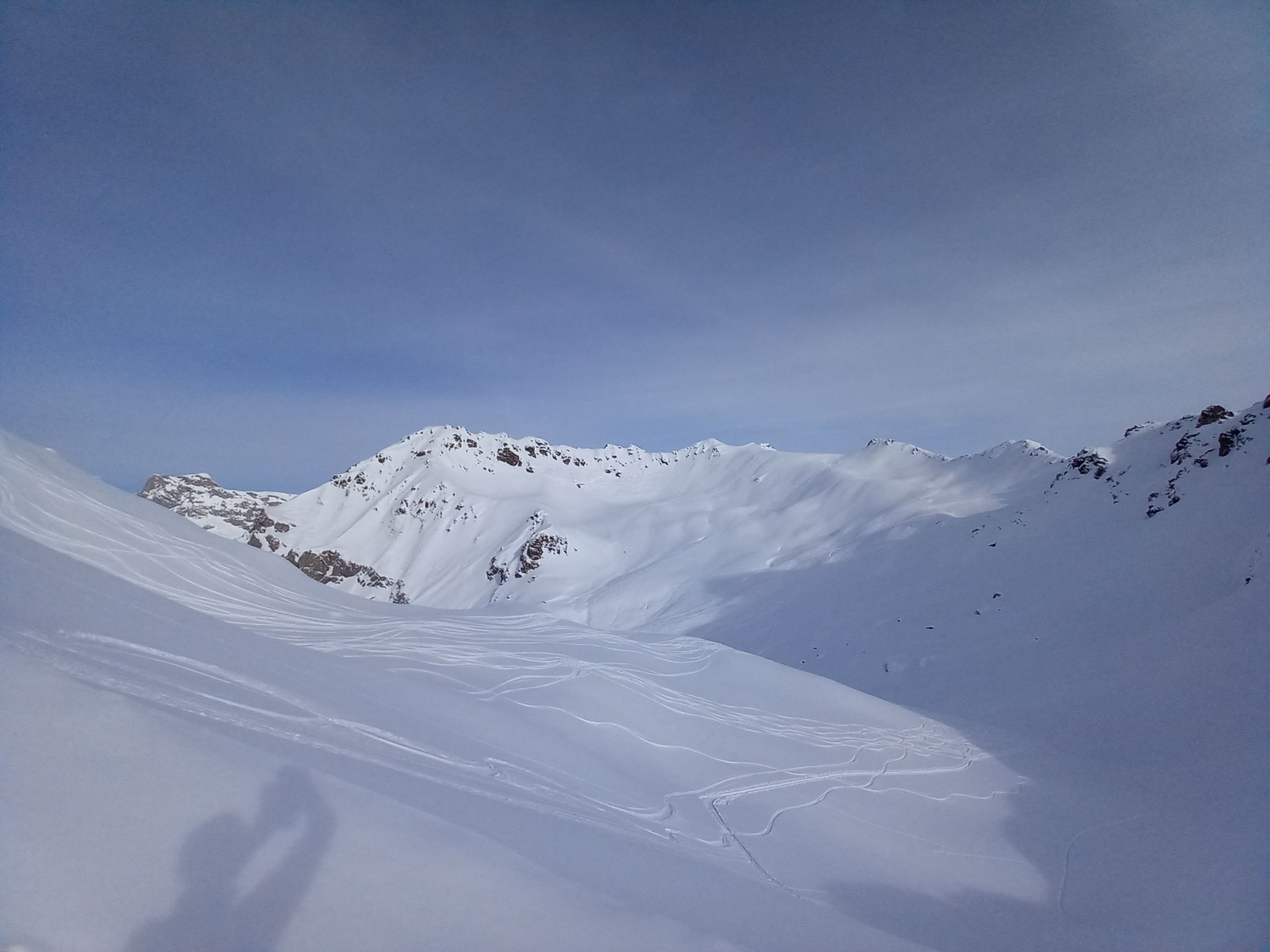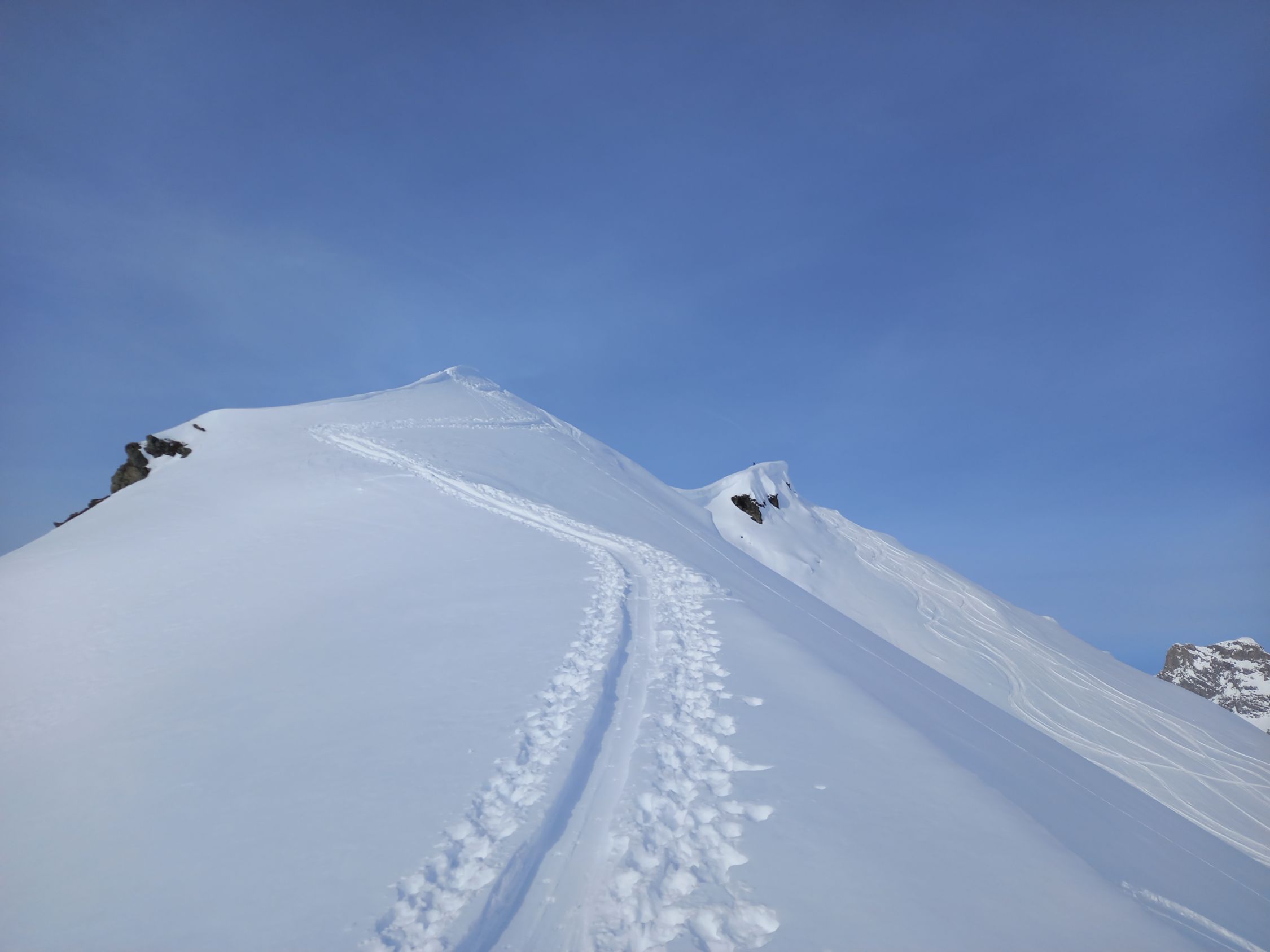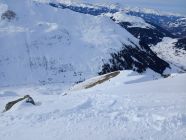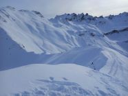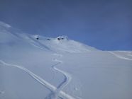 Start um 9:50 in St.Antönien Platz, heute kaum Leute auf dem Posti. Für einmal kein Fussmarsch nach Litzirüti, sondern gleich anfellen und im Gelände bis Meierhof und von dort auf der Strasse/Trottoir nach Litzirüti. Hurtig durchs Gelände hoch nach Engi, über die Brücke und gleich den Hang hoch. Recht gute Spur, ab Püschen kann man oft zwischen diversen Spuren wählen, je nach Temperament und Dehnbarkeit der Achillessehnen ;-) Nach Pkt. 2167 bald rechts abbiegen und in den kleinen Kessel unter der Gämpiflue hinein, schöner Pulver. Die Spur führt angenehm auf den Grat und folgt diesem bis zum Gipfel. Schreckhafte, wie yours truly, verwenden Harscheisen, andere waren ohne glücklich, der anwesende Hund konnte nicht befragt werden. Schöne Rundsicht, windstill. Todesmutige (inkl. Hund) wag(t)en die Direktabfahrt durch die Ostflanke. Die kurze Rutschpartie vom Gipfel in den Hang war yours truly nicht ganz geheuer, daher Einstieg etwa auf halbem Weg des Grates (siehe GPS Track), schöner Pulver, steil, gaudi max! Weiter unten ist alles schon eher verfahren, aber immer noch recht pulvrig, yours truly kann sich an wesentlich verkrampftere Abfahrten in diesem Hang erinnern. Ab etwa Pkt. 1871 wirds dann etwas ruppiger (daher "nur" "gut", Superlative sparen). Nach der Brücke in Engi links weg ins Gelände, bis zum scharfen Rank nach Pkt. 1592 (Obacht: Einstieg in den Abfahrtshang saumässig eisig/rutschig), hinunter zur Brücke bei Litzirüti, auf der Strasse bis Meierhof und im Gelände bis Platz, just in time für das 12:43 Posti.
