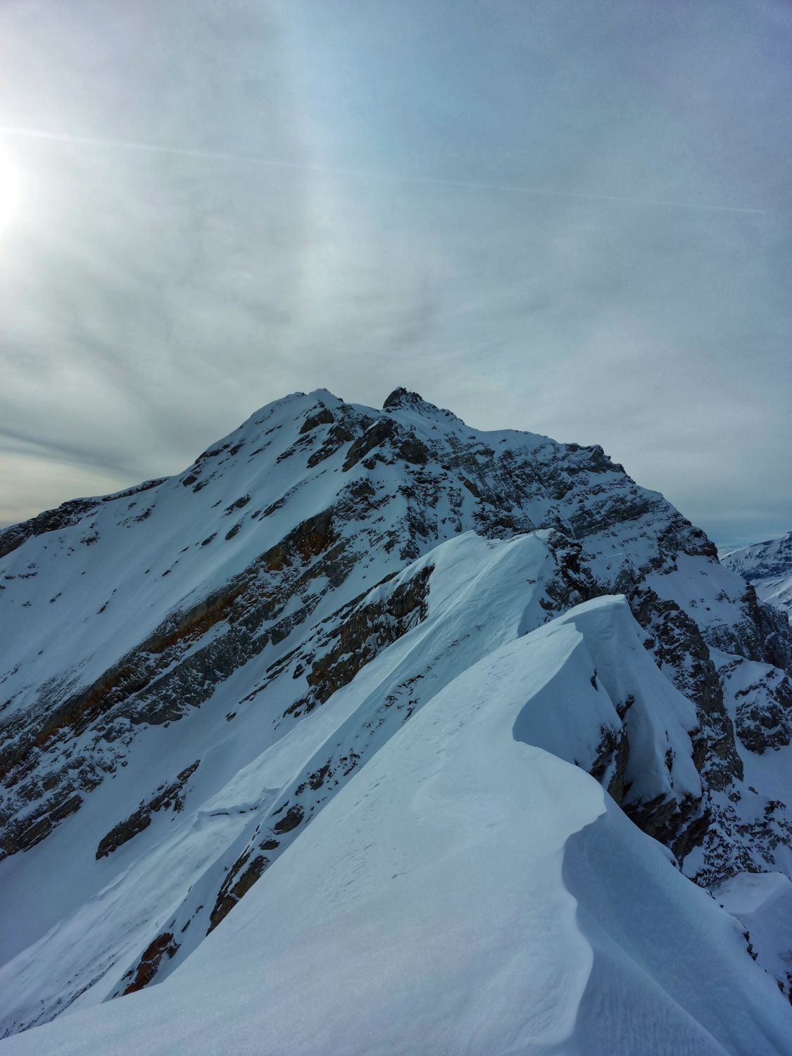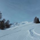 Mit dem E-Bike bis ca 1240m den Alpweg hoch (wäre ab Zalt eigentlich gesperrt wegen Bauarbeiten, es gab jedoch keine Behinderung). Der Route in einer Mulde folgend hinauf zu Mastrilser Alp und weiter bis zum Gipfelhang. Dieser ist wie oft arg zerfurcht. Bis 1900 findet man auf der Abfahrt Pulver, drunter teils übler Bruchharsch. Jedoch gut machbar.