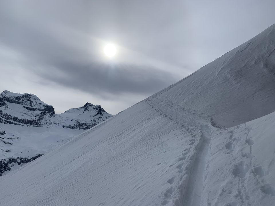 Start am oberen Parkplatz um 7:30 Uhr bei -4 Grad. Unerwartet warm (oder wenig kalt, die Warmluft in der Höhe machte sich bereits bemerkbar). Gute Spur vom Vortag bis zum Glatten (das erste Ziel) - der Dank für‘s Spuren gebührt wahrscheinlich Cornel Suter. Schöne, mit nur wenigen Spuren belegte Pulverhänge. Gute Spur auch auf‘s Raustöckli. Traumpulver bis Boden (~1900 m), dann auf guter, frischer Spur bis Ruosalper Chulm. Die Spur endete am Couloirfuss. Couloir zunächst ohne Steigeisen versucht, die ersten Meter sind jedoch hart und entsprechend heikel. Mit Steigeisen & Pickel dann problemlos. Unberührte Hänge auf der Traverse nordseitig, kein Triebschnee. Gipfel Läged Windgällen eingespurt. Traumpulver in der Abfahrt - Couli ist aktuell für gute Skifahrer fahrbar (Neigung eher 45 Grad).
