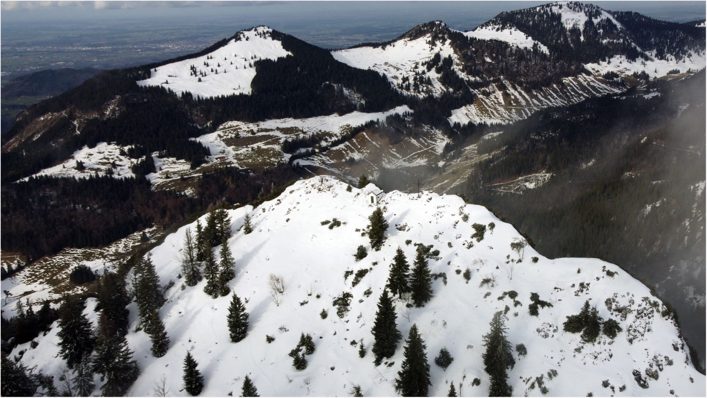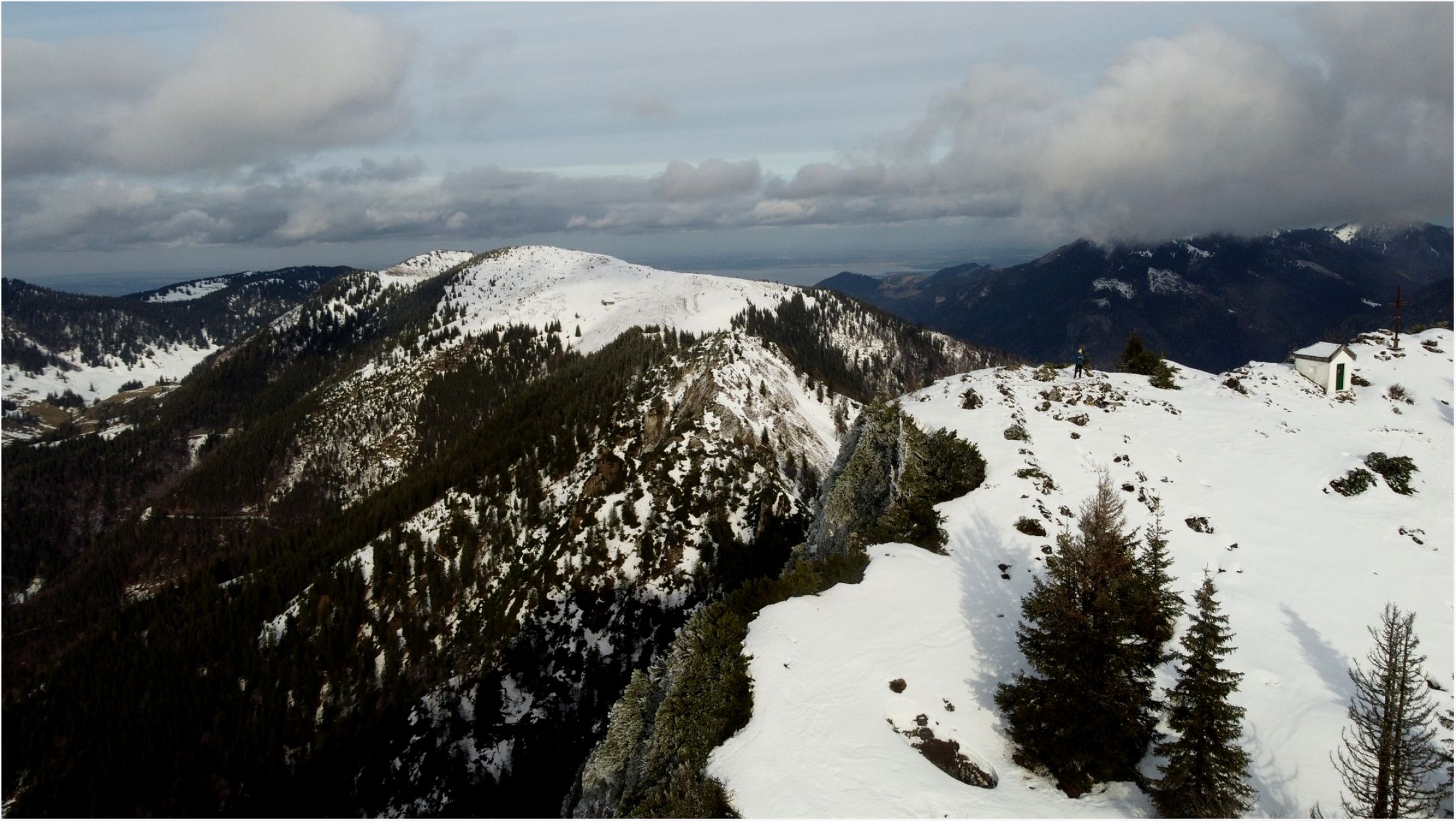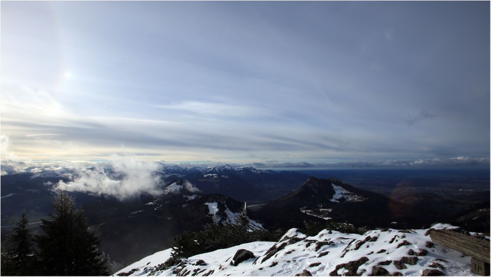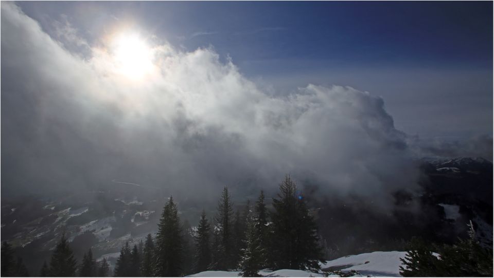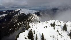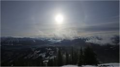 Blick in die Runde: Chiemgauer Alpen generell mit Skiern nicht mehr lohnend, selbst im Zahmen Kaiser sehr wenig Schnee.