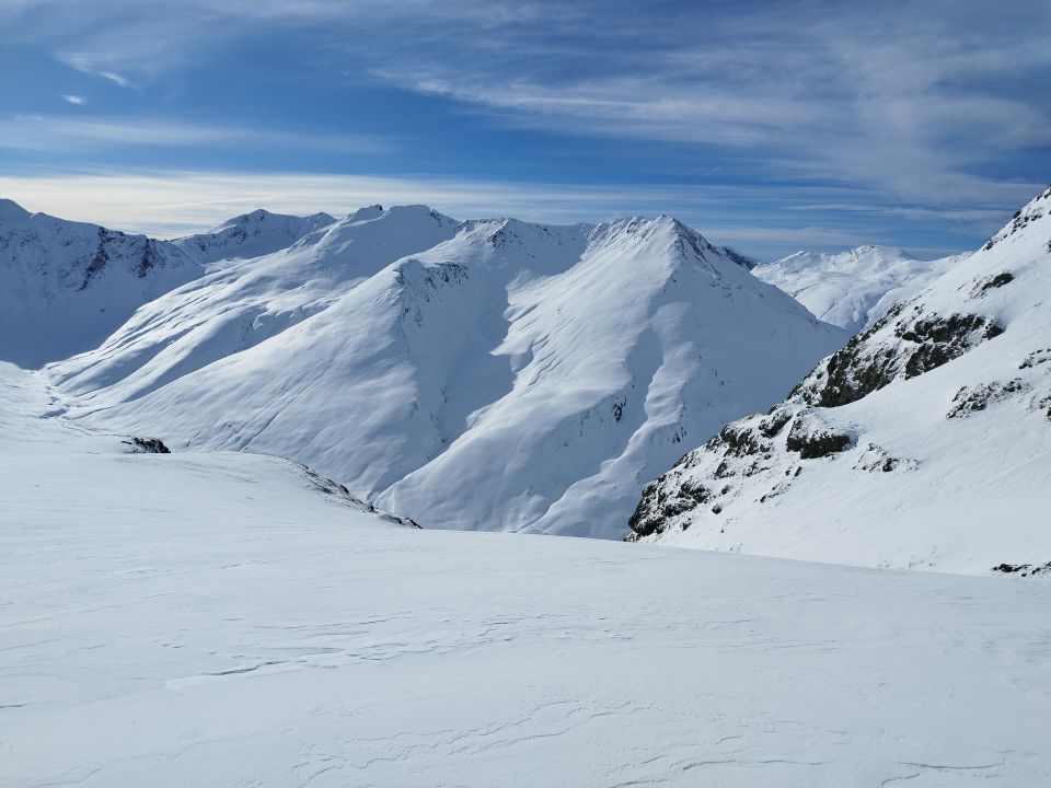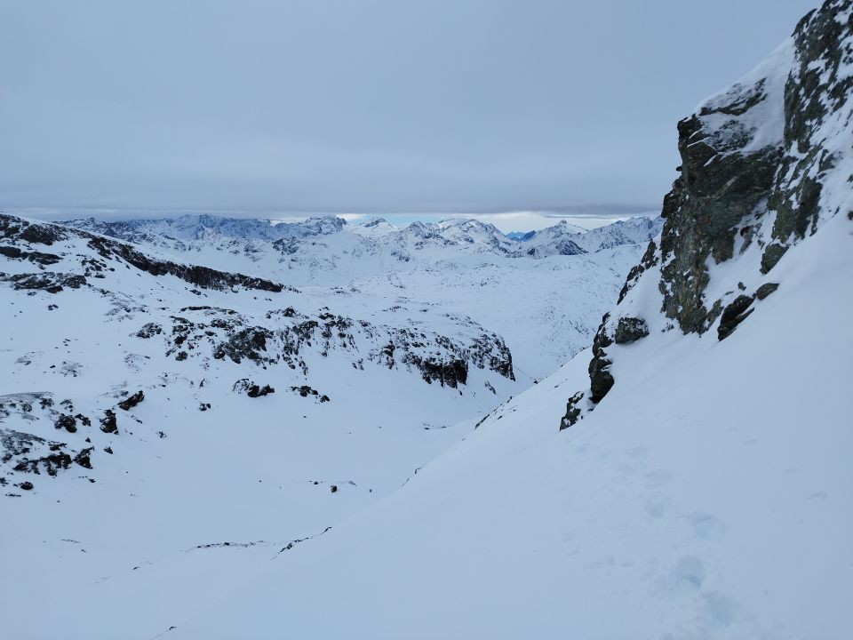 Sonniges Wetter ohne viel Wind beim Start der Tour. Schneedecke tragend. Harscheisen hat es keine gebraucht. In der steilen Flanke zum Südgrat mühseliges hochspuren. Teilweise Triebschnee in der Flanke. Deshalb bin ich zu Fuss weiter was auch nicht einfacher war, da ich oft bis zur Hüfte einsank. Der Grat selber begrüsste mich mit paar Schneeflocken. Auf dem Grat selber über Felsen klettern oder in die steile Flanke des Südgrates queren. Da es sich sehr rasch zu zog entschied ich mich umzukehren und nicht noch Zeit für den mühseligen Aufstieg zu vergeuden. Die Abfahrt war nicht der Kracher da das Licht schon sehr diffus war. Bruchharsch gab es weniger als gestern.