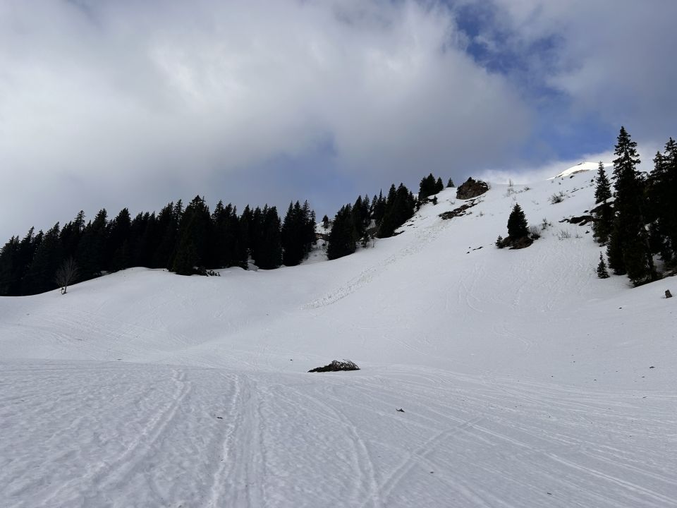 Der Regen von Donnerstag hat die Schneedecke ziemlich durchweicht. Der Schnee war weich, nass und schwer. Ab rund 2'100 m ü.M. (oberhalb Chammhüttli) war der Schnee windgepresst und gefroren. Harscheisen waren von Vorteil. Teilweise Harschdeckel vorhanden.