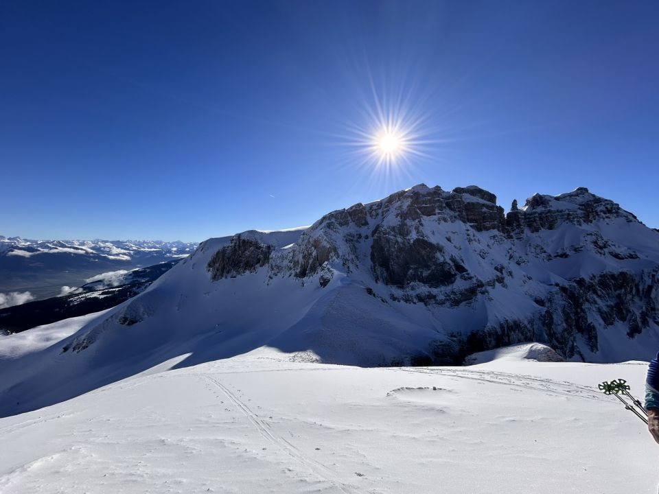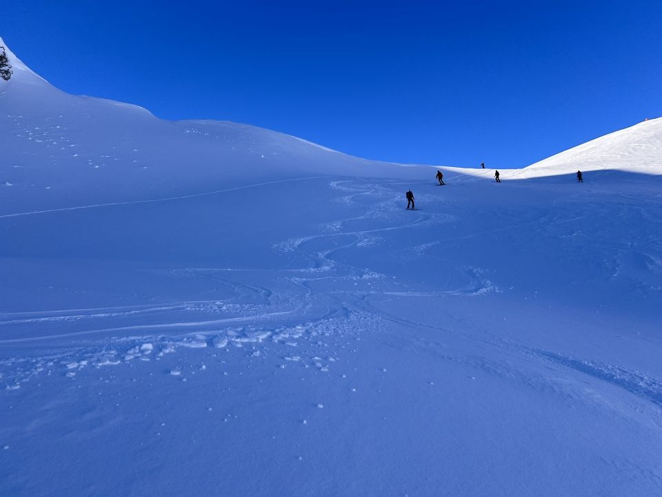 Ab 1'700 m ü.M. gab es Neuschnee, ab rund 2'000 m ü.M. gute Verhältnisse. Die Altschneedecke war hart und zum fahren stabil, was mit dem Neuschnee von rund 5cm gute Verhältnisse schaffte. Ab Chammhüttli bis auf den Gipfel sind Harscheisen zu empfehlen.