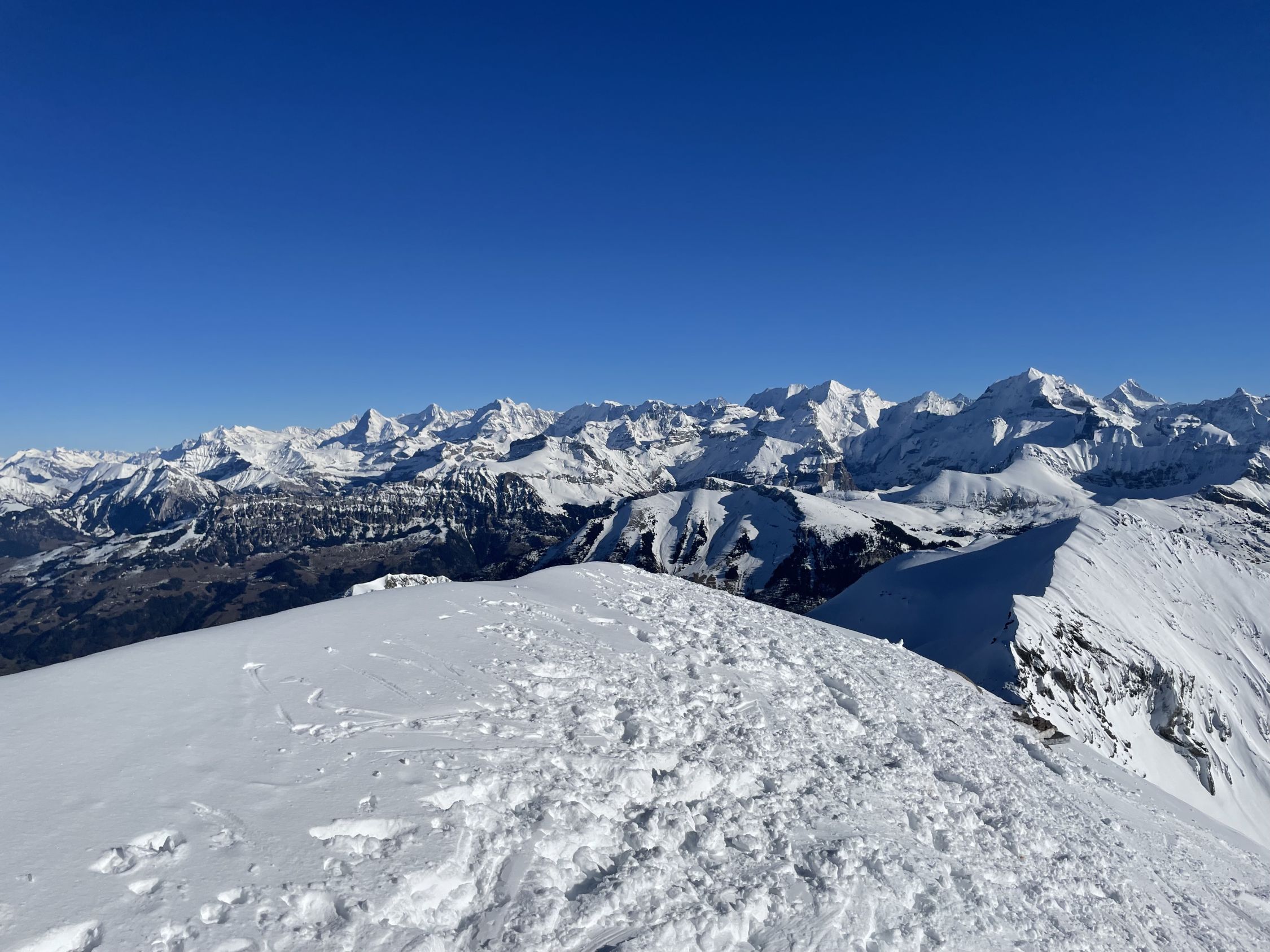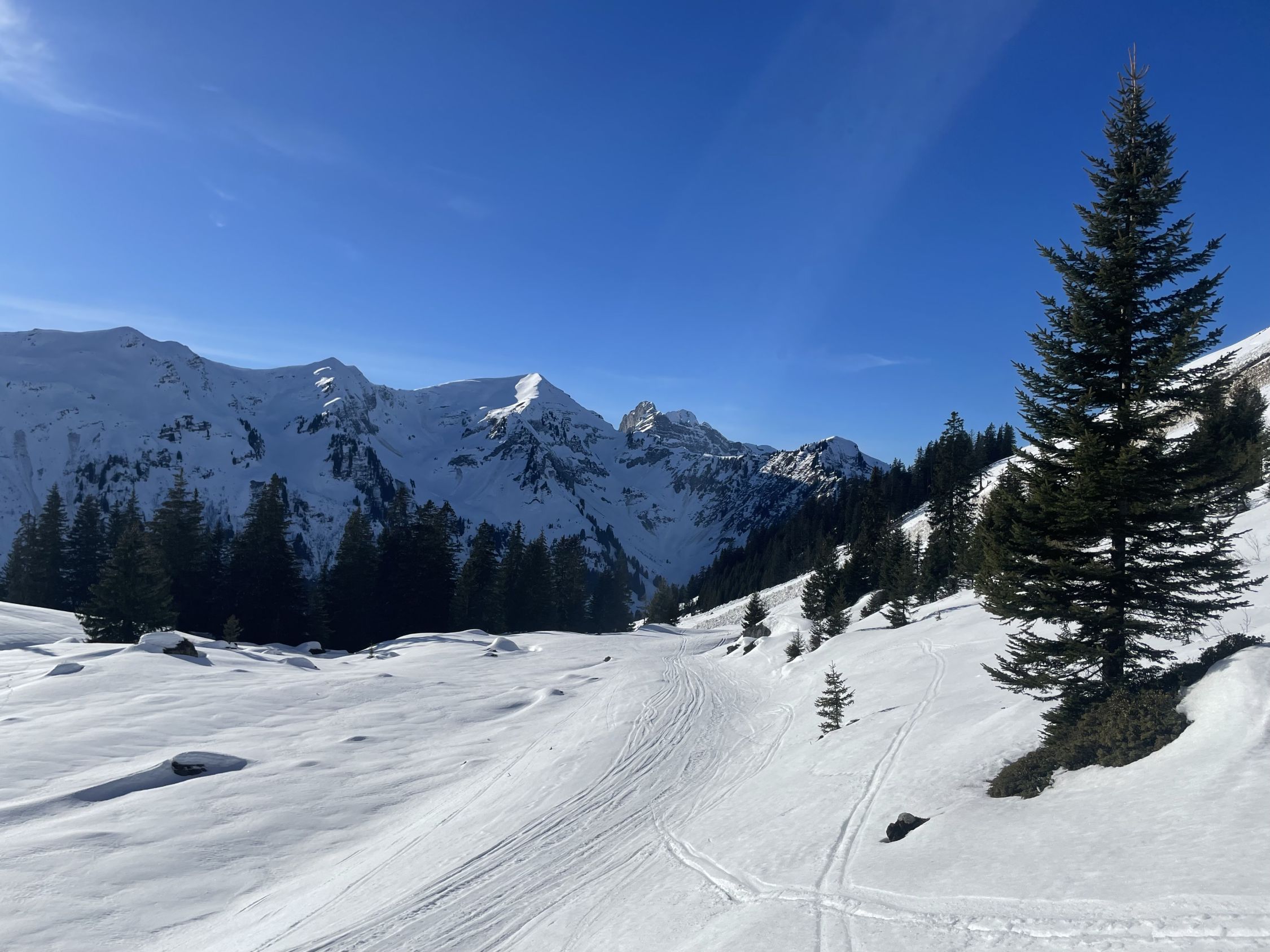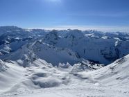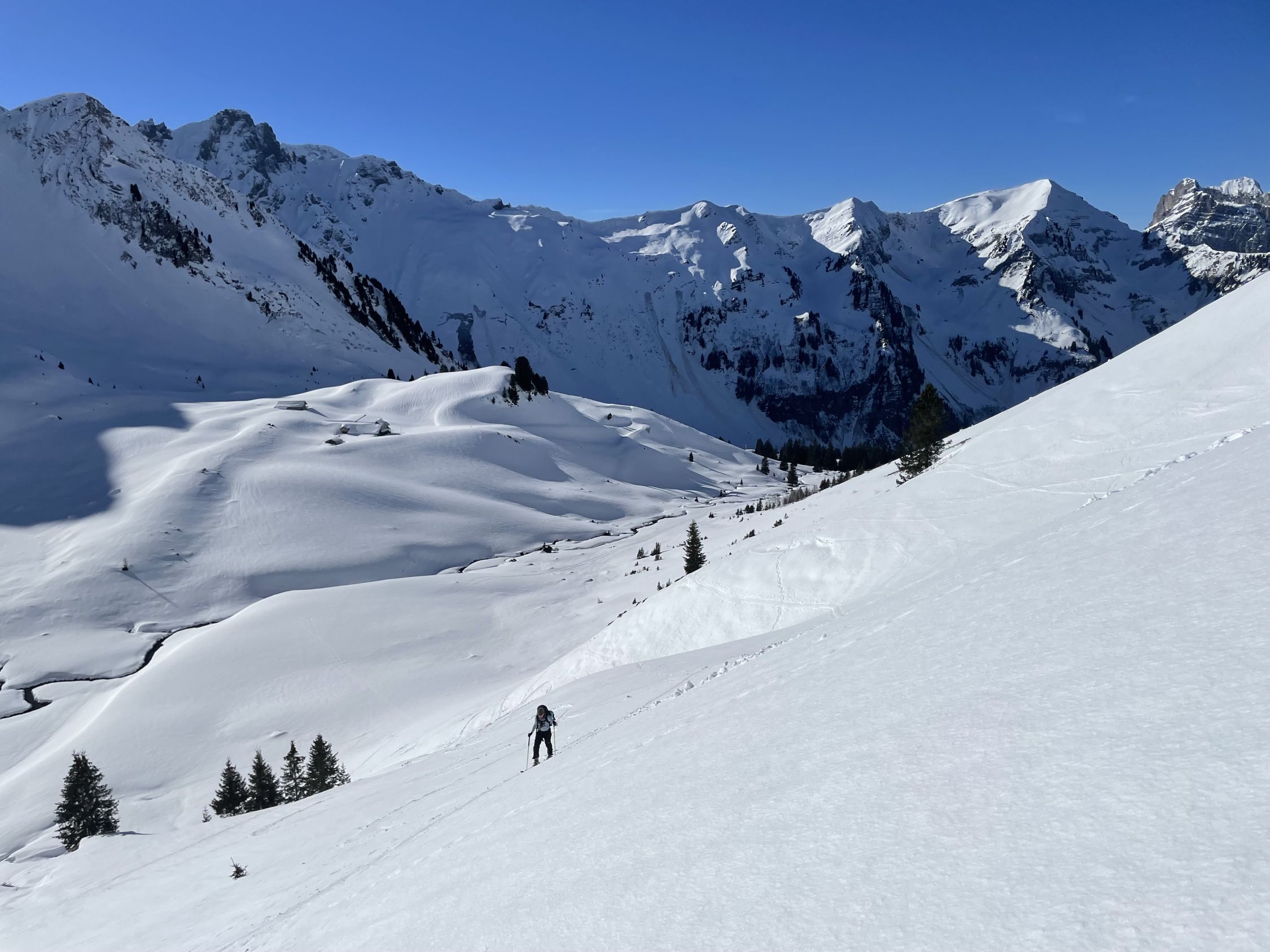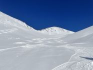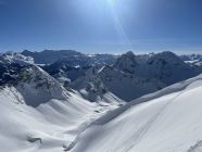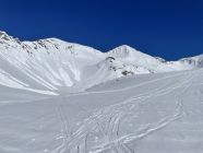 Schnee (mit Unterbrüchen) vom Parkplatz in der Fieldrich, wir haben die Räder bei P. 1390 abgestellt. Der Weg über den Bach (von P. 1557) hatte noch Schnee, für den Bach selbst kurz Ski abgezogen. Gegen Mittag haben die ersten Hänge aufgesulzt, ab 2000 m Pulverauflage, welche aber im Gipfelhang von vorangehenden Tourengängern in der Abfahrt zum Teil abgeräumt wurde, darunter harter Schnee, entsprechend Harscheisen erlaubt, manche haben getragen. Abfahrt war sehr gut, oben mit 5 cm Pulverauflage, teilweise schon aufgeweicht, untern noch Sulz erwischt, unterhalb 1700 m alles hart.
