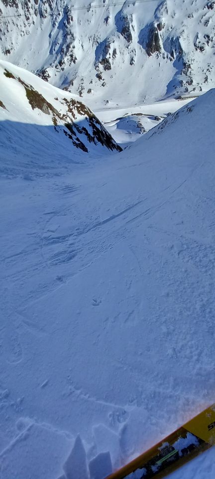 Abfahrt bis in den halben Gipfelhang und nach Süden über den Grat zum Gotthardpass runter. Sehr schöne Rinnenfolge. Firn mit eingewehtem Schümli drauf, tragender Winddeckel waren die heutige Beschaffenheit unter den Ski. Genial zu fahren. Es muss nicht immer Powder sein -;). Abgefahren bin ich ganz allein auf weiter Flur. Eine geführte Gruppe mit Bergführer ist vor mir runter. Einziger Wermutstropfen war die von einer grossen Schneeraupe ramponierte und gefrorene Passstrasse zurück nach Hospental. Niguet für die Stossdämpfer. Für die geniale Abfahrt rückt sowas jedoch in den Hintergrund.
