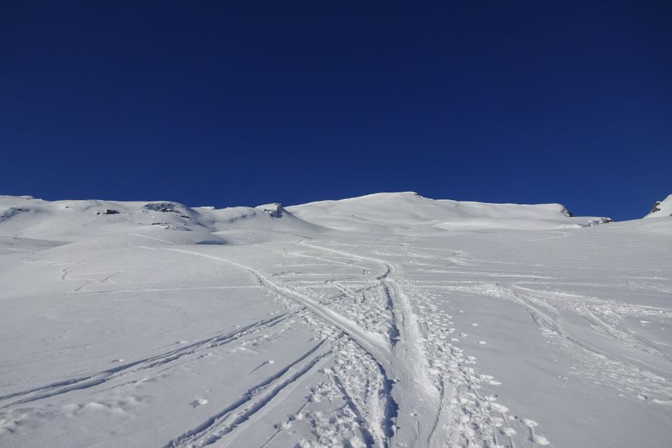 Auf der ganzen Strecke gute Aufstiegsverhältnisse. In der Abfahrt oben deckliger Pulver, der mit vernünftiger Routenwahl aber durchaus schön zu fahren war. Im unteren Teil dann harte Unterlage und deshalb teilweise etwas ruppig. Zuunterst haben Regen und Wärme dem Schnee zugesetzt.
