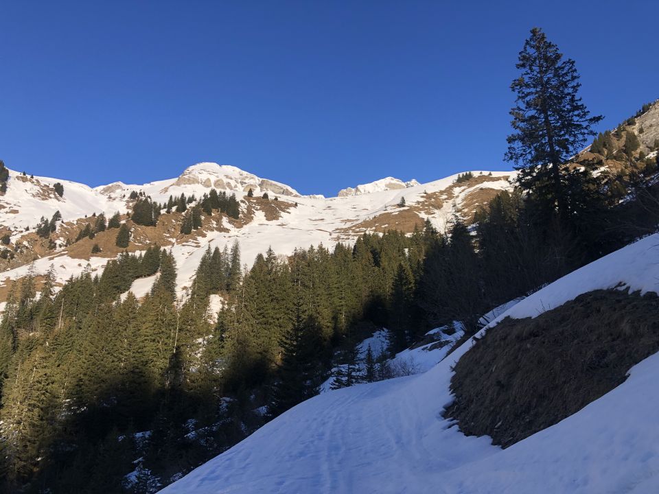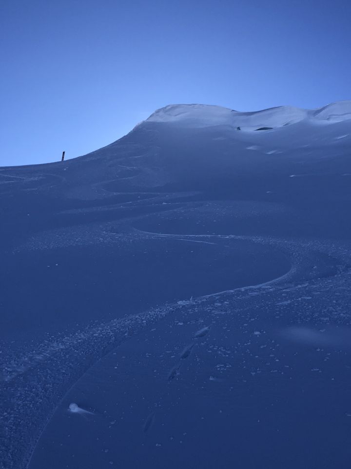 Das Winterhore ist mit einem perfekten Teppich ausgelegt, der ohne störende alte Spuren fantastisch zu fahren ist. In der obersten schattigen Etage vom Gipfel bis zum Ladholzsattel ist dies ein dünnes Pülverchen auf fester, griffiger Unterlage. In der Ladholzchume geht dieses über in samtartigen, feinen Sulz . Auf Ottere und dann weiter hinunter wird es immer frühlingshafterer Sulz.