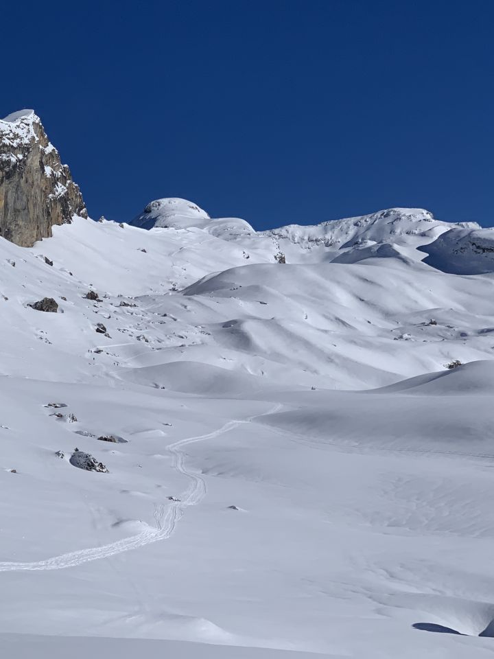 Wir (Splitboarder) haben die Abfahrt Richtung Stöckalp gewagt. Im oberen Teil super Verhältnisse mit kleiner Pulverschicht.