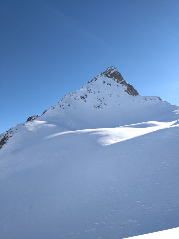 Tour als Skitour durchgeführt. Genügend Schnee ab Seilbahnstation. Bis und mit Couloir unter der Leutschachhütte alles hart. Couloir mit Harsteisen und einer kurzen Portage gut begehbar. Ab Höhe Leutschachhütte wenige cm Neuschnee, etwas vom Wind verfrachtet.