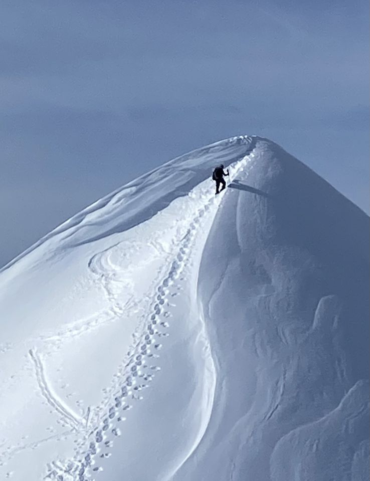 Überraschend gute Verhältnisse - im Aufstieg problemlos auf teils etwas harter Spur (oder deshalb daneben) bis zum Gipfel, überall üppig Schnee, wenige Lawinen der Vortage. In der Direktabfahrt zur Piste teils Pulver unter leichtem Deckel, teils ein wenig aufgesulzt, beides recht angenehm zu fahren. Mehr Sonne als angesagt, am Nachmittag Schleierwolken.