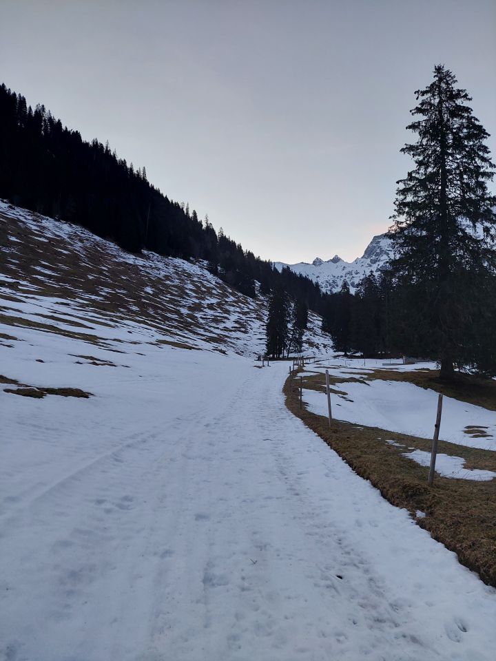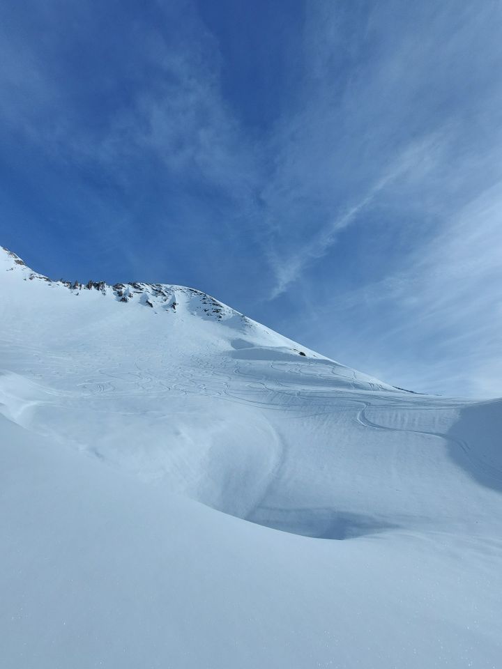 Abfahrt: Der Gipfelhang ist ruppig und sehr hart. Unterhalb querte ich zum Pt. 2416 und fuhr den schattigen Hang, der noch Pulver hatte, hinunter. Von da an bis Mittelberg und Steibode hat es Hartschnee. Man kann noch bis zum Parkplatz fahren.