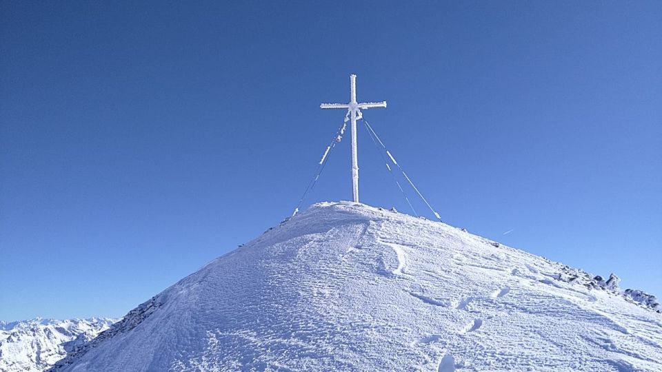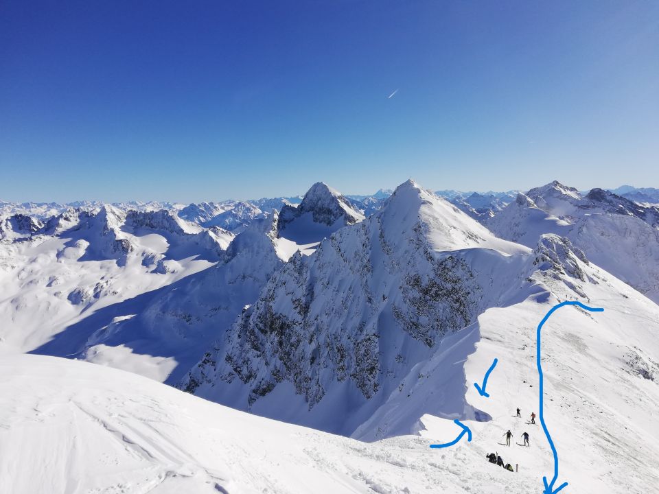 Leider haben wir miterleben müssen wie ein Tourengeher zu weit Richtung rechts ging (Sichtrichtung Gipfelkreuz) und die Wächte ausgebrochen ist und er somit 400-500 Meter abgestürzt ist und leider nur noch tot geborgen werden konnte.