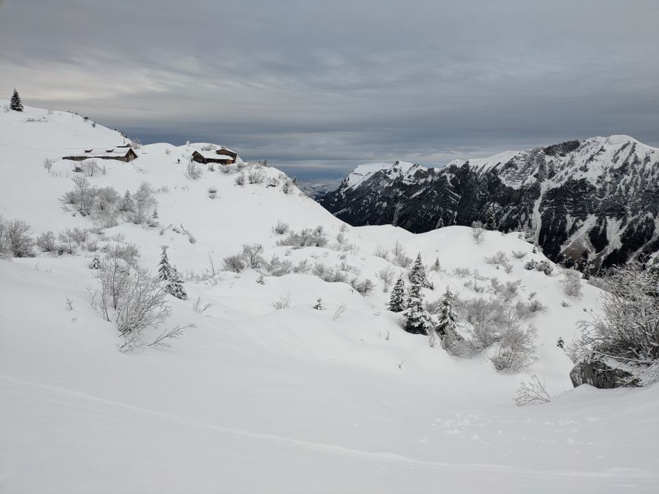 Im Aufstieg war die Traverse unterhalb der Ausläufer des Chaiserstocks (westlich des Punkts 1'976m) teilweise eisig - Harscheisen empfohlen. Auch im Gipfelhang (unterhalb der Drahtseile) waren heute auf den letzten Metern Harscheisen gefragt. Die Drahtseile unterhalb des Blüemberg-Gipfels sind aktuell nicht eingeschneit, die kurze Trage-Passage war daher gut absolvierbar.