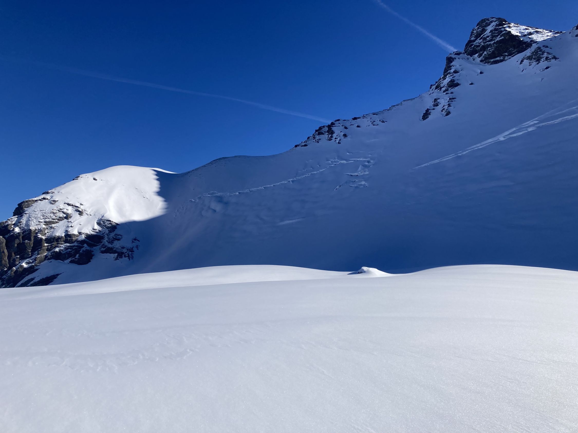 Ab dem Pass aufgrund von vermuteten Triebschnee nicht direkt zum Rossgrat hoch sondern via Schafsätz und Oberalp. ca. Auf 2200 hm umgedreht, aufgrund lauter Setzungsgeräusche.