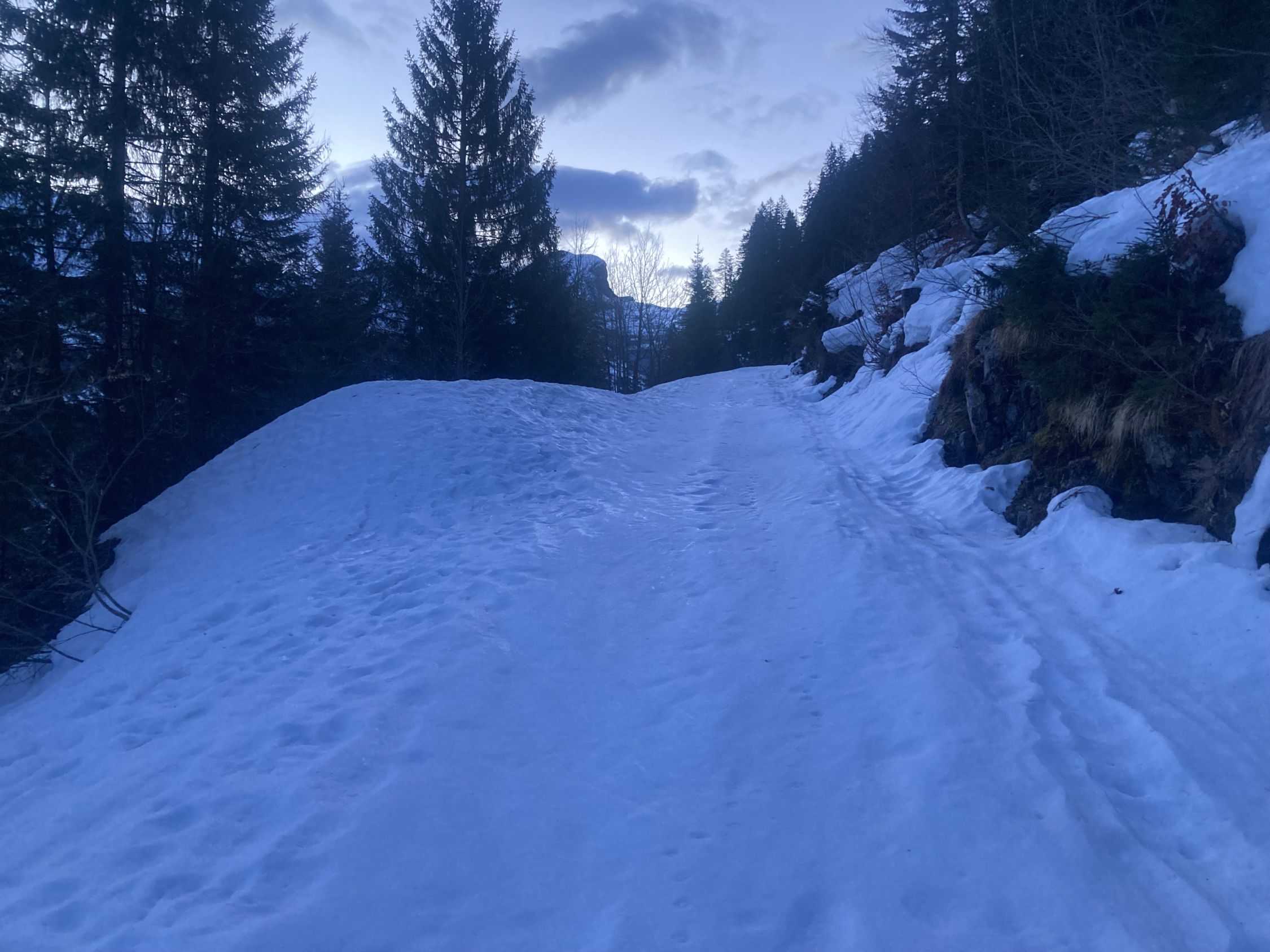 Trotz klarer Nacht war es doch noch zu Warm damit der Schnee auskühlte. Bedingt durch einen frühen Start um 6:30 Uhr gab es keine Stollen bis hinauf Rossbodenegg.