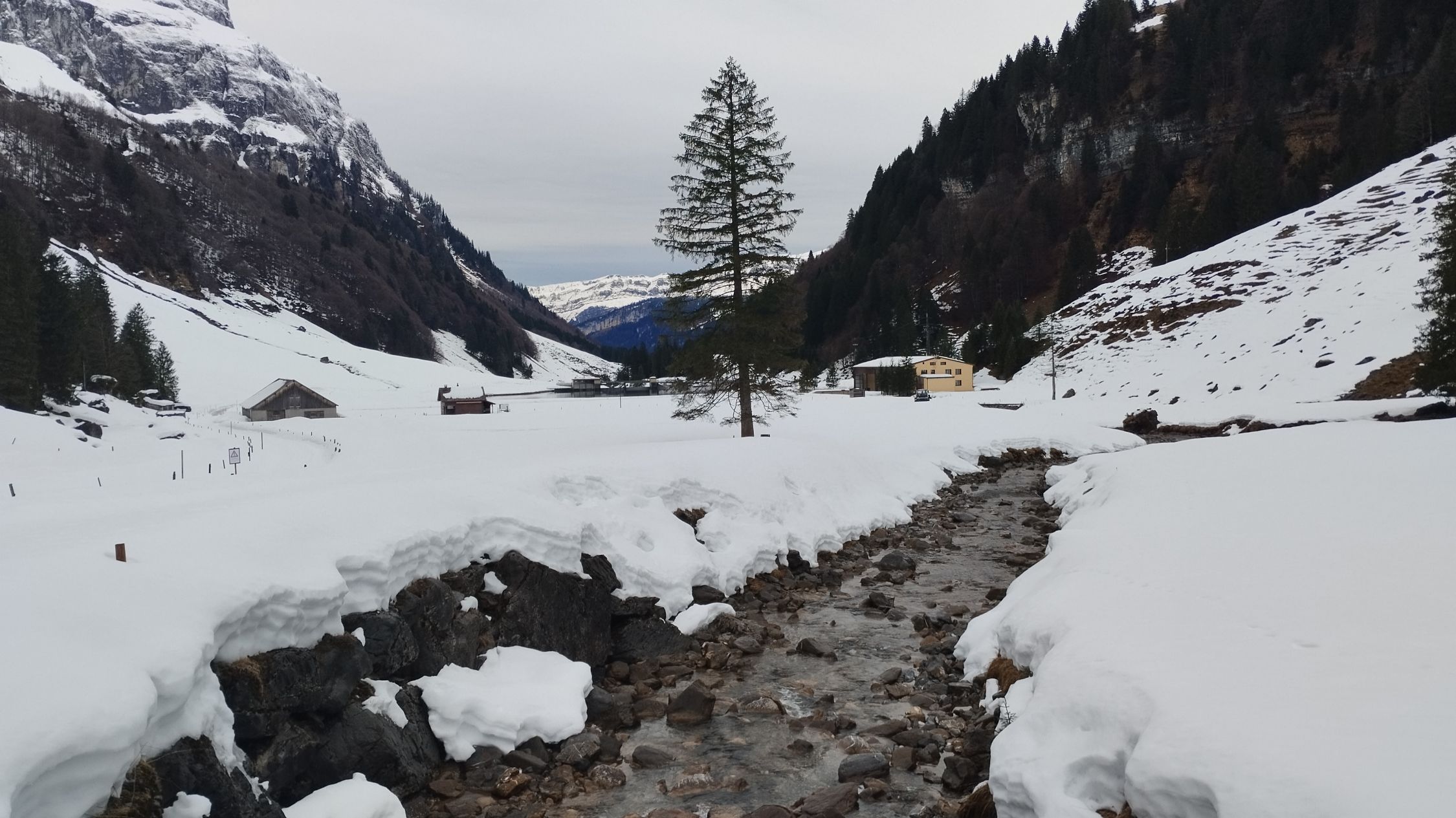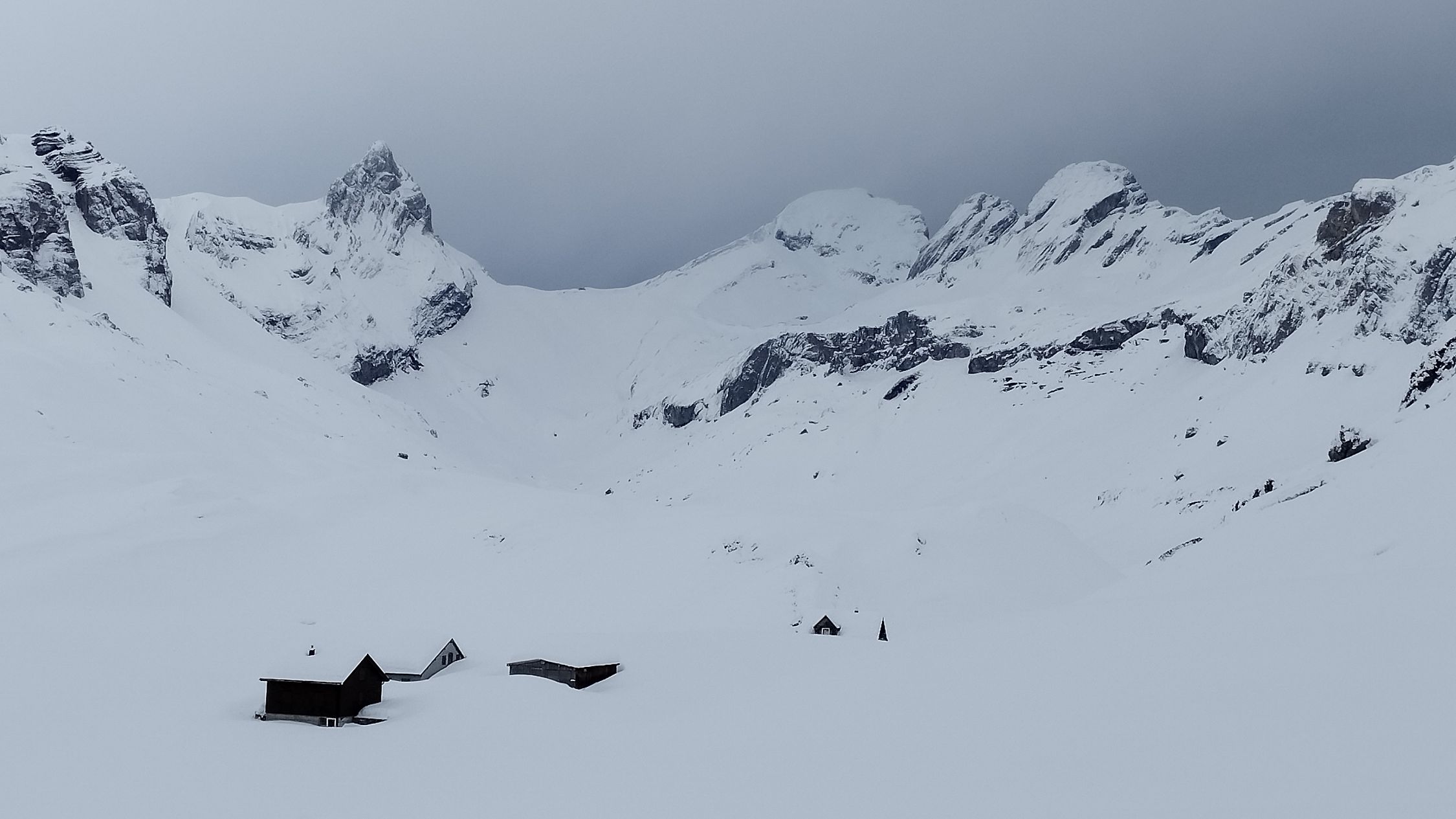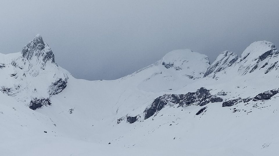 Ab Schwandboden ist die Strasse zwar schneefrei, aber neben der Strasse kann man mit den Skis hochgehen und/oder runterfahren. Ab 1500m dann Neuschnee und starke Stollenbildung bis 1800m. Sali ist immer noch gut eingeschneit. Etwas über 10cm Neuschnee aber sehr pappig. Oben mit starkem Wind bin ich kurz nach 14 Uhr umgekehrt, da ich einerseits zu spät war und andererseits aufgrund der blinden Sicht die Direktabfahrt vom Gipfel Richtung P.2323m nicht zutraute.