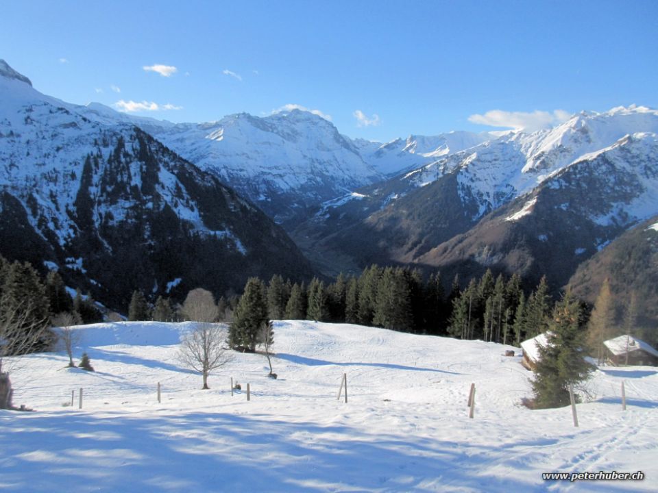 Den ganzen Tag lang hatte es nur wenig Leute an der Bahn, sowohl für die Berg- als auch für die Talfahrt. Strahlend schönes Wetter mit ein paar harmlosen Wolken, warm. Die Skis müssen ca. 20 Minuten getragen werden bis ca. 1400 m. Von Schiben weg durchgehend Schnee. Es hat eine gut tragende harte Unterlage. Ab ca. 1600 m kommen ca. 5 cm Neuschnee aus den letzten Tage dazu. Der Wechsel zwischen warmen und kalten Abschnitten bringt Stollen.