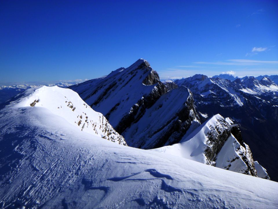 Wanderweg bis rund 1200 m vollkommen aper, nachher etwas Lawinenschnee und unbedeutende Schneeflecken, ab ca. 1270 m ist der Weg schneebedeckt. Ab Strichboden bis zum Gipfel liegt eine dünne Schicht Neuschnee auf der harten Kruste.