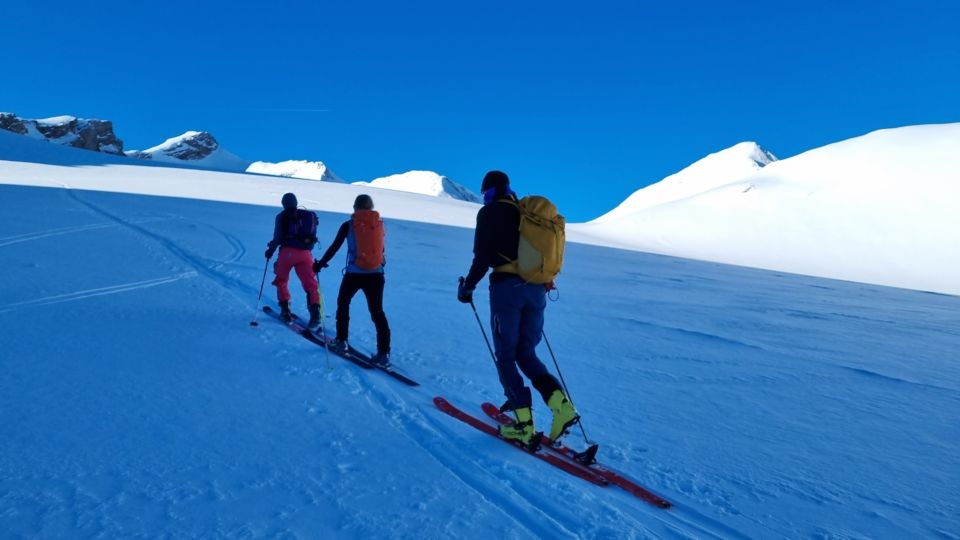 Gute Verhältnisse am Wildhorn. Recht schön zu fahrender Schnee vom Gipfel bis zum Iffigensee. Die Querung vom Tungelgletscher zum Glacier de Téné ist mittlerweilen sehr steil und viel steiler als auf der Karte angegeben. Die Passage erfordert sichere Verhältnisse.