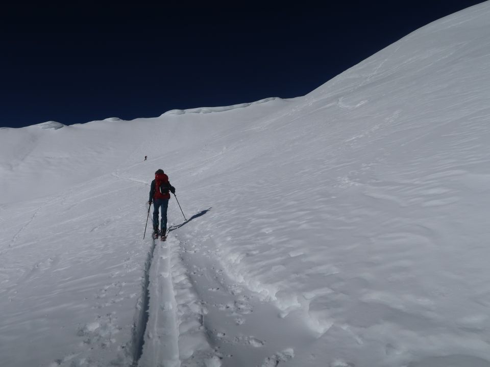 Frühlingstour, im oberen Teile alle Schneearten je nach Wahl der Abfahrtsroute im weiten Tal