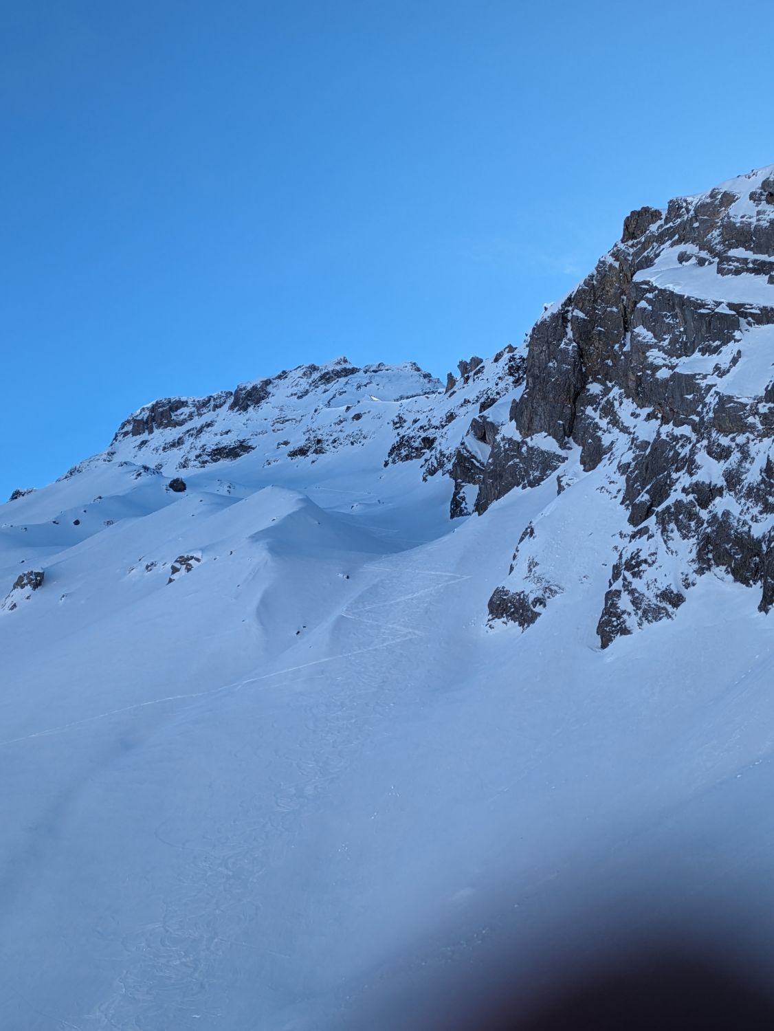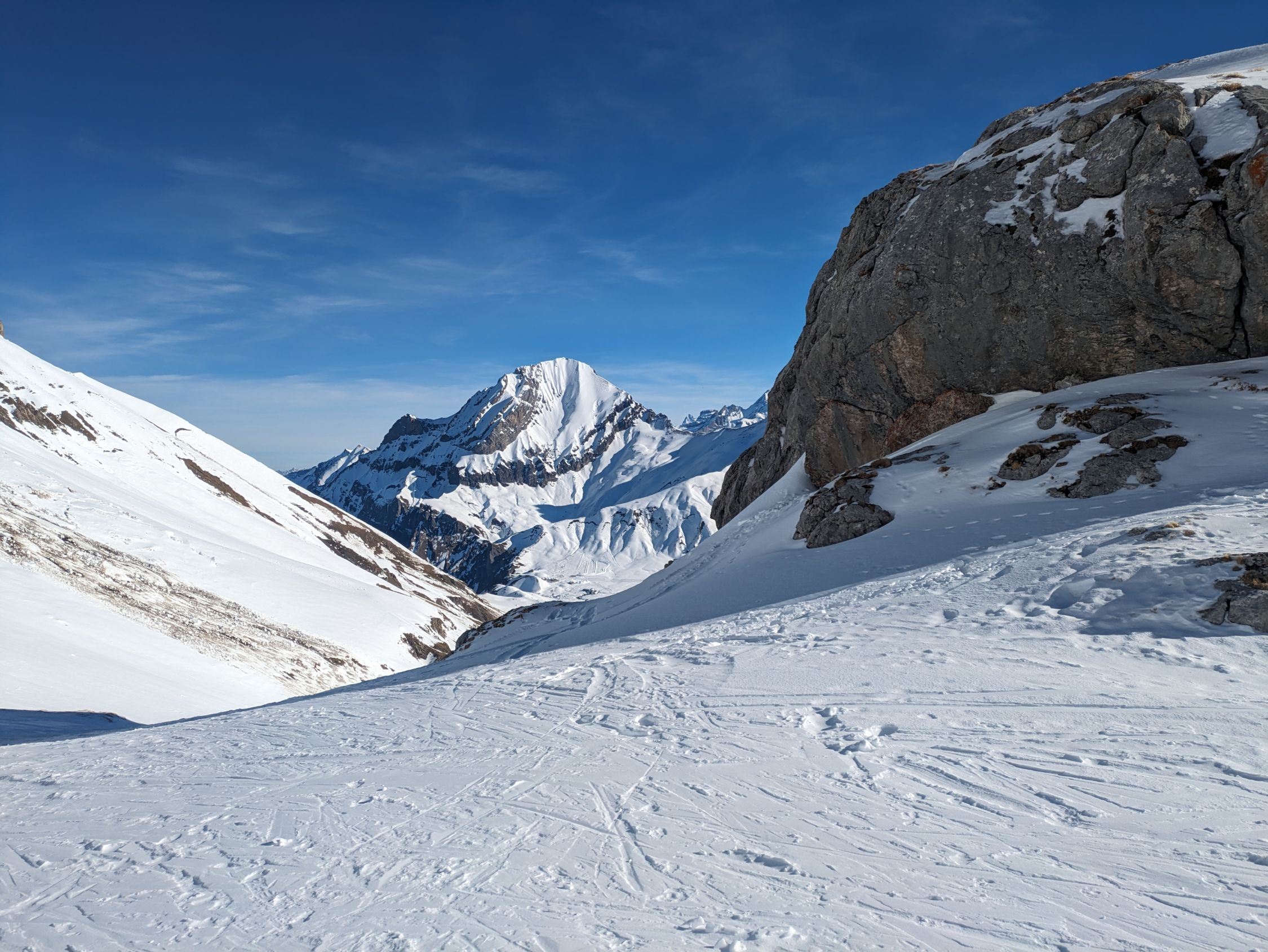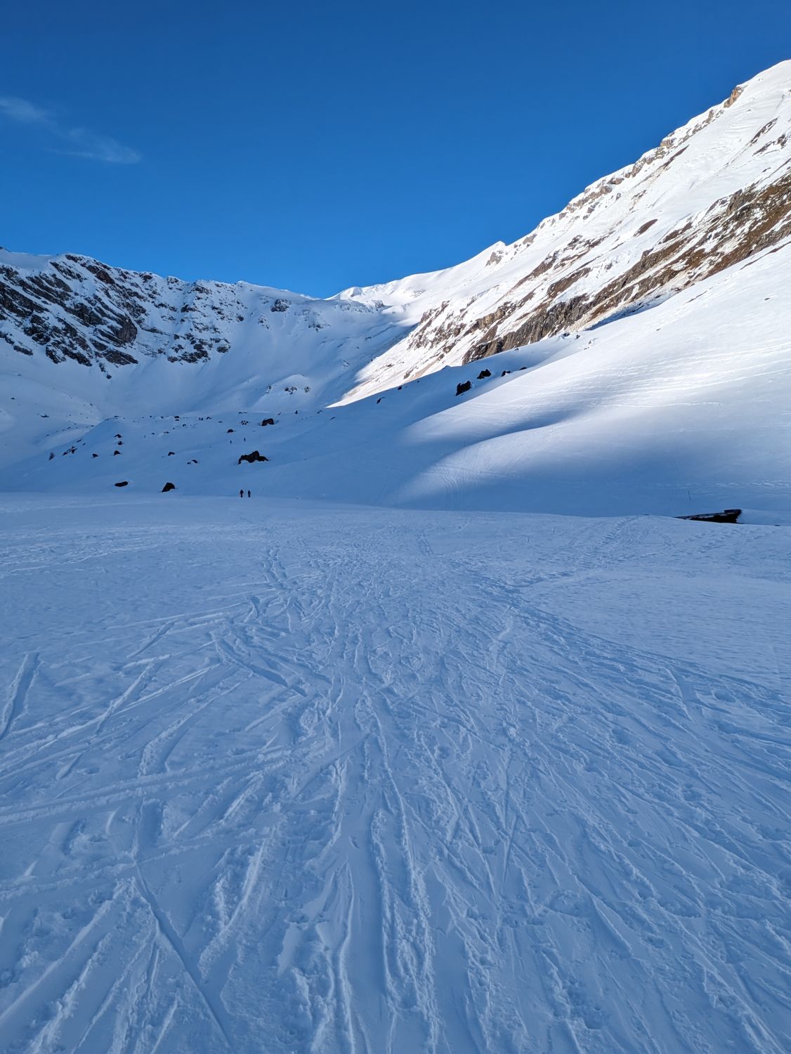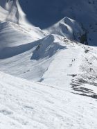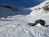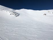 Abfahrt um 12 Uhr pistenähnlich, mit ganz wenigen Pulverschnee-Ecken. Schneebrücken über den Bach existieren (+ halten) zur Zeit noch.